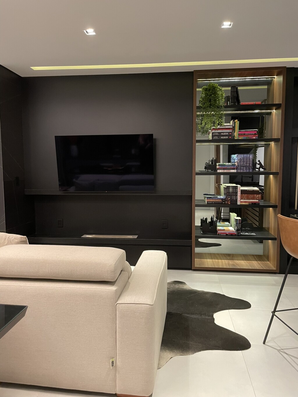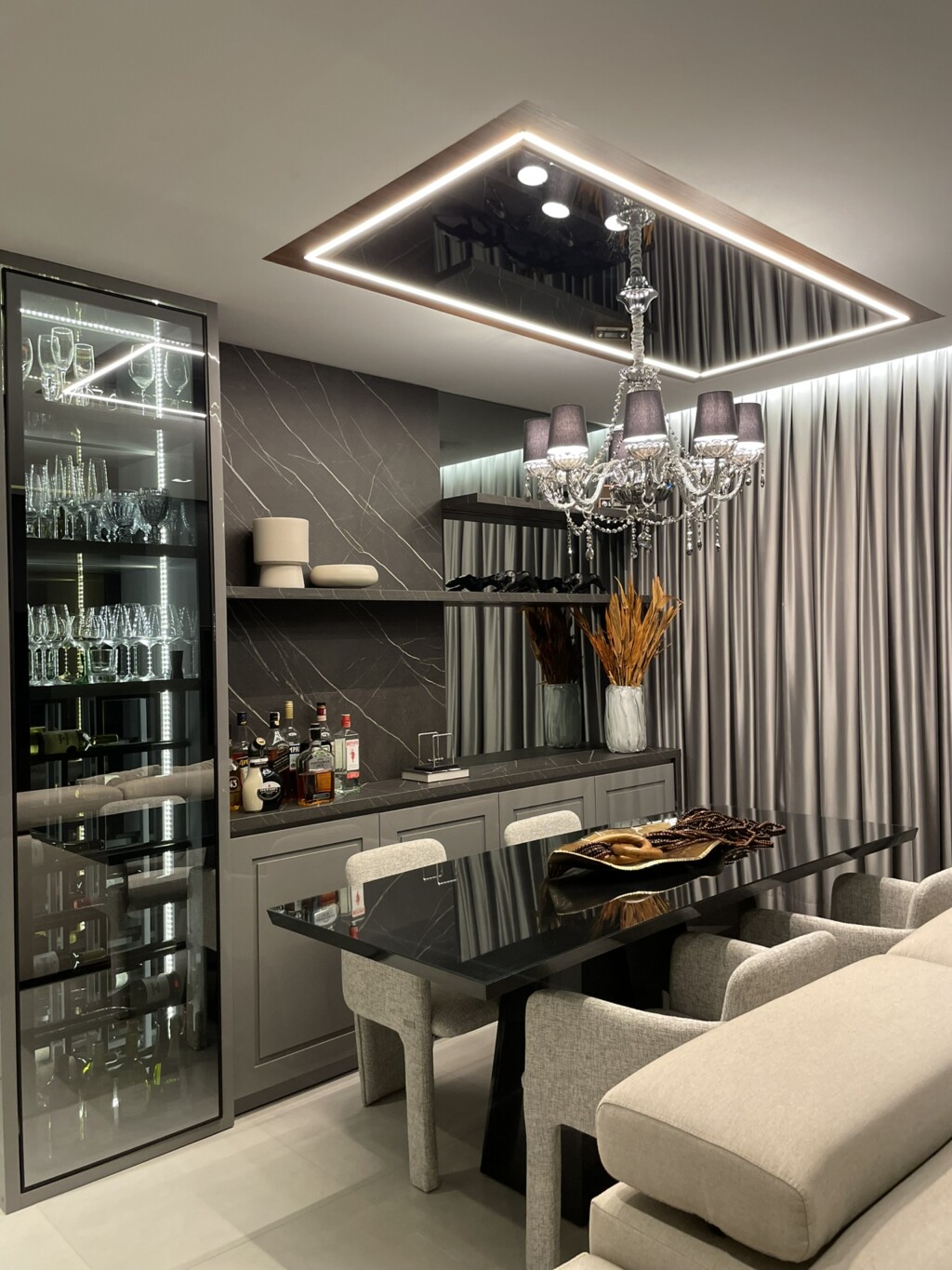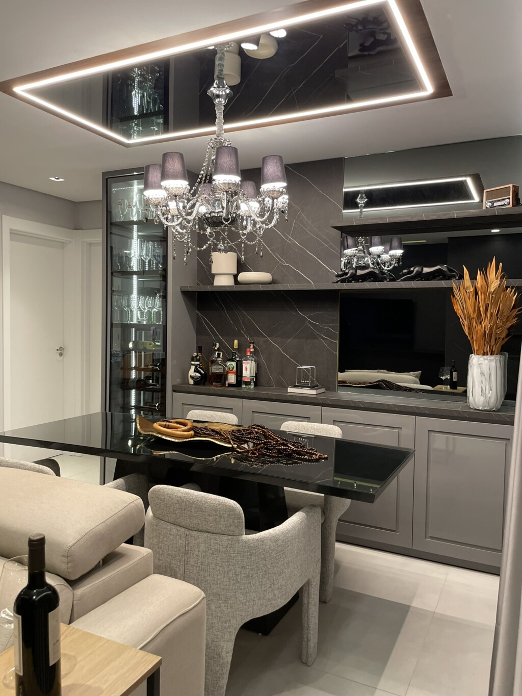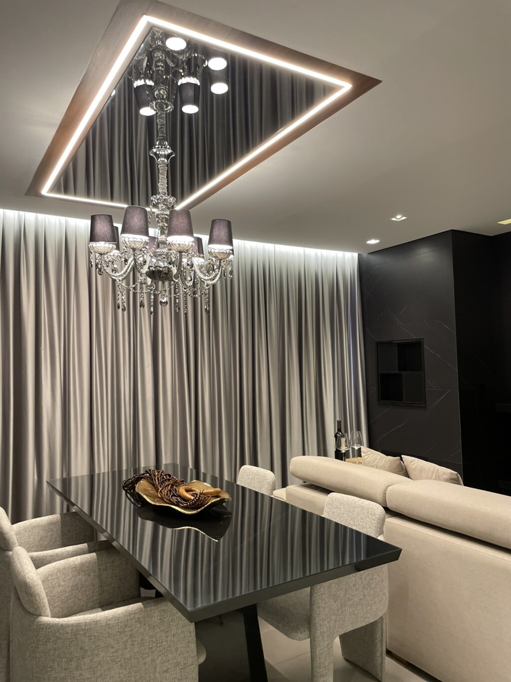 Esse projeto de interiores apresenta um ambiente que une elegância e funcionalidade, ideal para quem busca sofisticação em espaços contemporâneos. O destaque fica por conta da iluminação moderna com sancas de LED embutidas no forro e o imponente lustre de cristal, que traz um toque clássico ao conjunto. As cortinas de tecido pesado adicionam movimento e textura ao espaço.