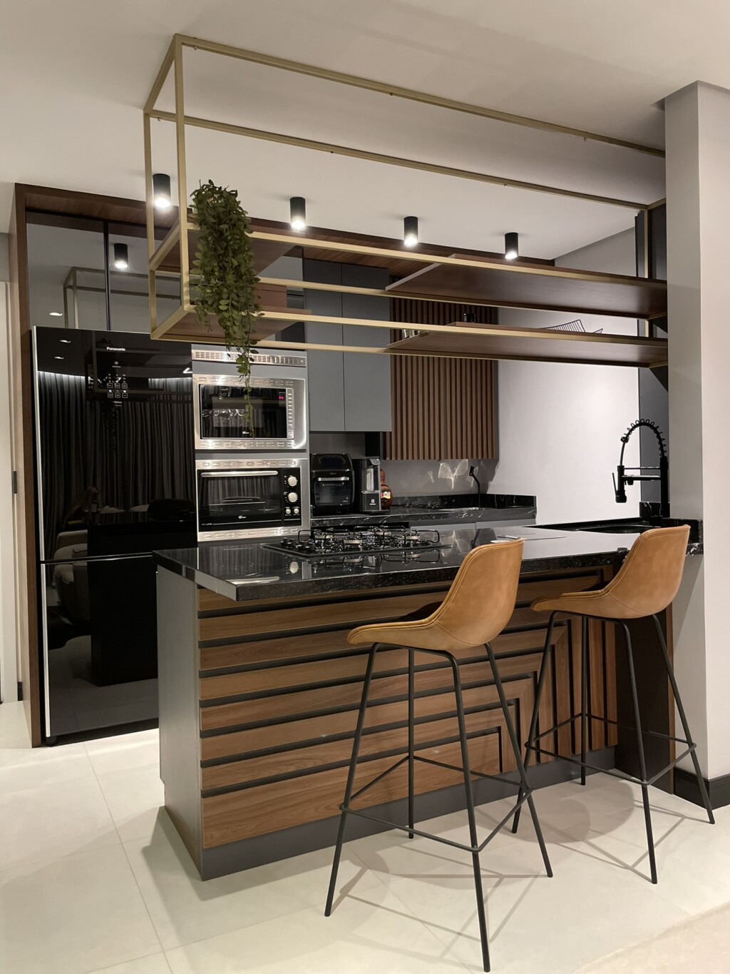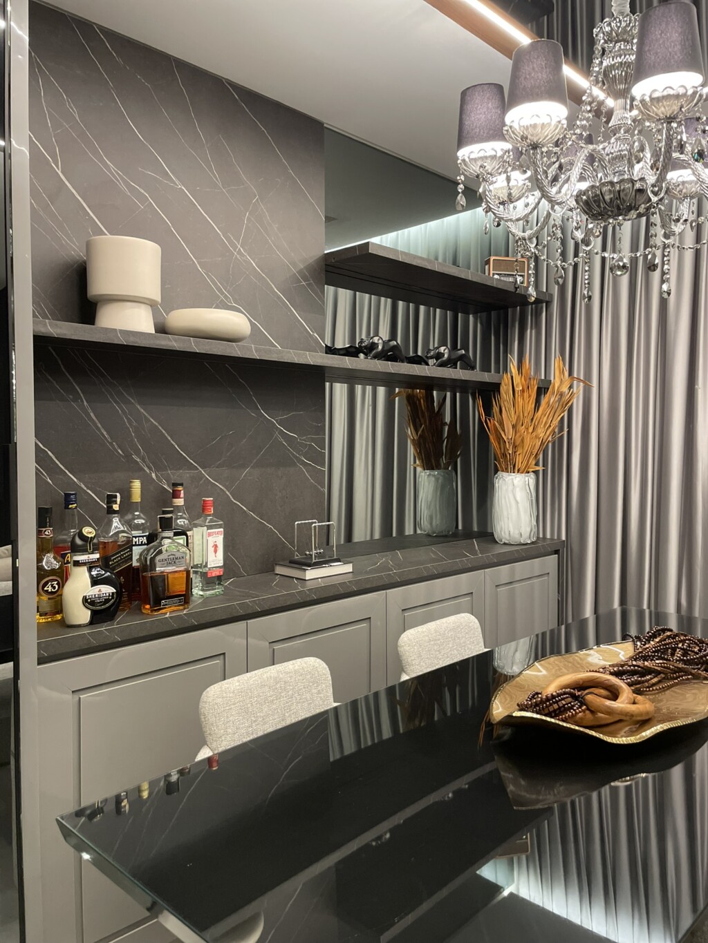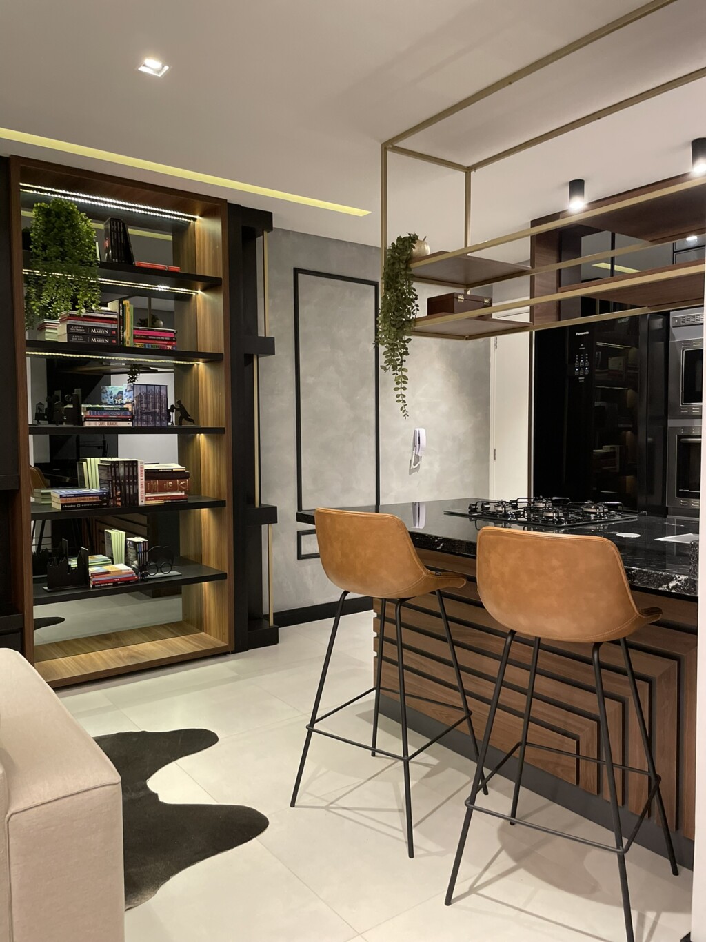 O living integrado com a área de jantar possui tons escuros com toques amadeirados. A escolha de móveis com design minimalista, como a mesa de jantar em laca preta. Atrás da mesa, um bar planejado foi incorporado com materiais de alta qualidade, como o marmorizado escuro, equilibrando a sofisticação com a funcionalidade para receber com requinte. A ilha central, em mármore negro, é o coração da cozinha.