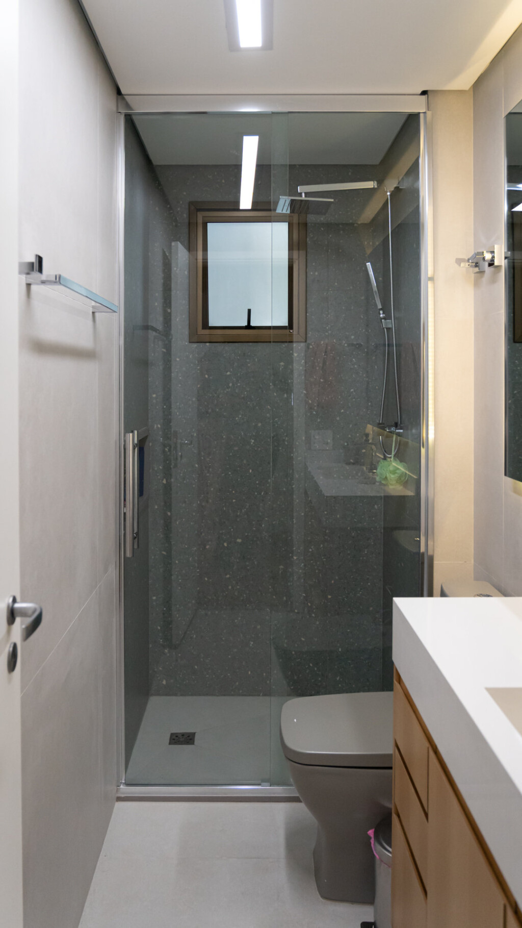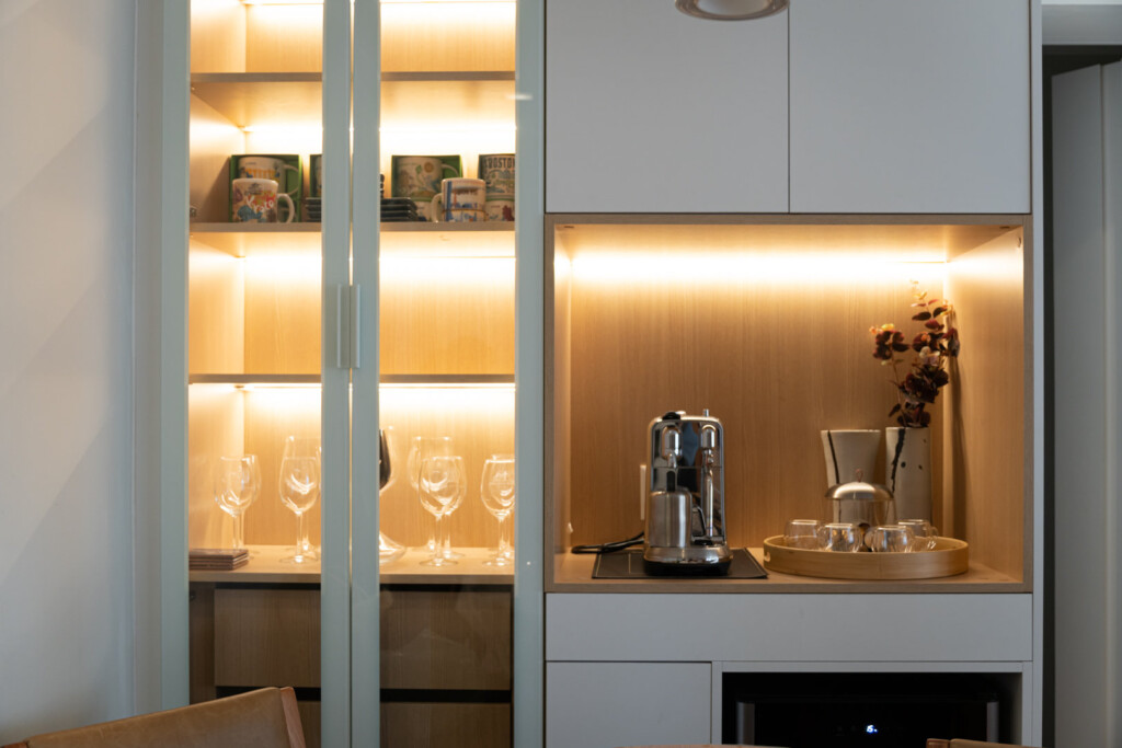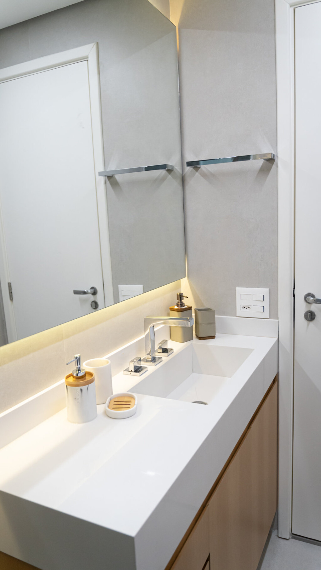 Cada escolha — do revestimento às linhas do mobiliário — reflete o cuidado em equilibrar forma e função. A paleta neutra e os acabamentos elegantes criam uma base serena, onde a arquitetura respira e valoriza a luz natural. Essa composição reforça o estilo de vida dos moradores: prático, elegante e com uma forte conexão com o bem-estar.