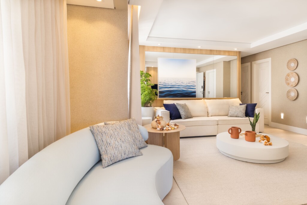 Além disso, as cores foram um ponto prioritário para a elaboração do projeto, onde tons neutros com pontos azuis para deram cara de praia, junto com a cor areia em pisos e revestimentos, quadros e almofadas azuis.