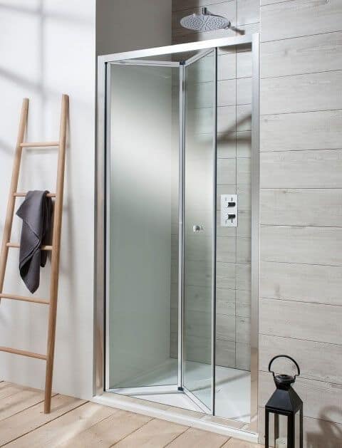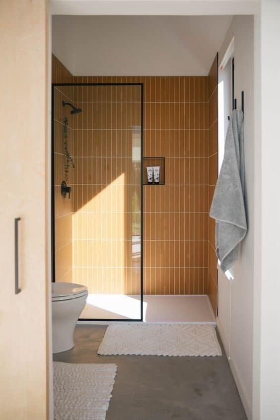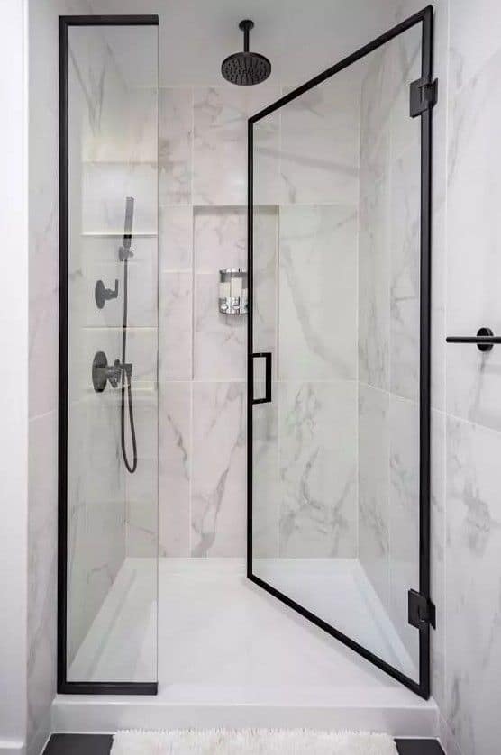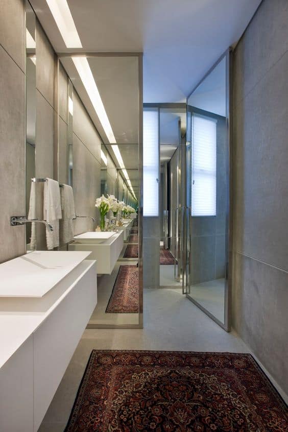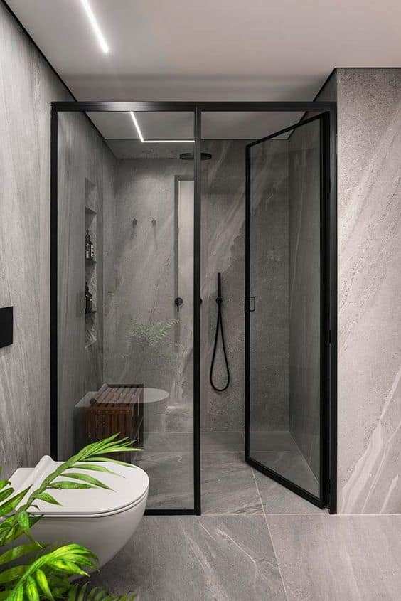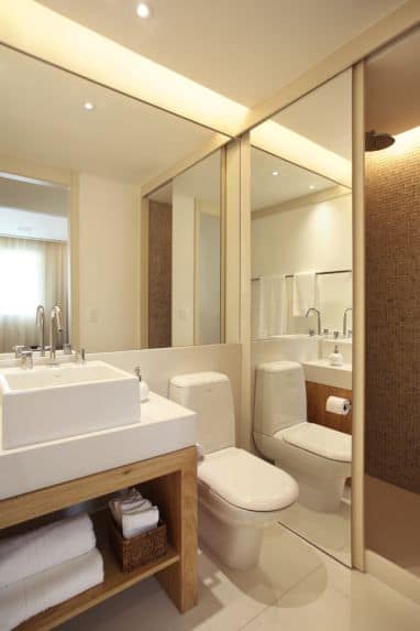 Outra opção muito usada em banheiros compactos, a porta camarão é dobrável e, portanto, facilita a entrada no espaço, além de otimizar o layout.