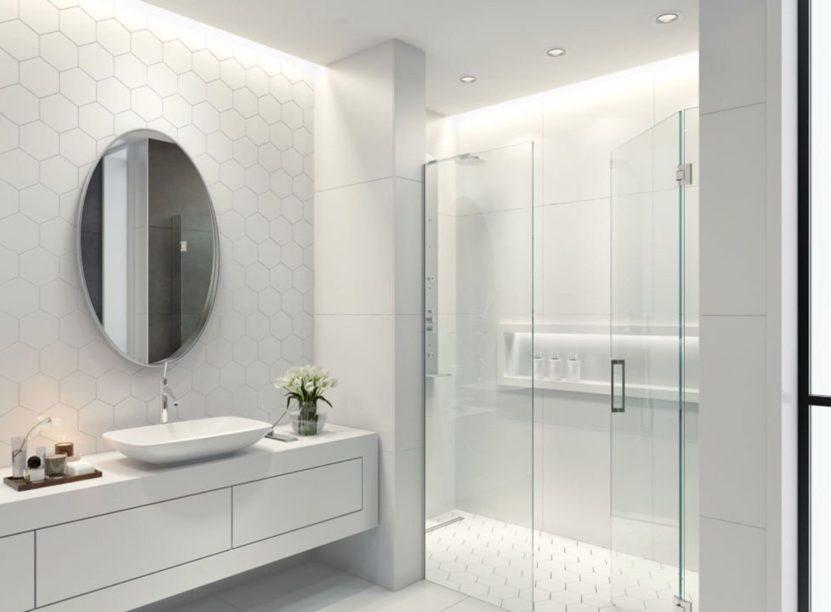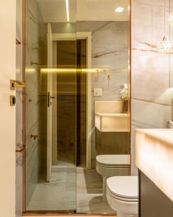 • Para banheiros compactos, opte por portas de vidro de correr.