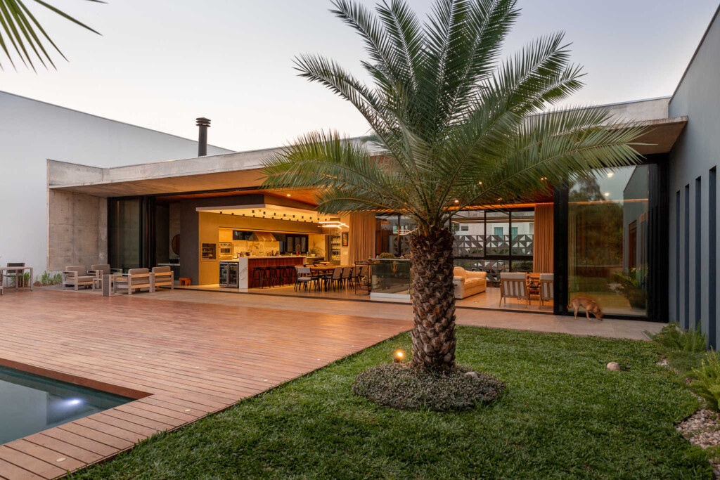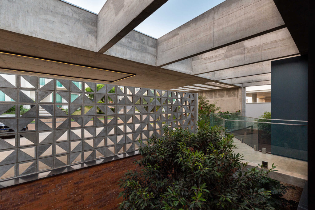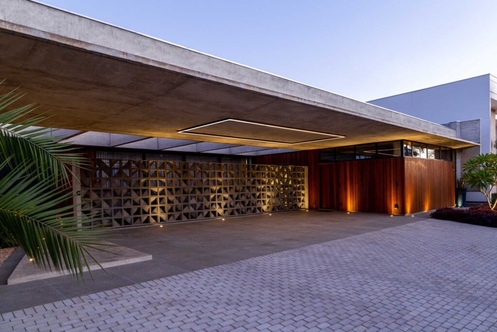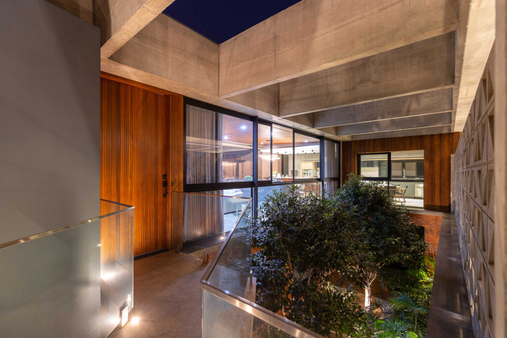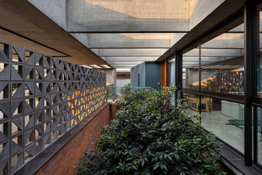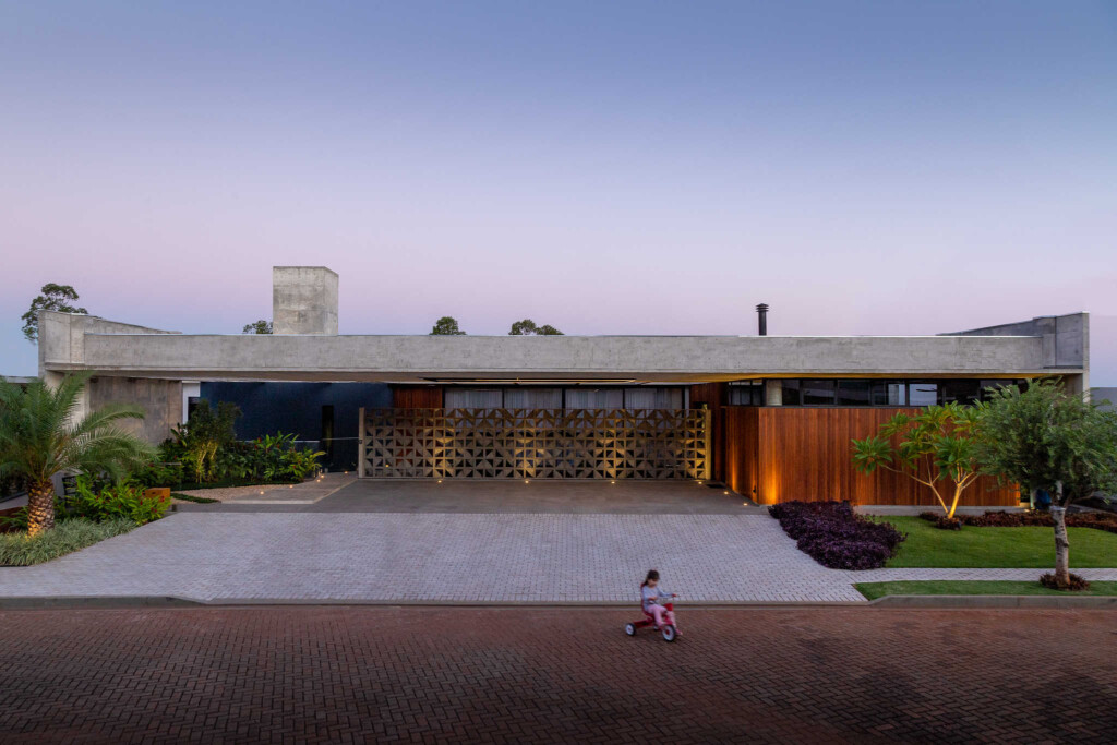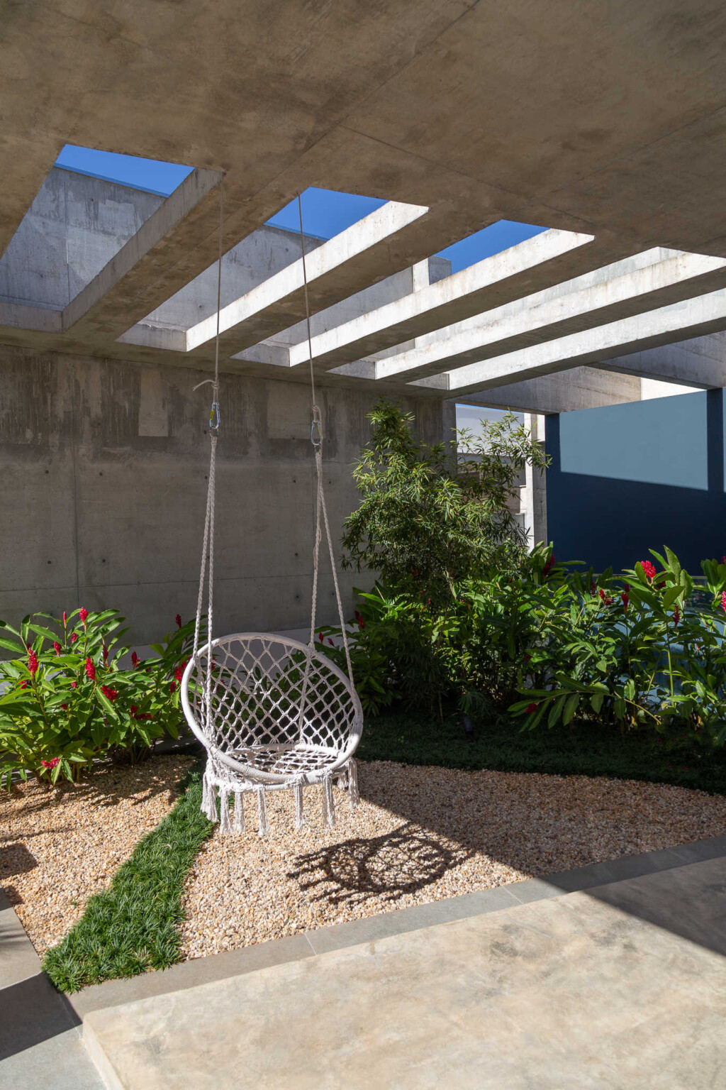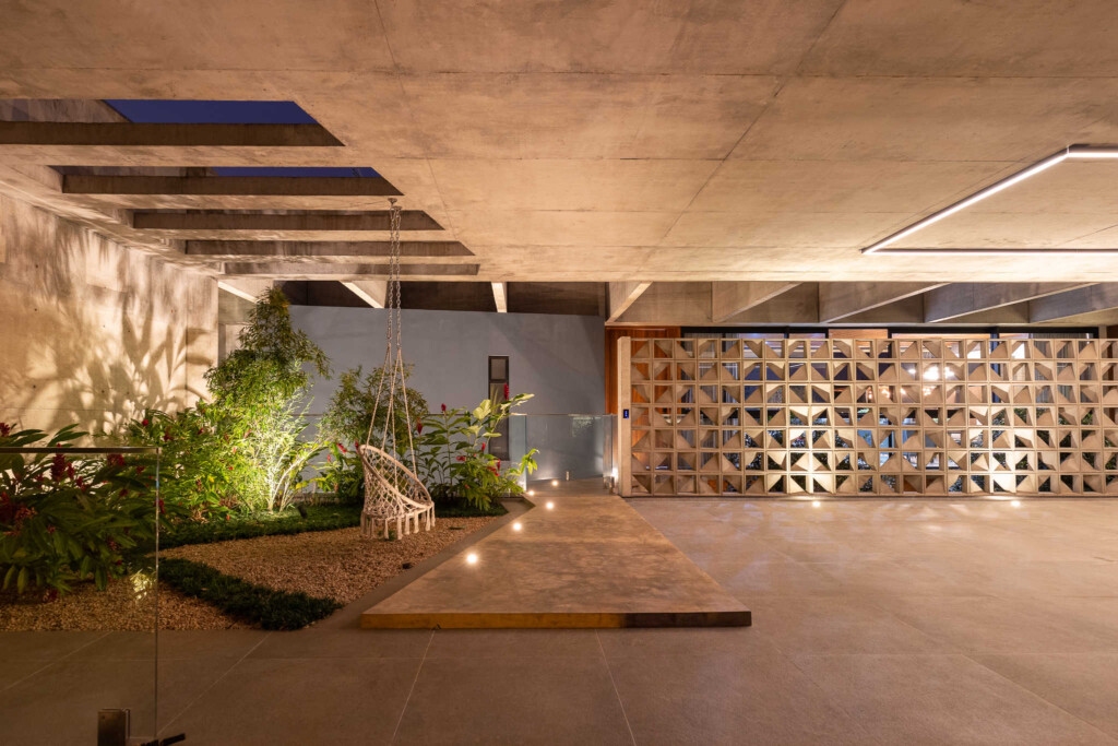 Apesar do terreno apresentar um grande desnível, o cliente solicitou uma casa térrea. Isso exigiria um grande aterro e como forma de mitigar a intervenção foi proposto um subsolo abrigando escritório, home theater e brinquedoteca iluminados por um grande jardim no vazio central que acompanha a declividade natural do lote. Esse vazio organiza os ambientes no seu perímetro e, junto com a parede de cobogó da fachada, confere maior privacidade para a área social além de conectar o pavimento térreo e o subsolo.