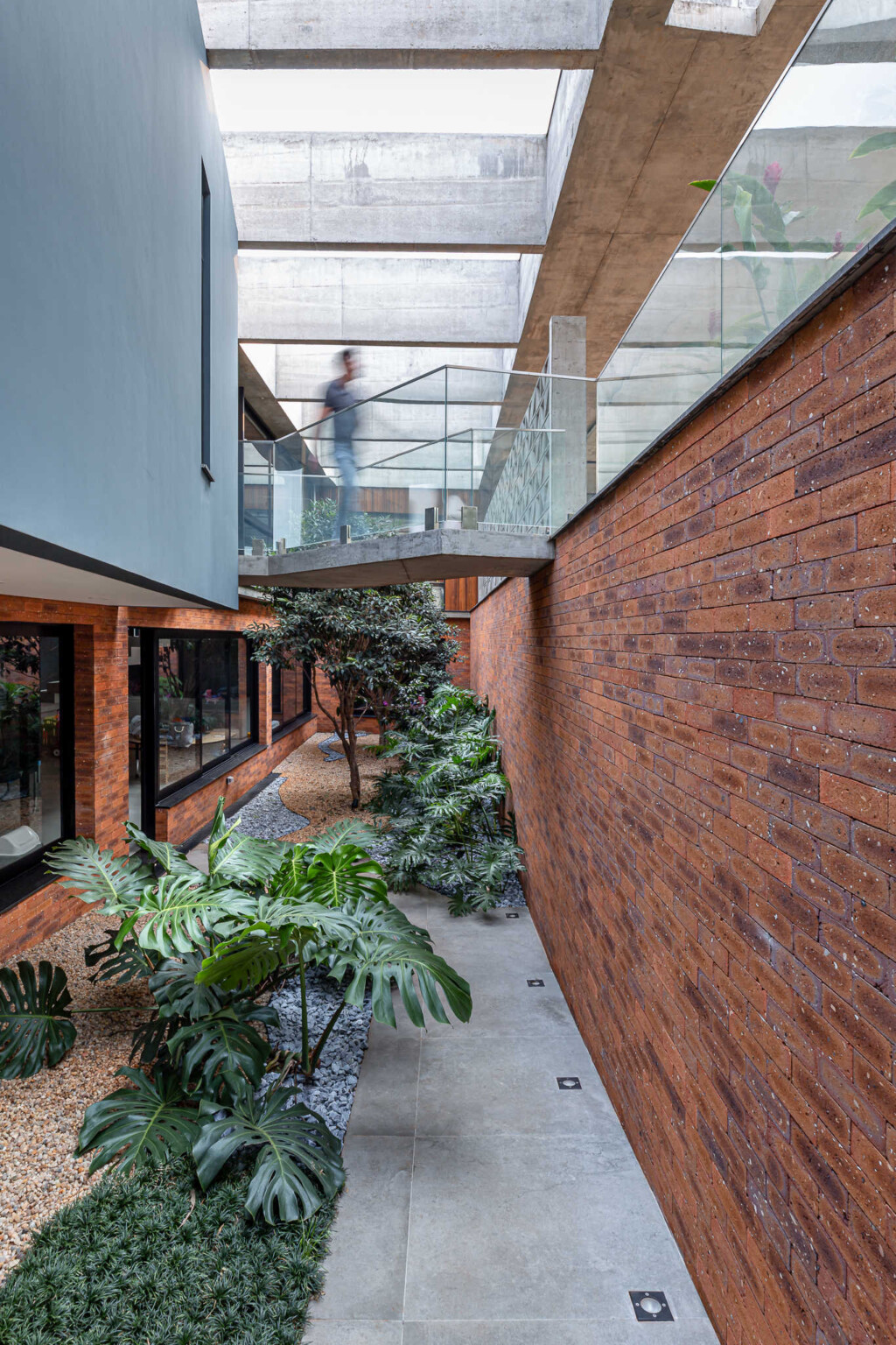 O acesso principal da casa é definido por uma passarela que busca o visitante ainda na garagem e o leva ao setor social. Nesse trajeto, a passarela com desenho sinuoso atravessa o vazio central que abriga o jardim no nível inferior. Esse percurso introduz ao usuário o que vem mais adiante.