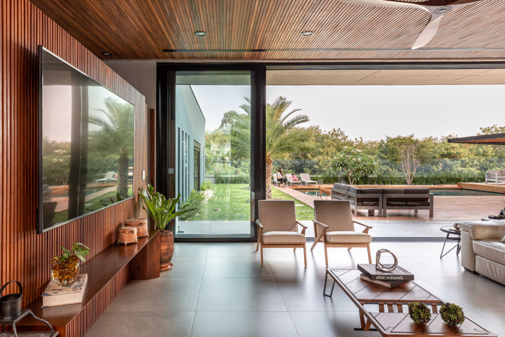 O nível mais baixo do jardim interno e fundo de vale externo, na parte posterior do terreno, permitem uma vista das copas das árvores no nível da sala, criando uma relação do interior com o exterior.