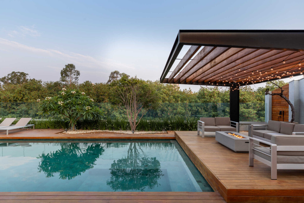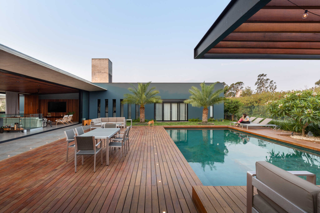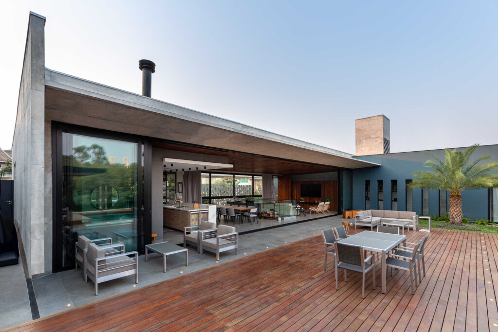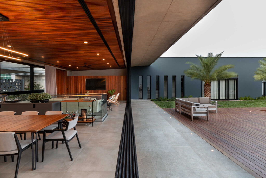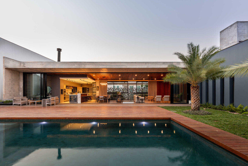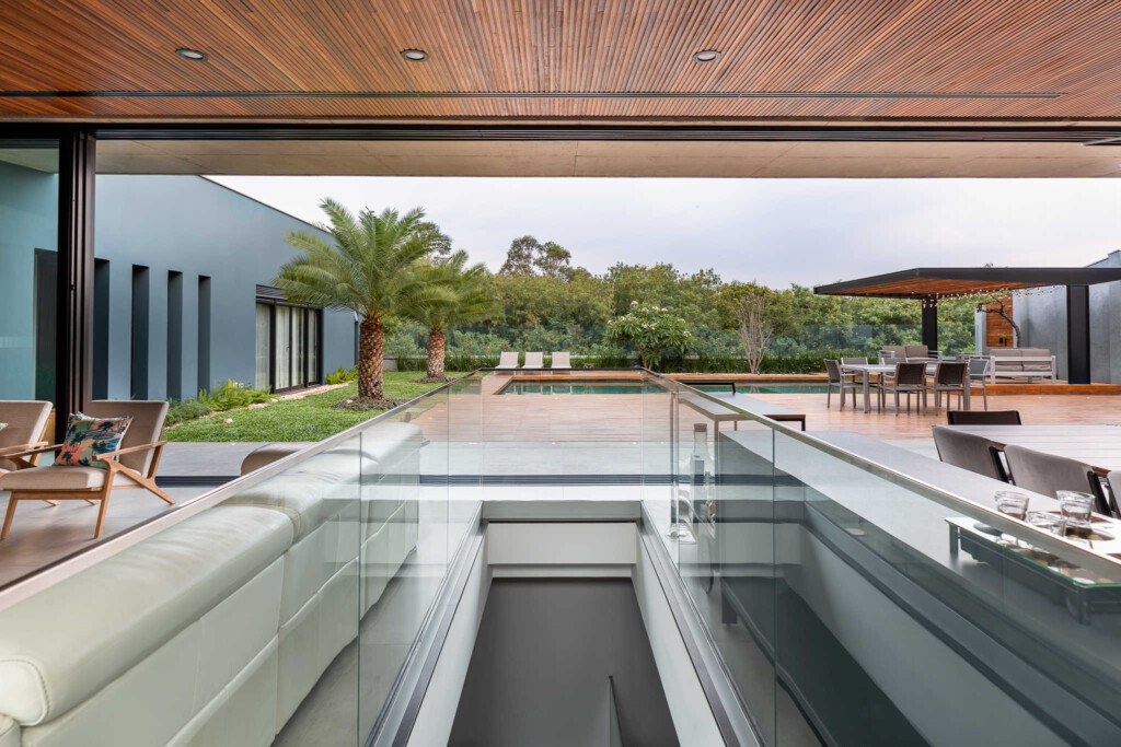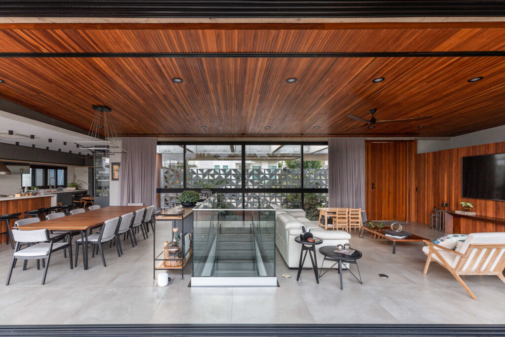 O ponto chave do projeto é uma grande laje protendida, inclinada e com pontos de apoio imperceptíveis. Neste espaço de planta livre estão distribuídos de maneira integrada o estar, jantar, espaço gourmet e cozinha que se abrem lateralmente para a área de lazer de um lado e jardim central do outro.