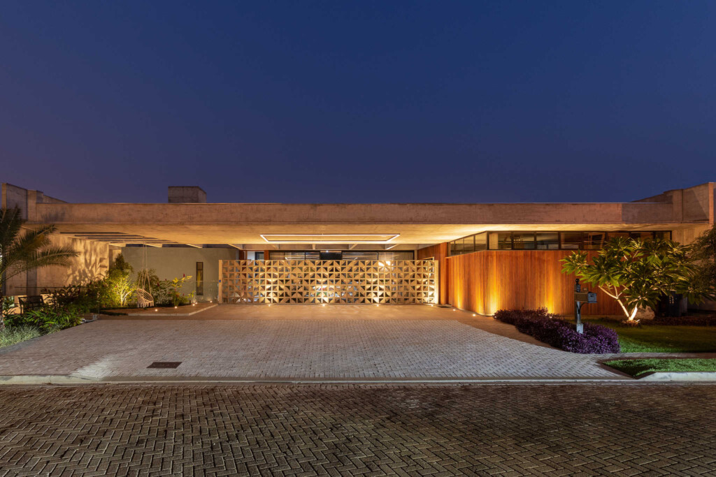 Localizado em um condomínio fechado, a casa BRJ se destaca pelos elementos de concreto aparente compostos por duas empenas cegas e vigas protendidas formando um conjunto de pórticos que caracteriza a volumetria e abriga o coração da casa: o setor social e serviços. Grandes planos de correr de alumínio e vidro vedam esse núcleo de concreto e permitem a ventilação cruzada e a iluminação natural, além de conectá-lo visualmente com todo o restante da casa.