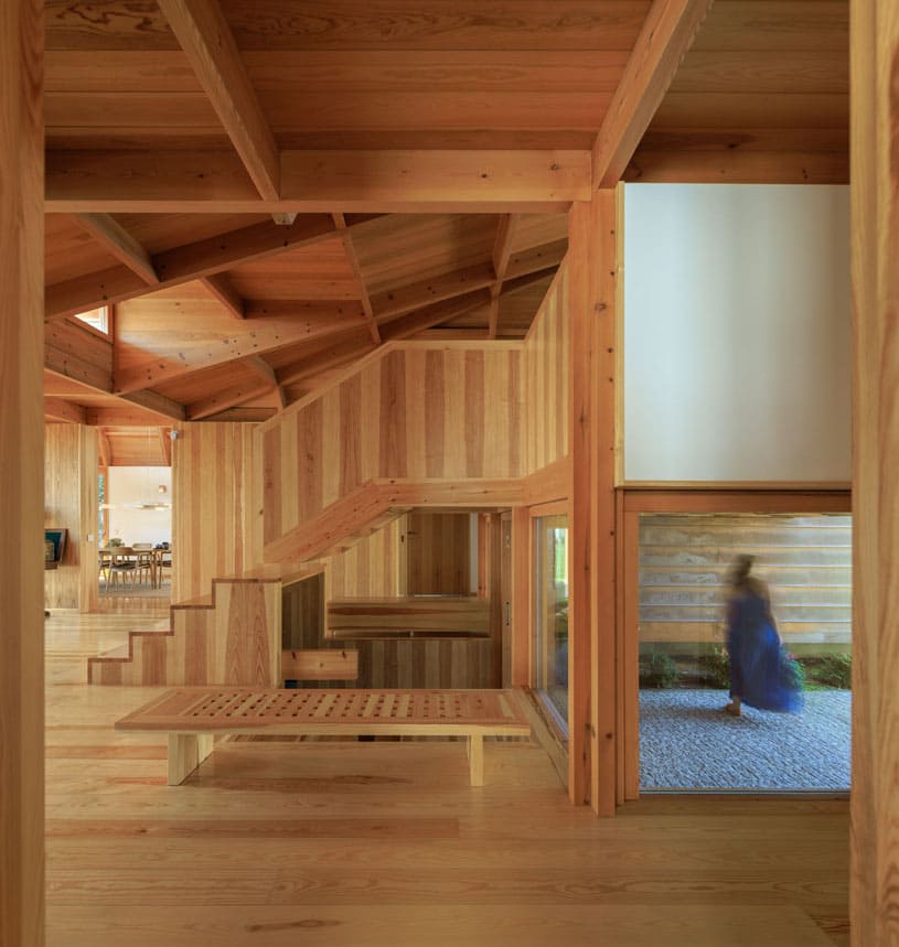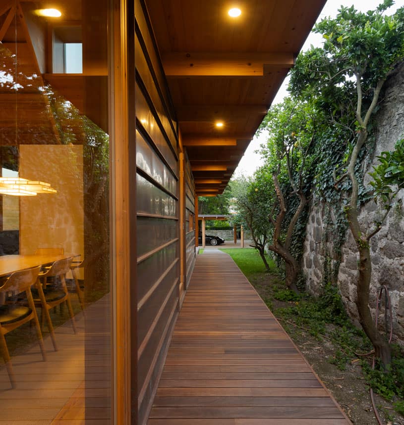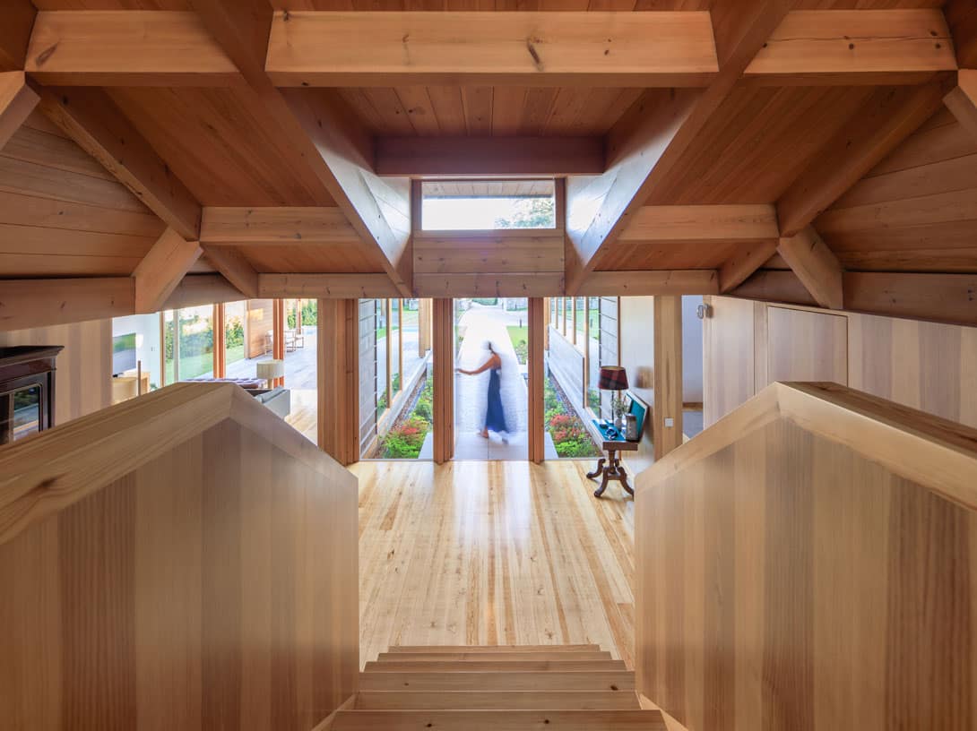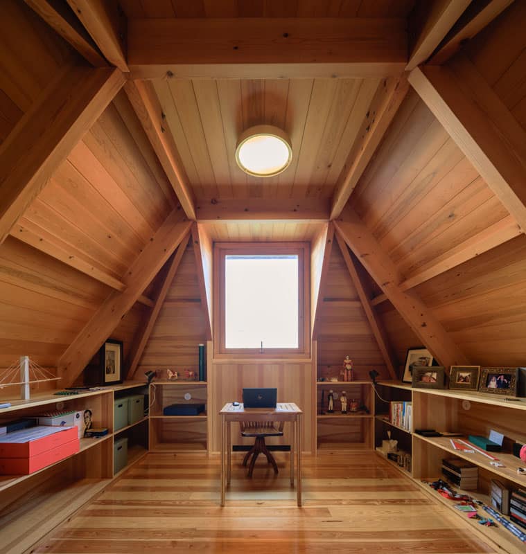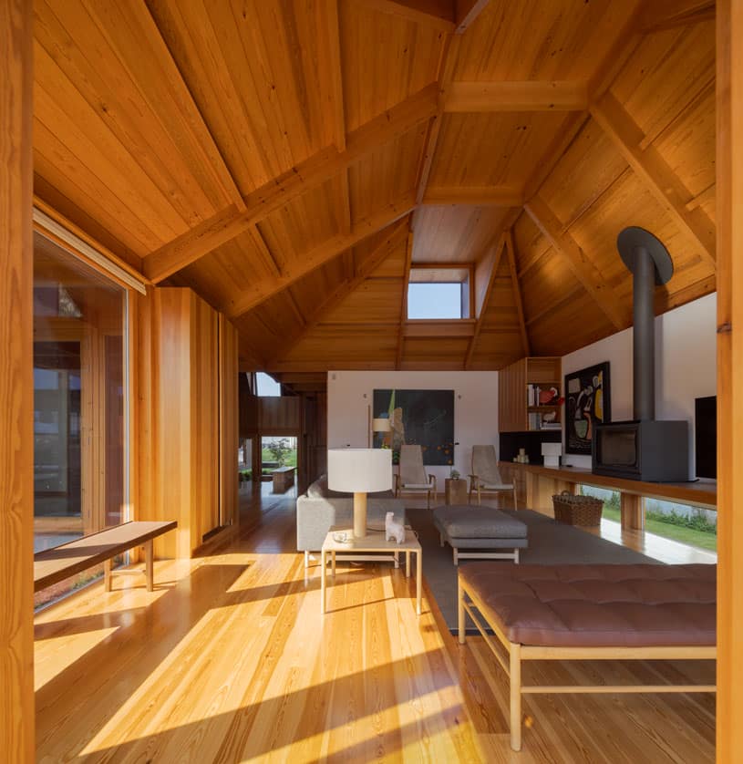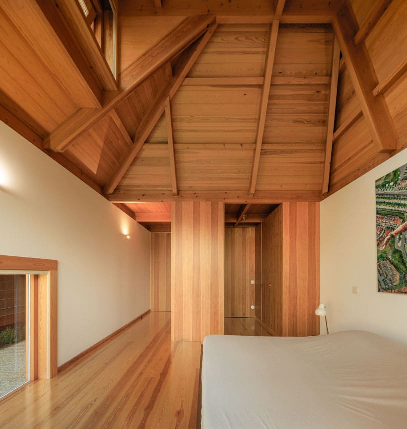 "Respeitados os afastamentos, a Casa eleva-se do solo de modo a não perturbar – demasiado – o subsolo. Sobre uma base em betão, pousou uma estrutura de madeira formada por dois Us que em conjunto dão a forma de H à Casa. O U da frente – a sul – contem as áreas sociais – cozinha, sala de jantar e sala. O U de trás – a norte – contem os três quartos."