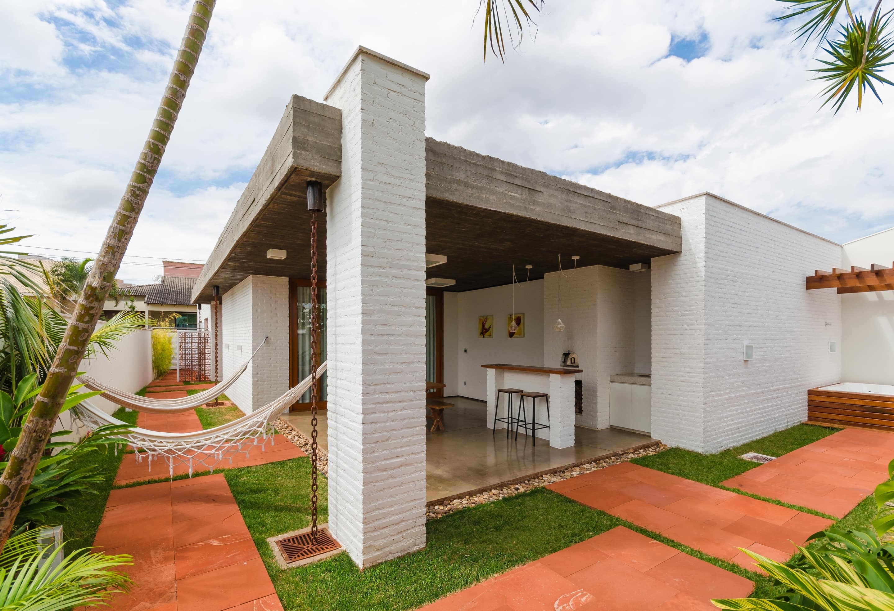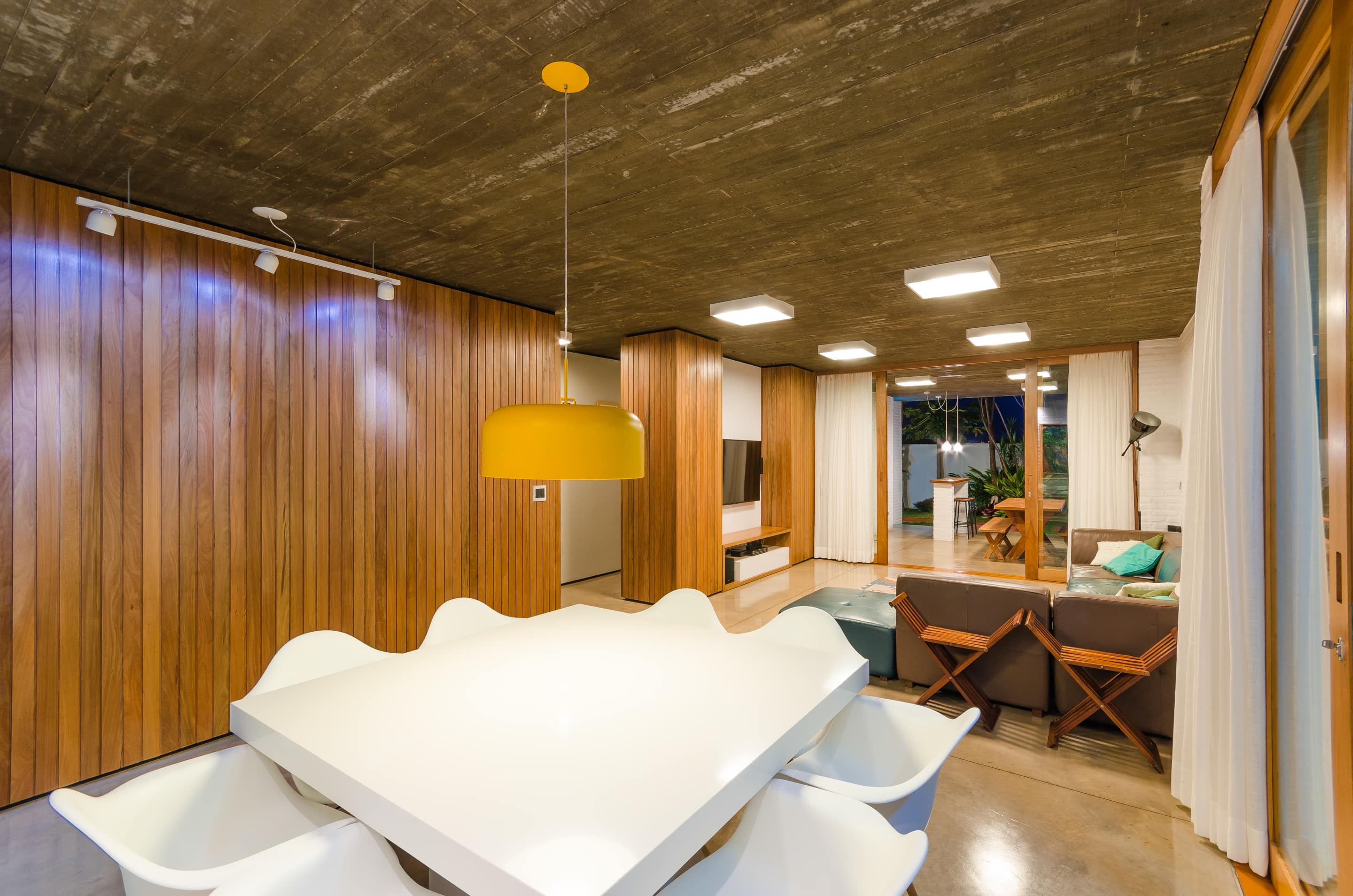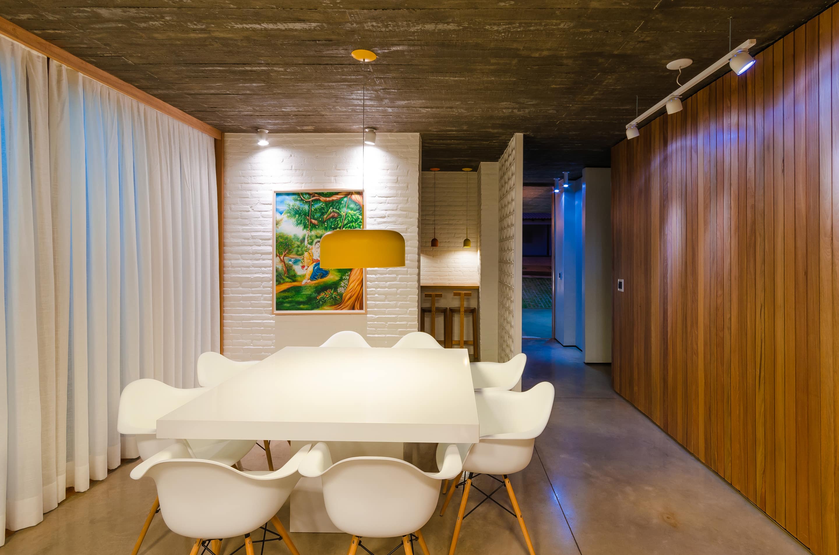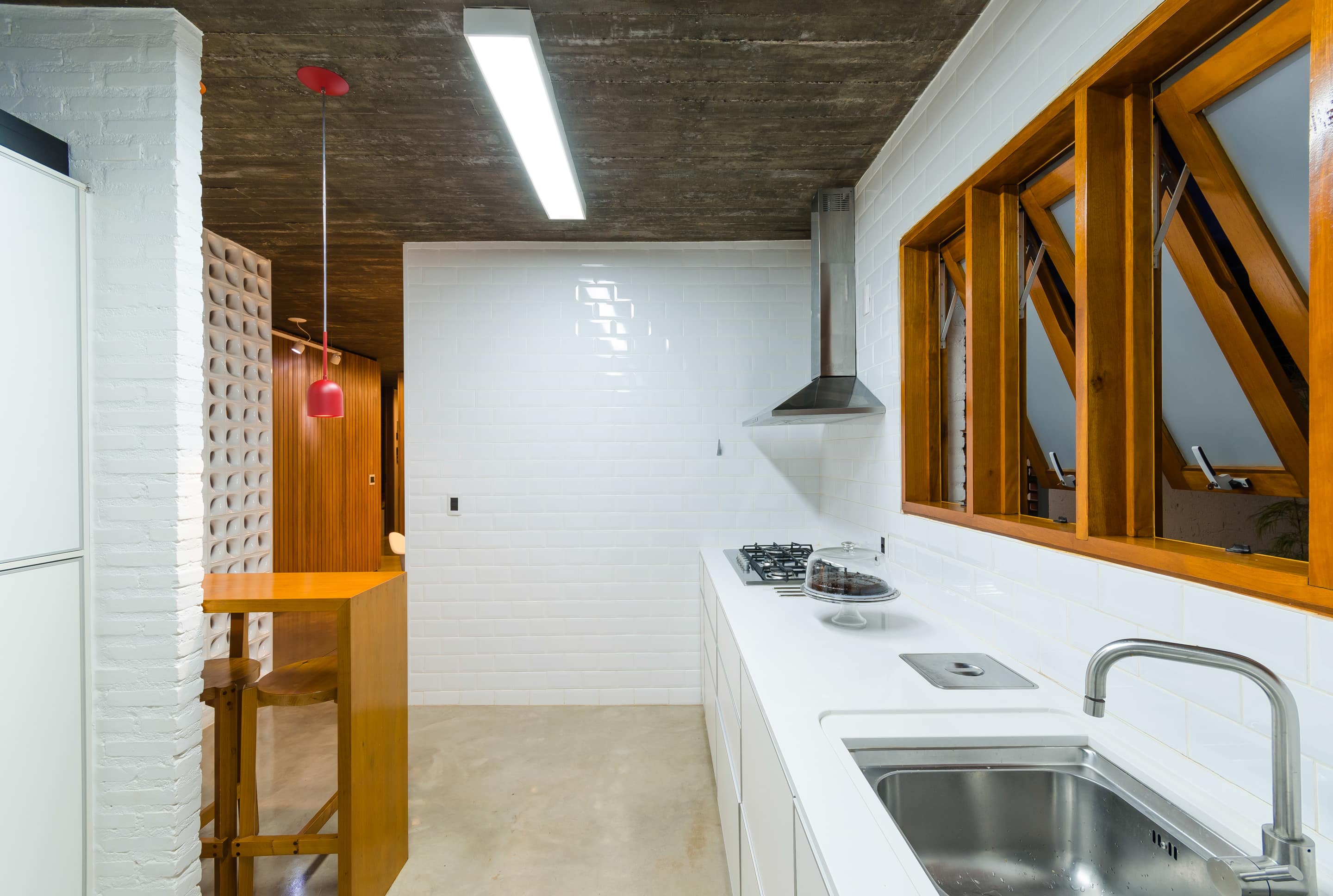 O brutalismo do concreto aparente proporciona proteção e segurança, nesse caso uma laje única xilogravada com a memória dos sarrafos usados na forma. A praticidade do piso em concreto polido estendendo-se sob as áreas de convivência contrasta com a austeridade do tijolo aparente pintado na cor branca combinado com os nostálgicos cobogós.