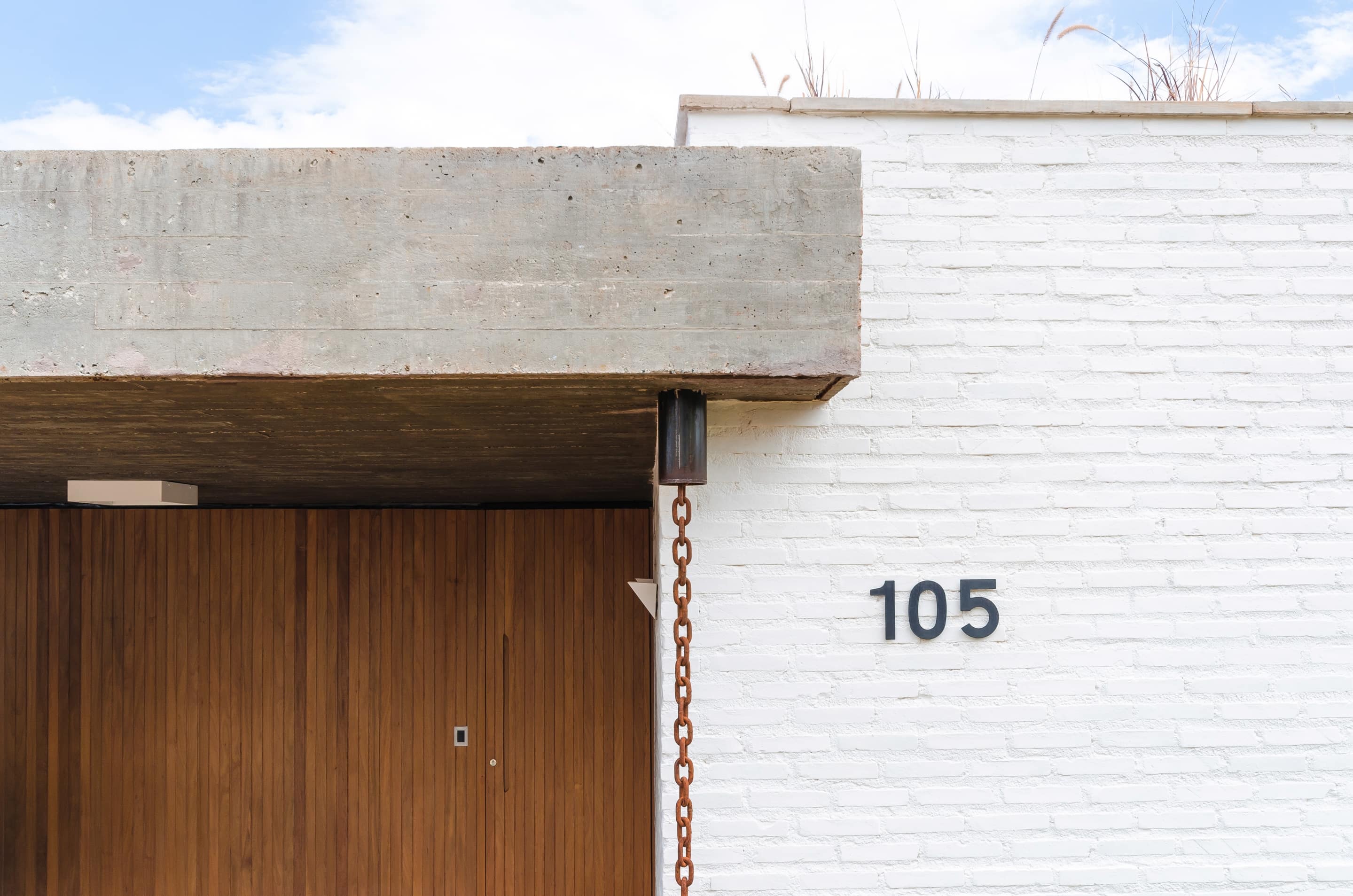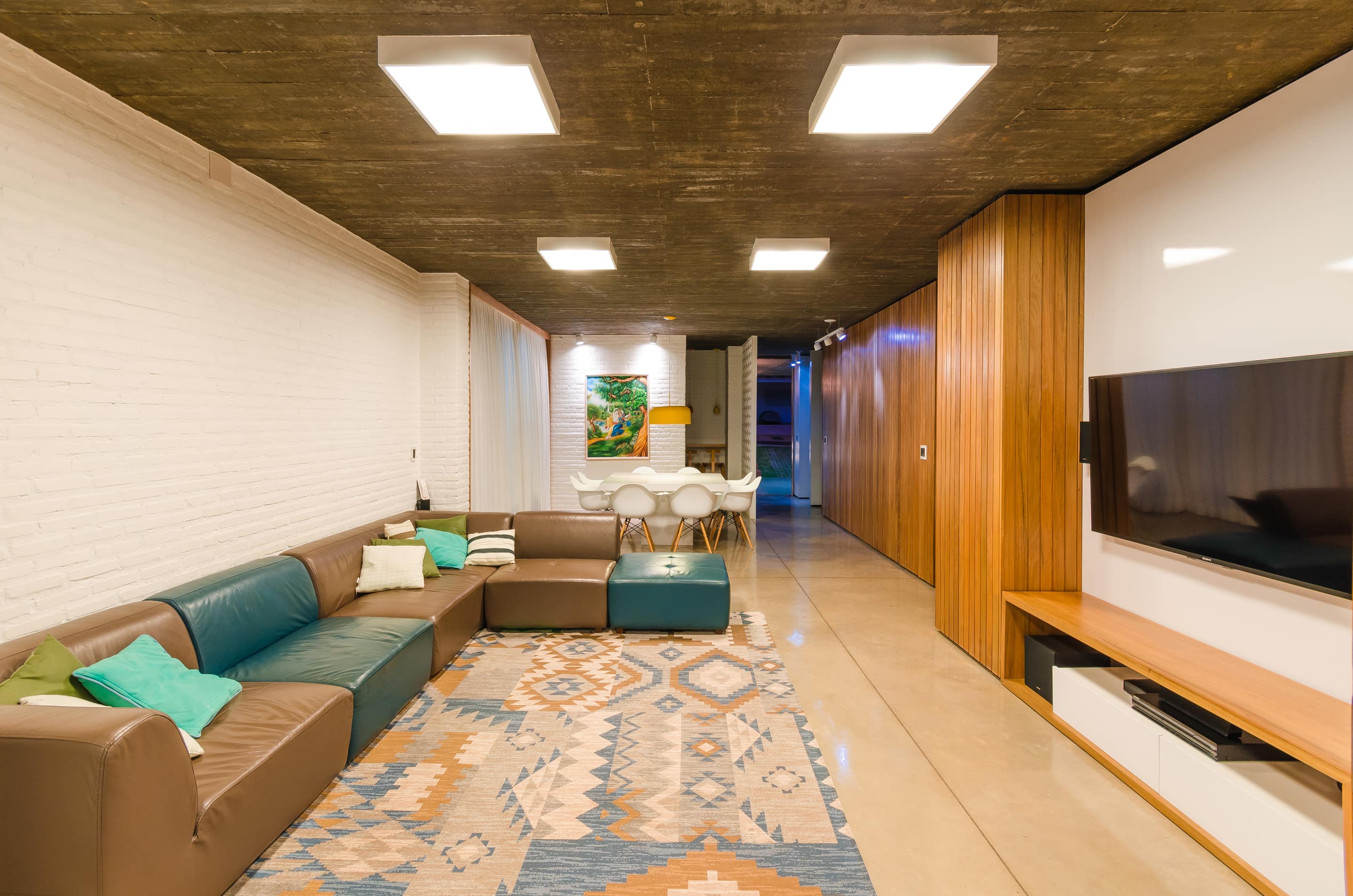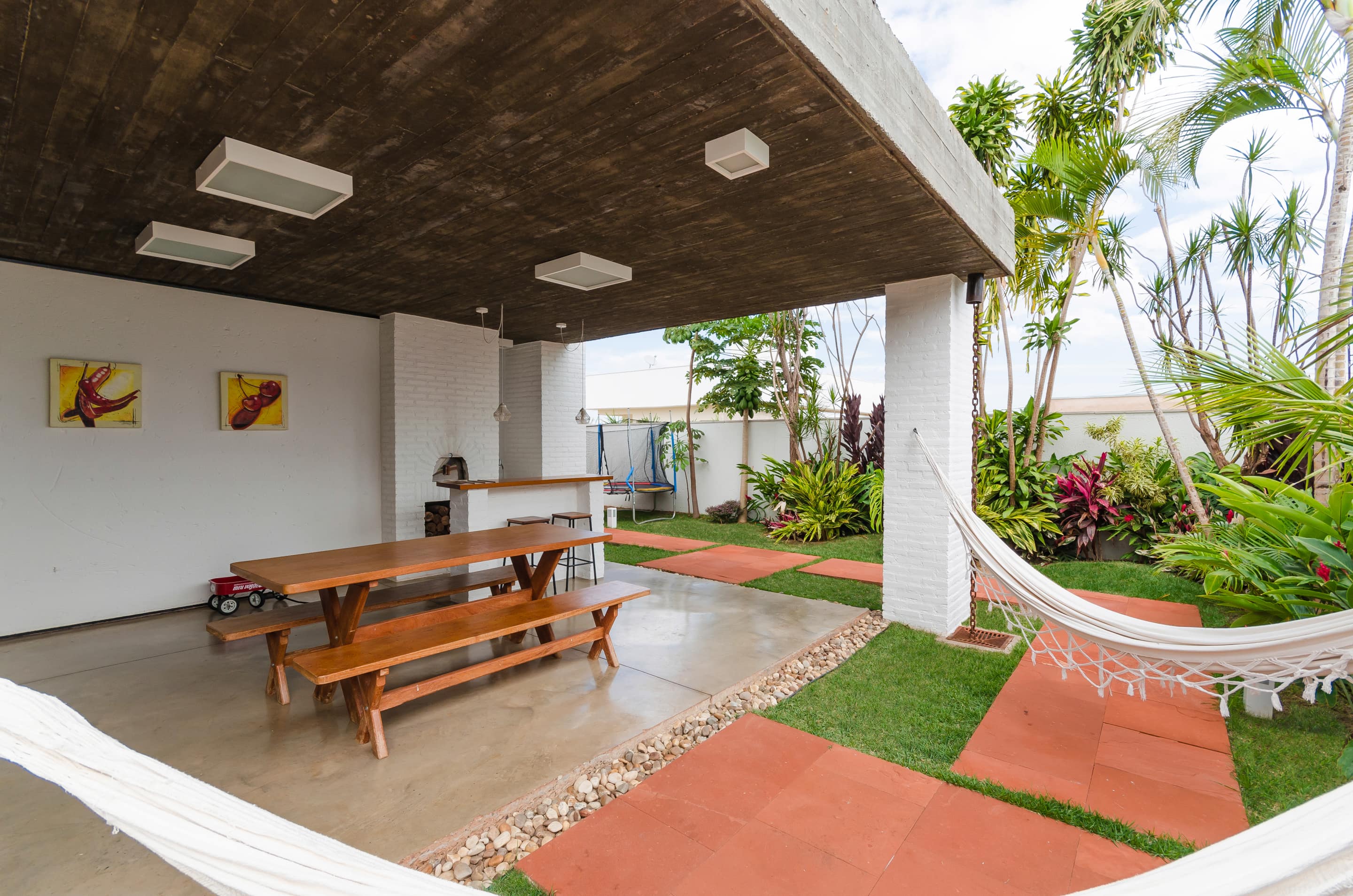 O brutalismo do concreto aparente proporciona proteção e segurança, nesse caso uma laje única xilogravada com a memória dos sarrafos usados na forma. A praticidade do piso em concreto polido estendendo-se sob as áreas de convivência contrasta com a austeridade do tijolo aparente pintado na cor branca combinado com os nostálgicos cobogós.