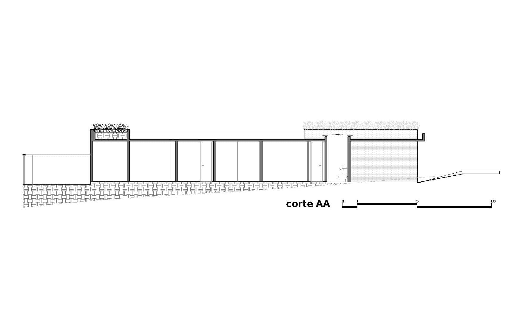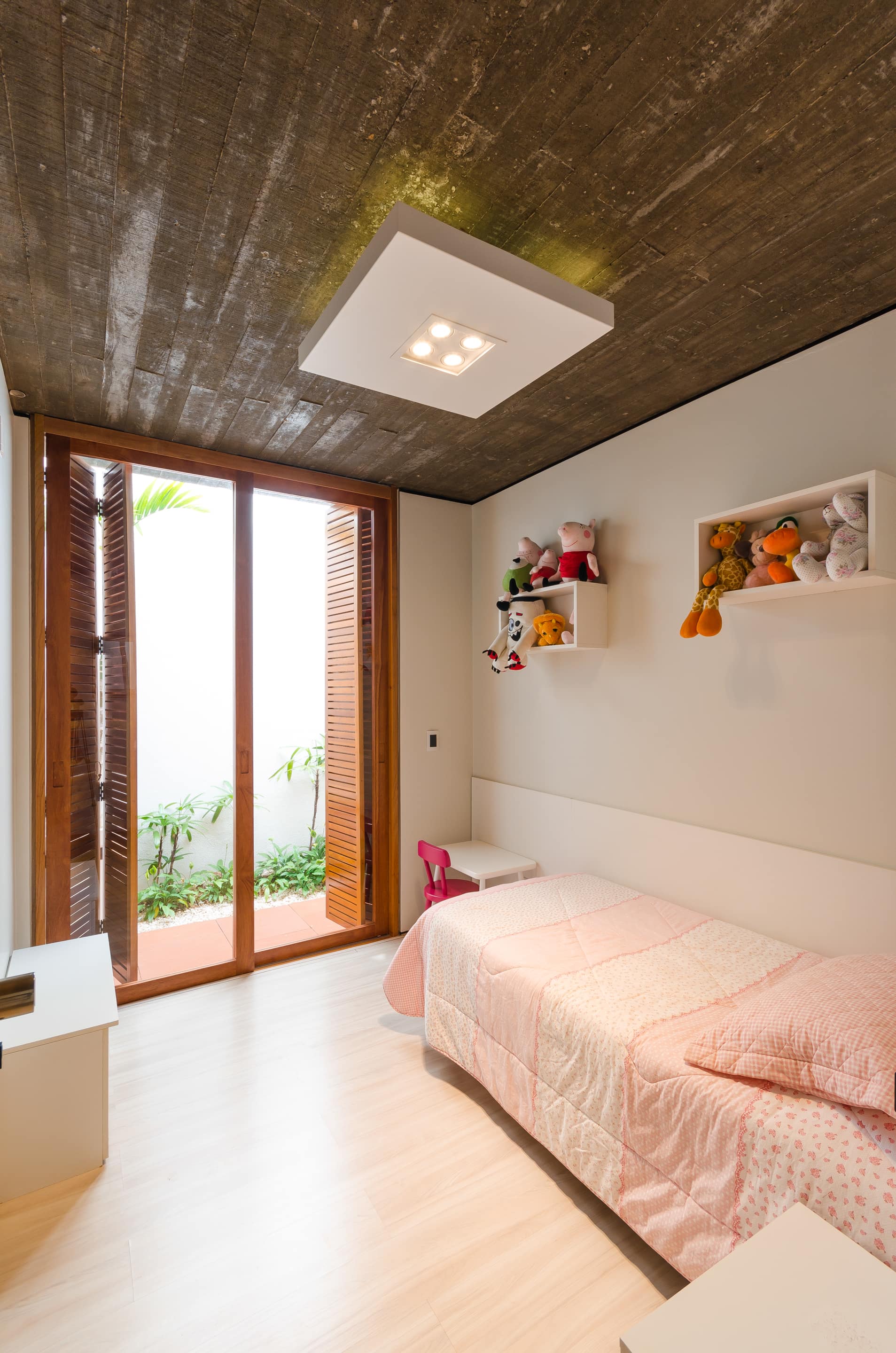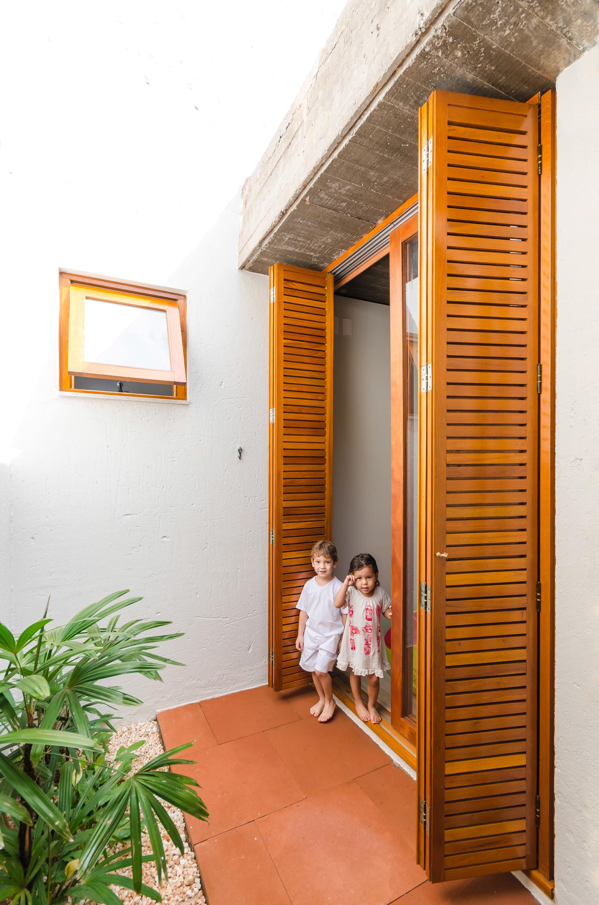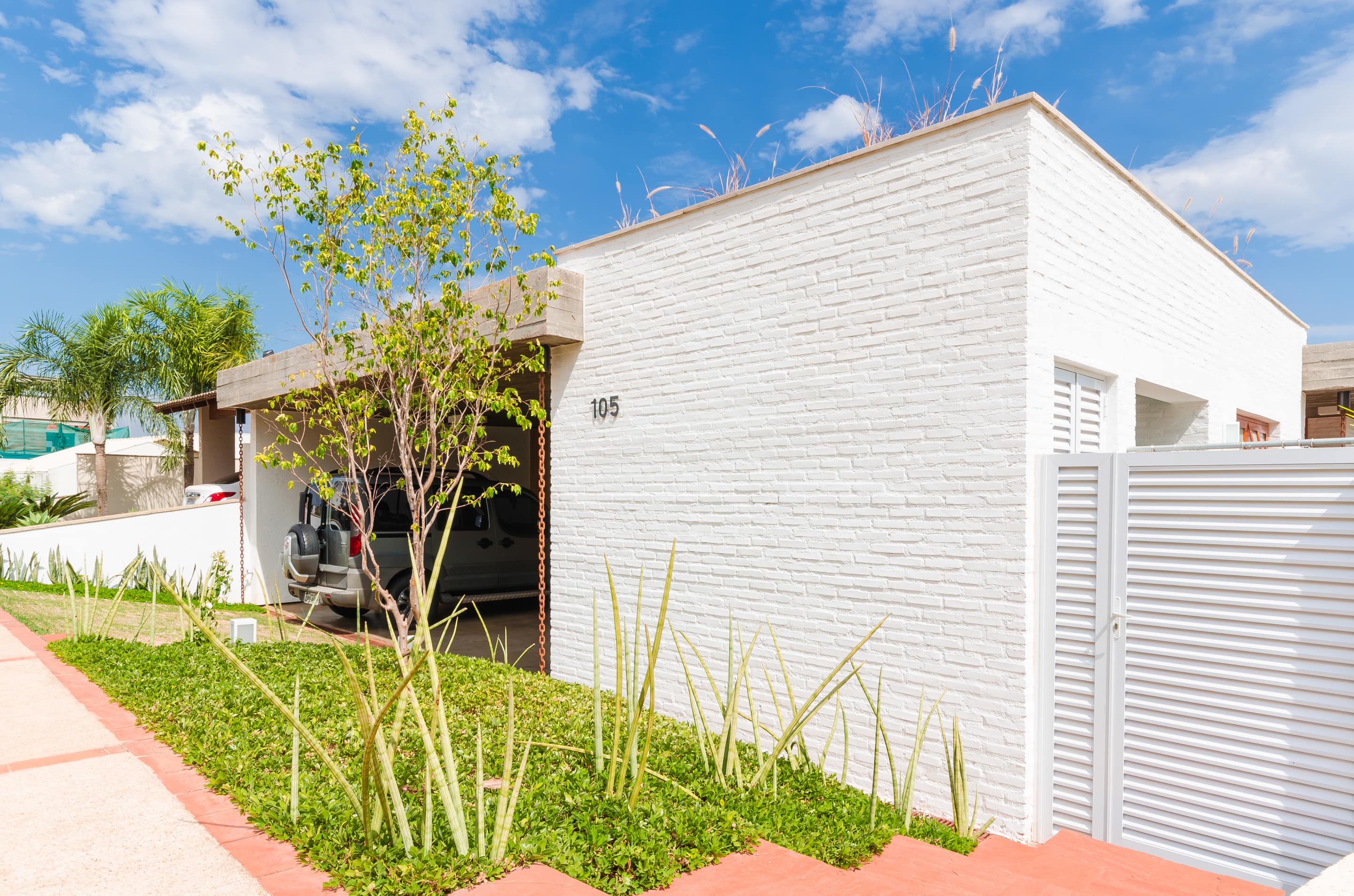 O brutalismo do concreto aparente proporciona proteção e segurança, nesse caso uma laje única xilogravada com a memória dos sarrafos usados na forma. A praticidade do piso em concreto polido estendendo-se sob as áreas de convivência contrasta com a austeridade do tijolo aparente pintado na cor branca combinado com os nostálgicos cobogós.