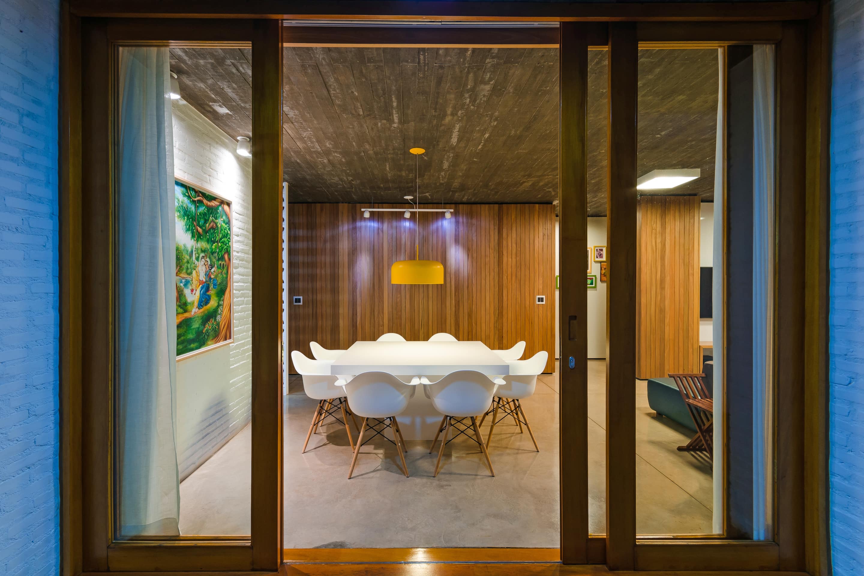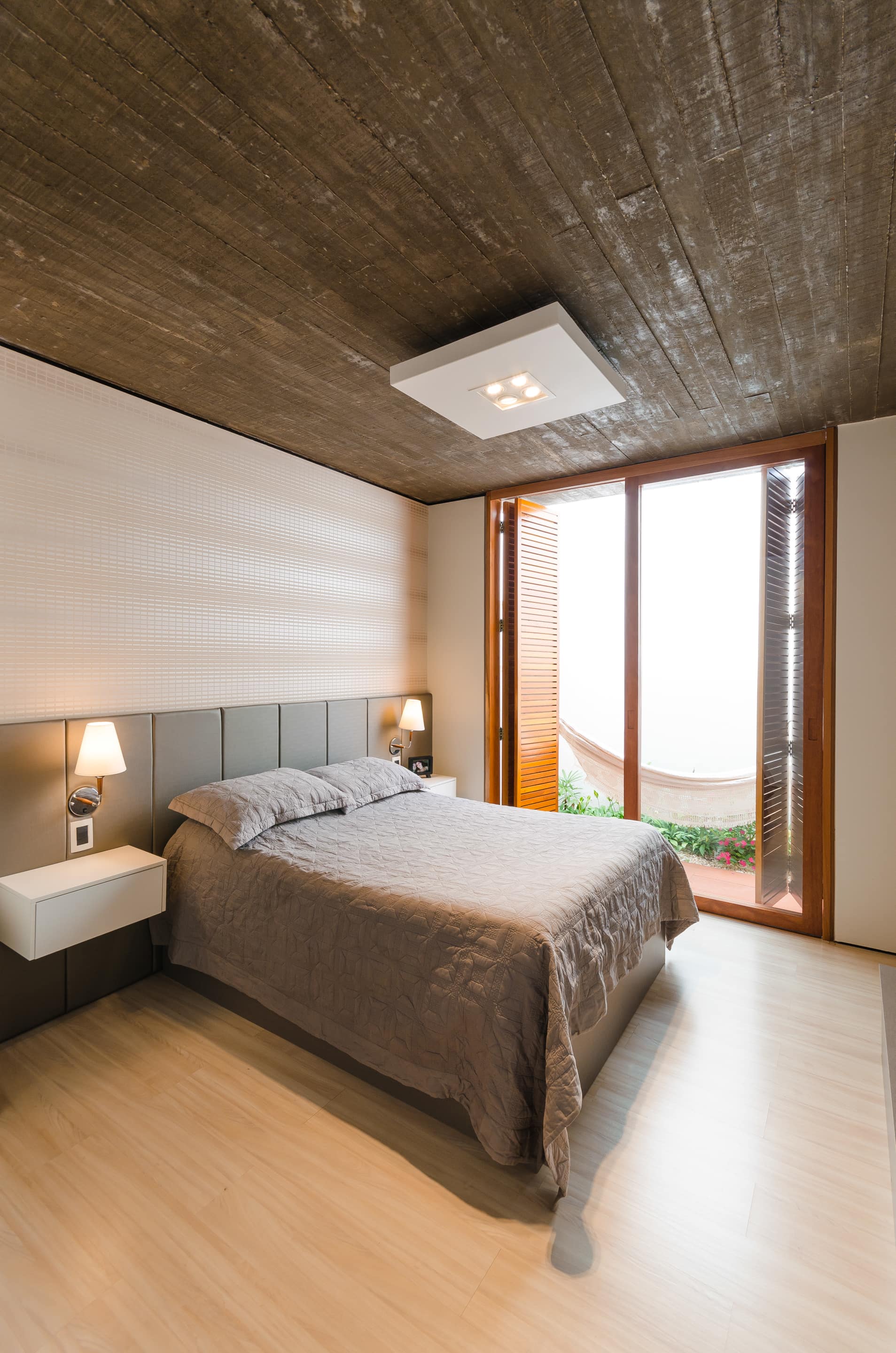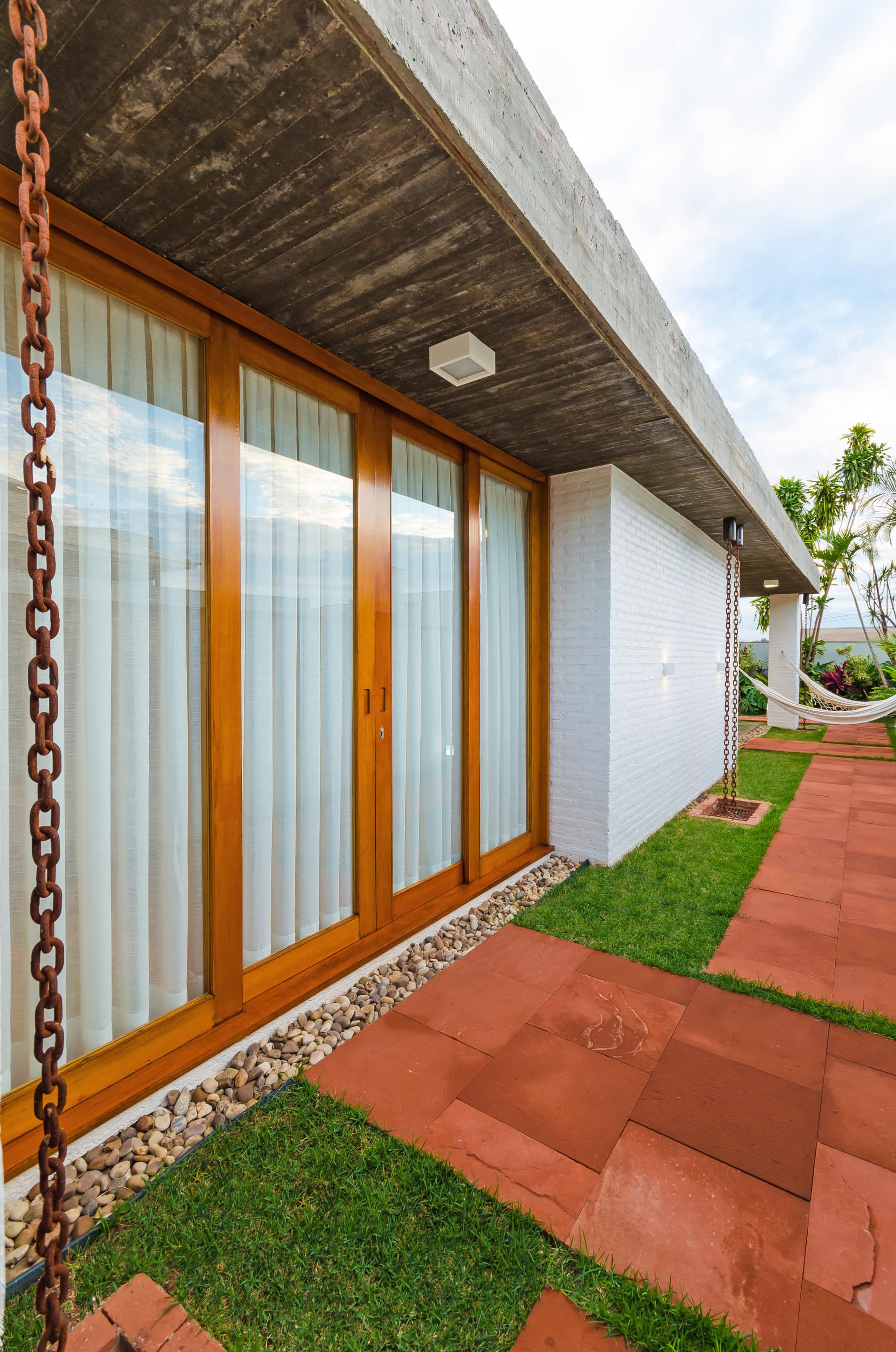 As vigas invertidas possibilitaram uma laje inferior única e plana, deixando os vãos livres para serem vencidos pelas esquadrias de cedro feitas sob medida. A madeira traz conforto térmico e acústico, empregada nos painéis de jequitibá separando longitudinalmente os ambientes de convivência dos ambientes de repouso. Adotada da mesma forma na fachada principal, oculta a porta de mesmo material e possibilita um acesso mais reservado.