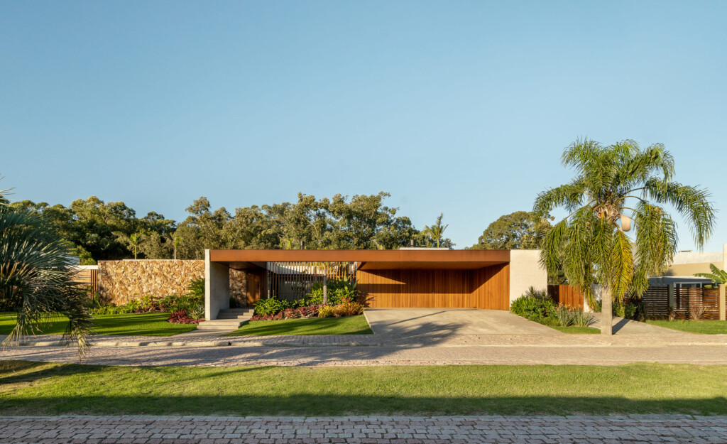 A cobertura inclinada, ao centro da casa, destaca-se da horizontalidade do conjunto possibilitando maior insolação das áreas sociais. Pergolados em madeira e aço cortén potencializam a integração dos ambientes internos com o espaço exterior, possibilitando a criação de áreas externas sombreadas.