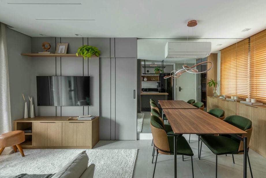 "Nesse apartamento de 70m2, a Integração dos ambientes com a cozinha americana, sala de jantar