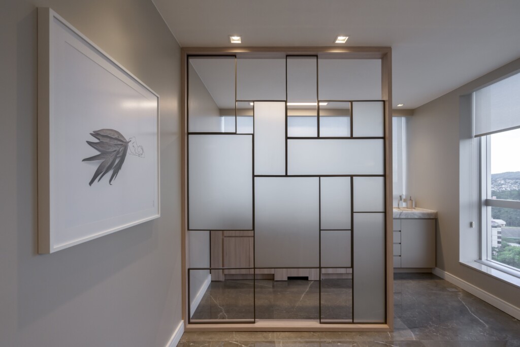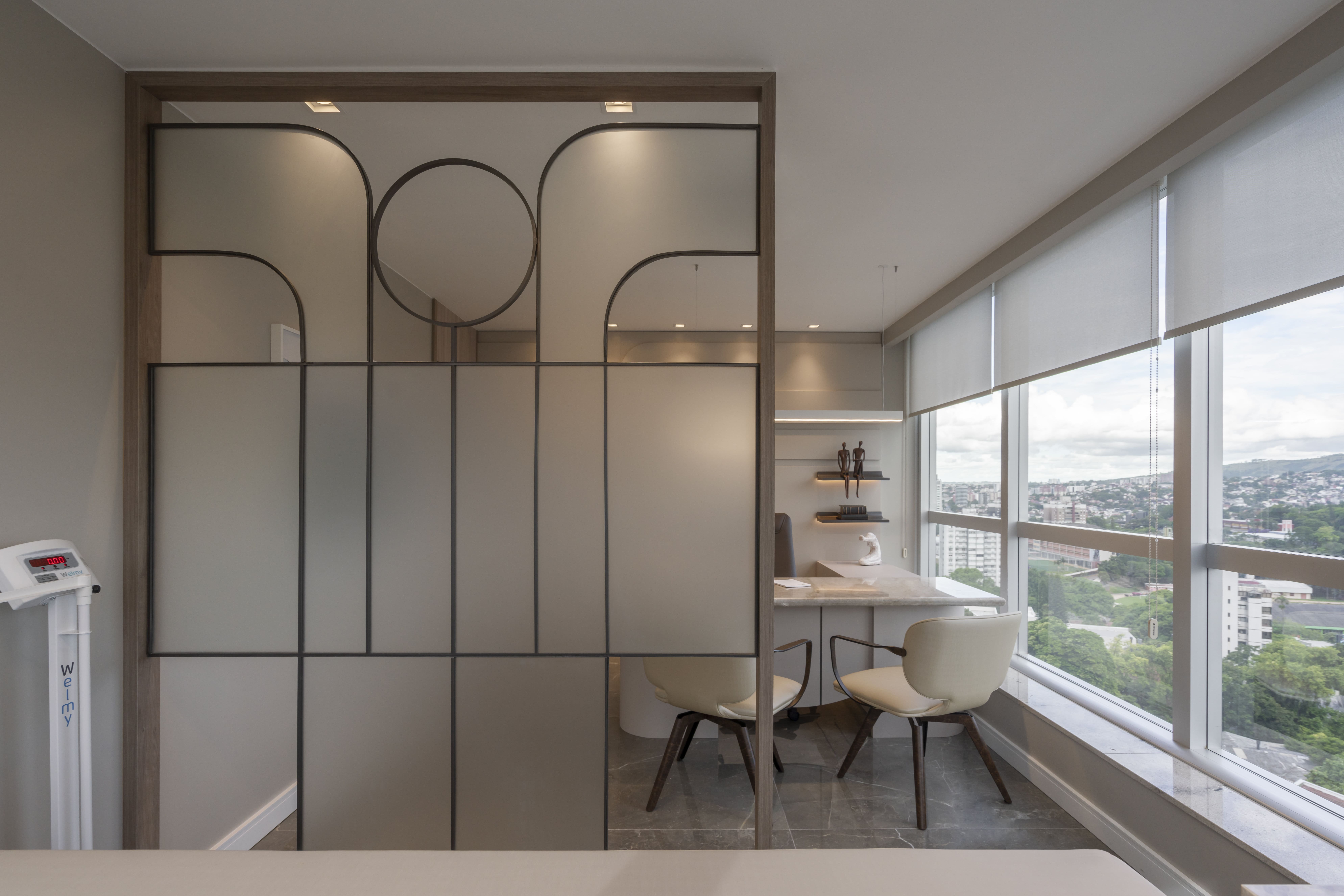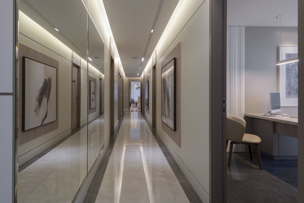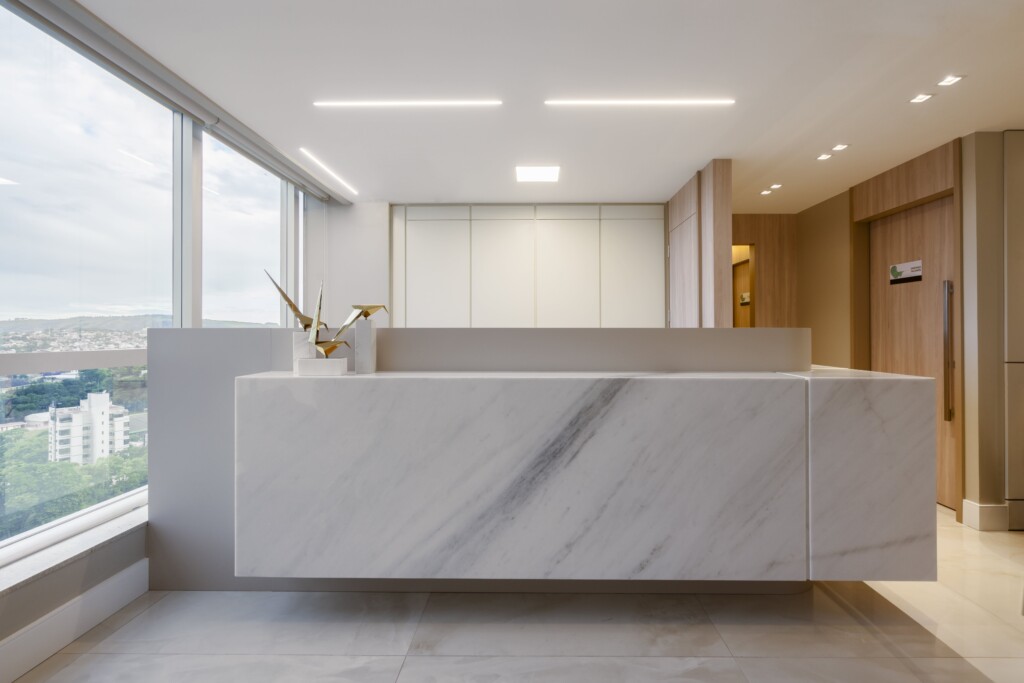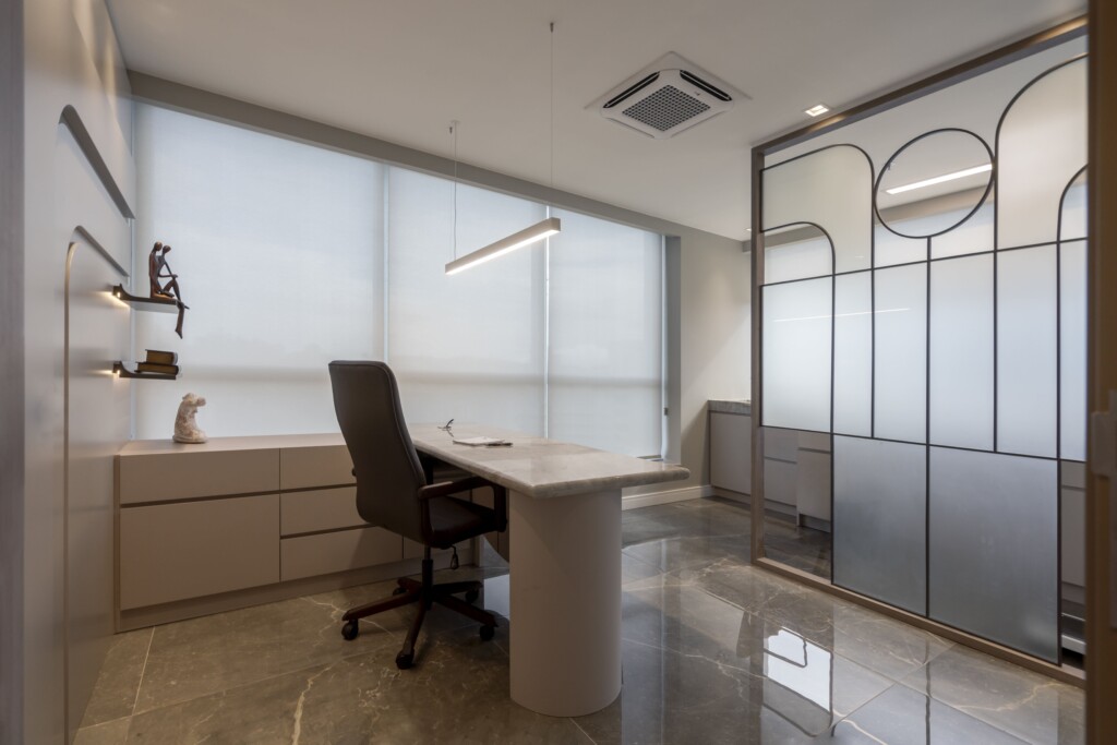 A arquitetura priorizou a integração entre estética e bem-estar. A iluminação natural percorre os ambientes, valorizando os revestimentos nobres escolhidos para transmitir sofisticação e durabilidade. As divisórias em vidro fosco permitem a entrada de luz, ao mesmo tempo em que asseguram privacidade, criando espaços reservados sem perder a sensação de amplitude.