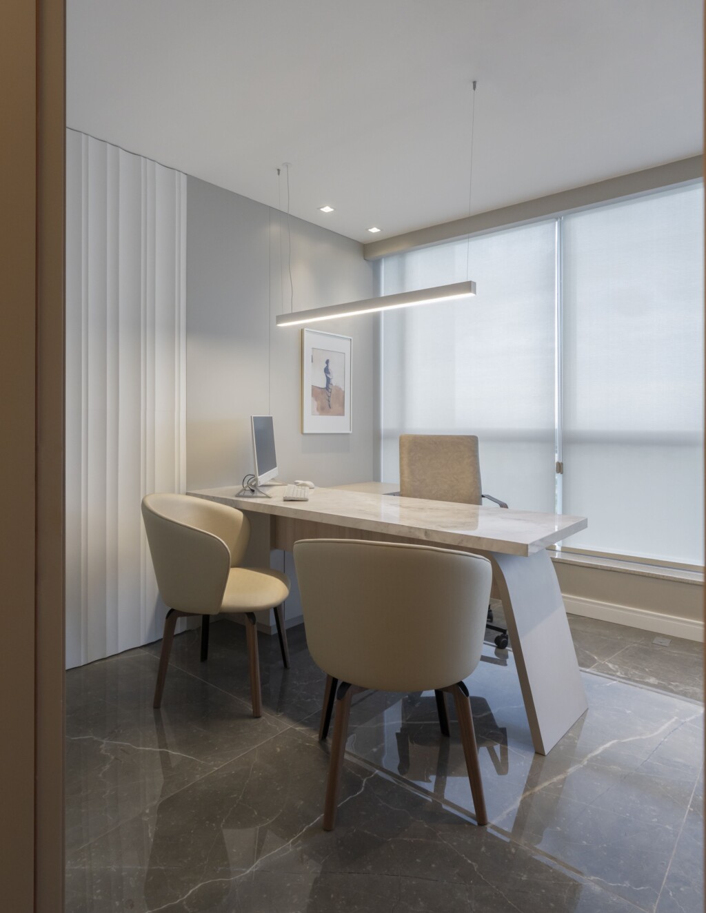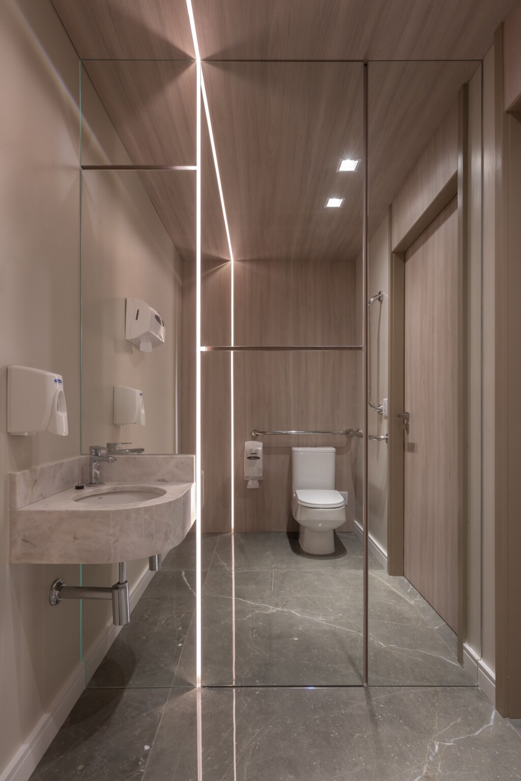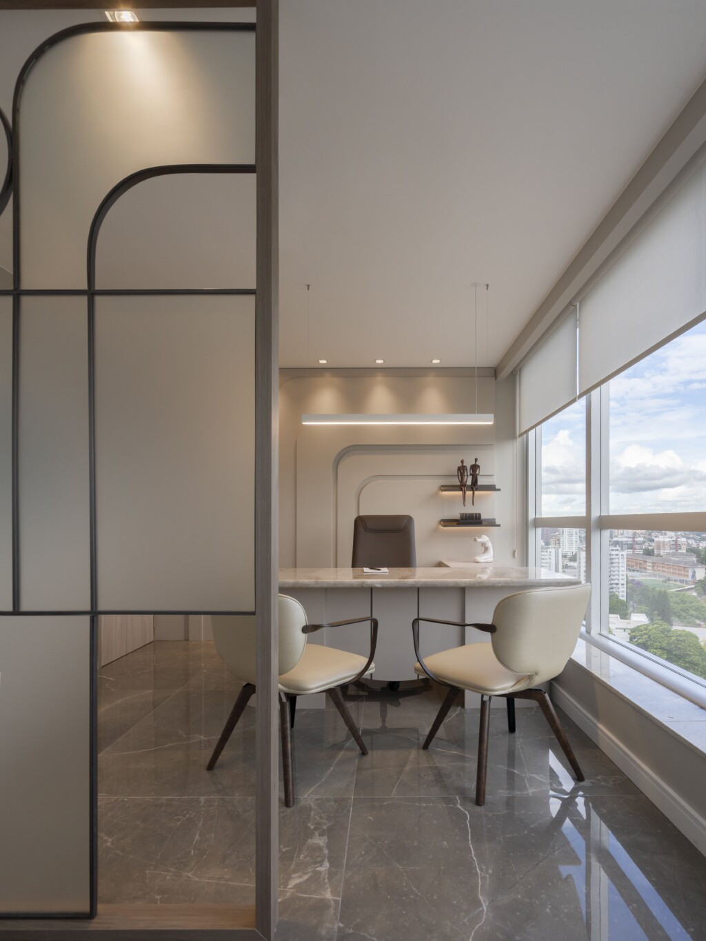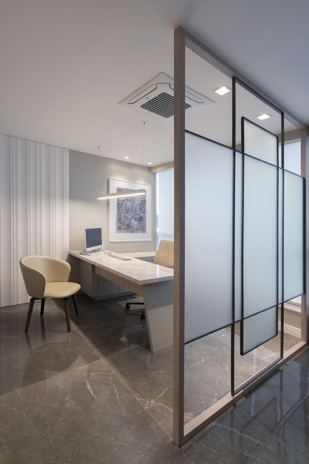 A arquitetura priorizou a integração entre estética e bem-estar. A iluminação natural percorre os ambientes, valorizando os revestimentos nobres escolhidos para transmitir sofisticação e durabilidade. As divisórias em vidro fosco permitem a entrada de luz, ao mesmo tempo em que asseguram privacidade, criando espaços reservados sem perder a sensação de amplitude.