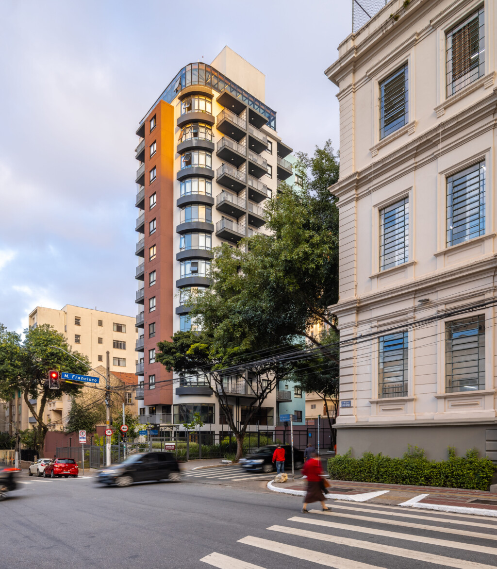 As boas-vindas ao edifício é feita por meio de um lounge amplo com pé direito duplo concebido para funcionar como a clausura do prédio. Na fachada, ainda se destacam o caixilho curvo com floreira metálica da esquina, e gradil na cor chumbo, em chapa perfurada quadrada, uma solução leve e contemporânea.