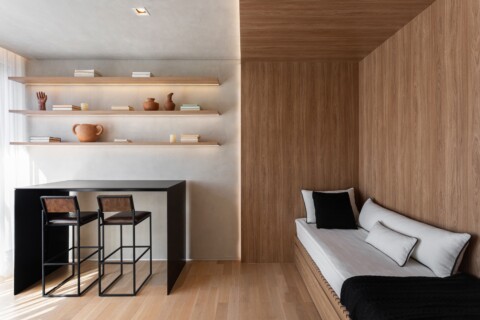 Já a metade restante da laje é destinada ao setor do escritório. Esse espaço parte da ocupação de um núcleo unificado, destinado às mesas de trabalho, sem nenhuma divisória ou setorização física. Dessa forma, garantimos a luminosidade adequada para todo o ambiente. O único elemento que divide o espaço faz referência ao conceito de fachada ativa: um volume central de marcenaria que, para além de uma simples divisória, cumpre também o papel de bancada de apoio para a copa, lockers e bancada de impressoras. Permeável ao olhar, duas grandes janelas localizadas nas extremidades desse volume integram visualmente os espaços, garantindo a privacidade necessária, tendo como filtro o elemento paisagístico.