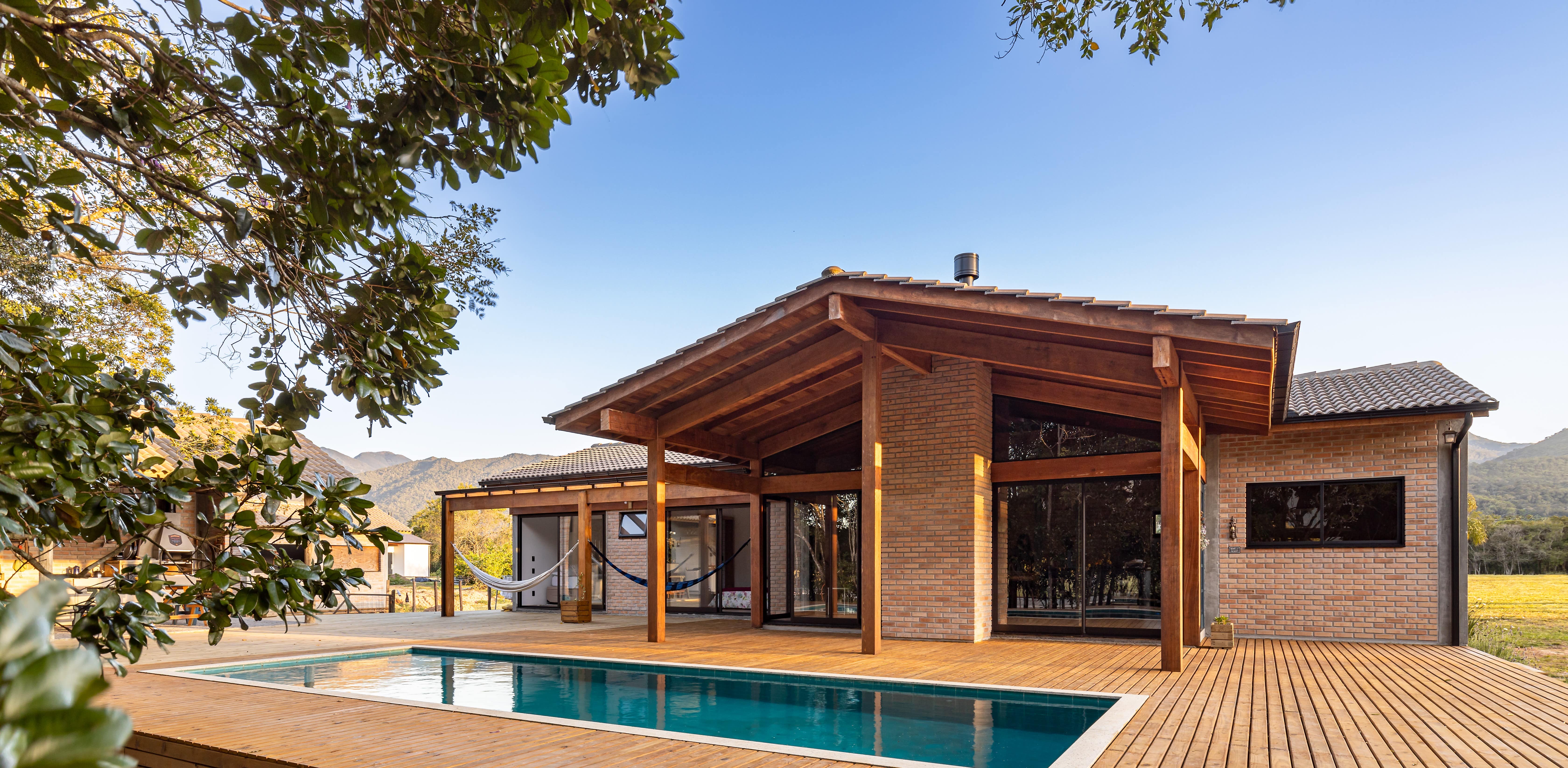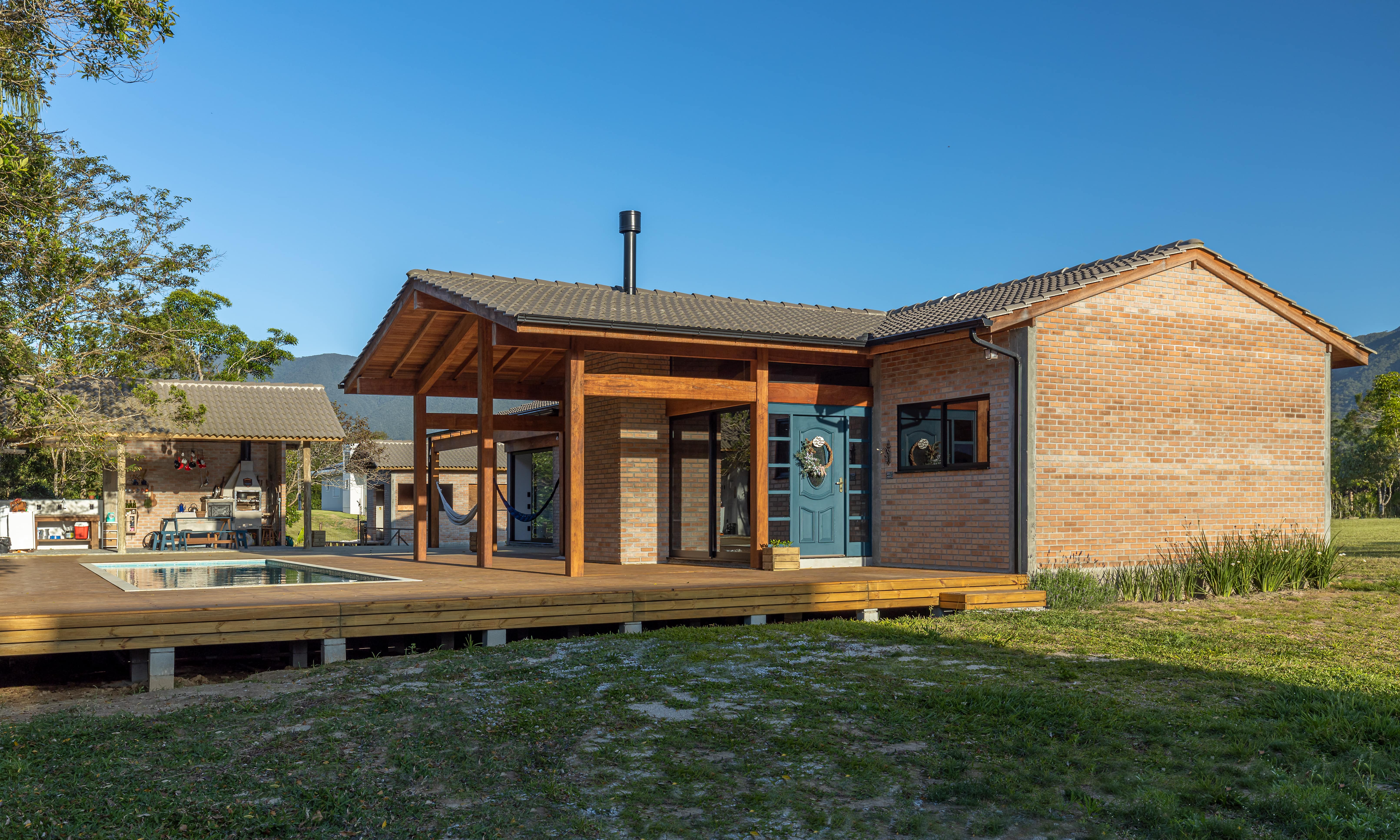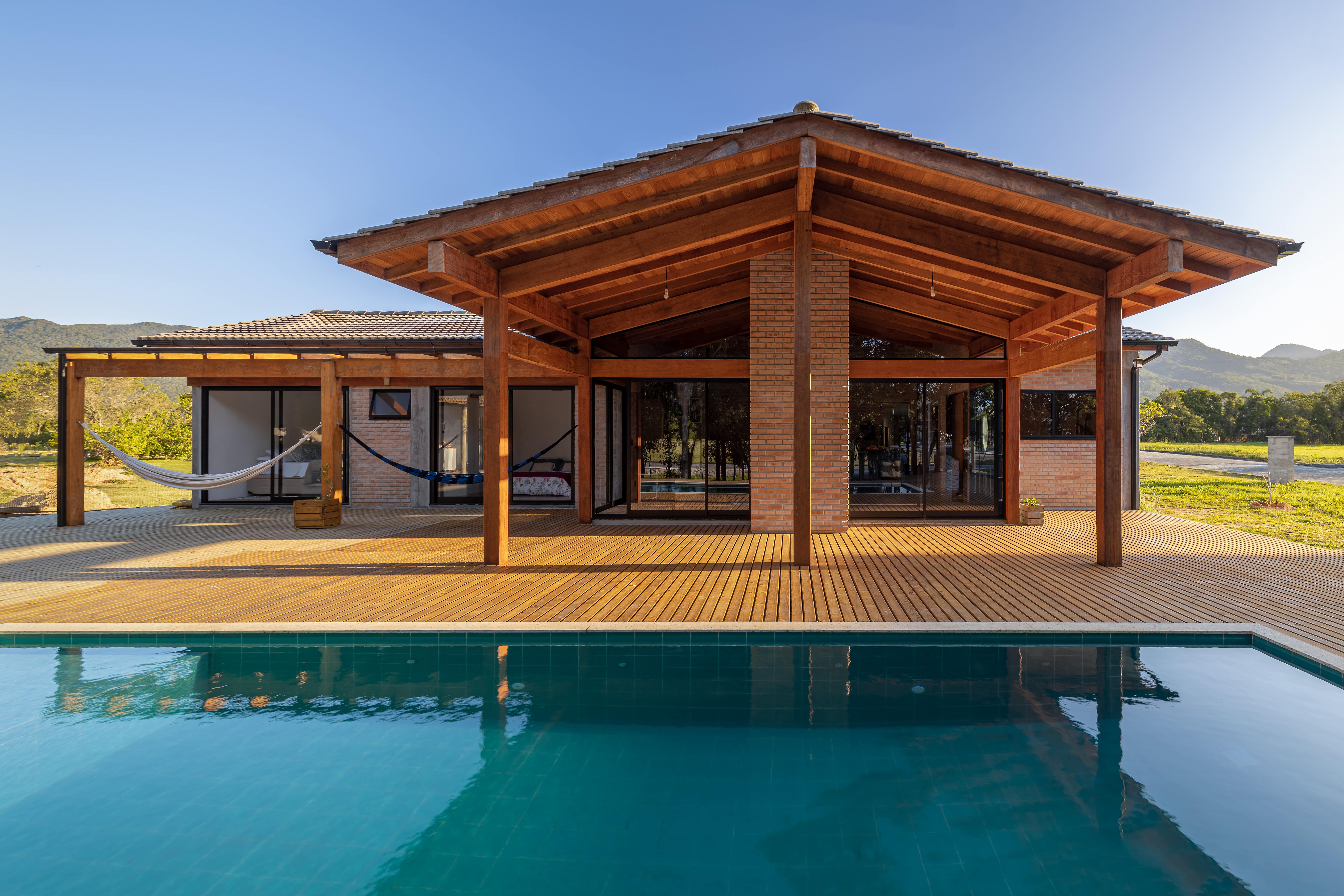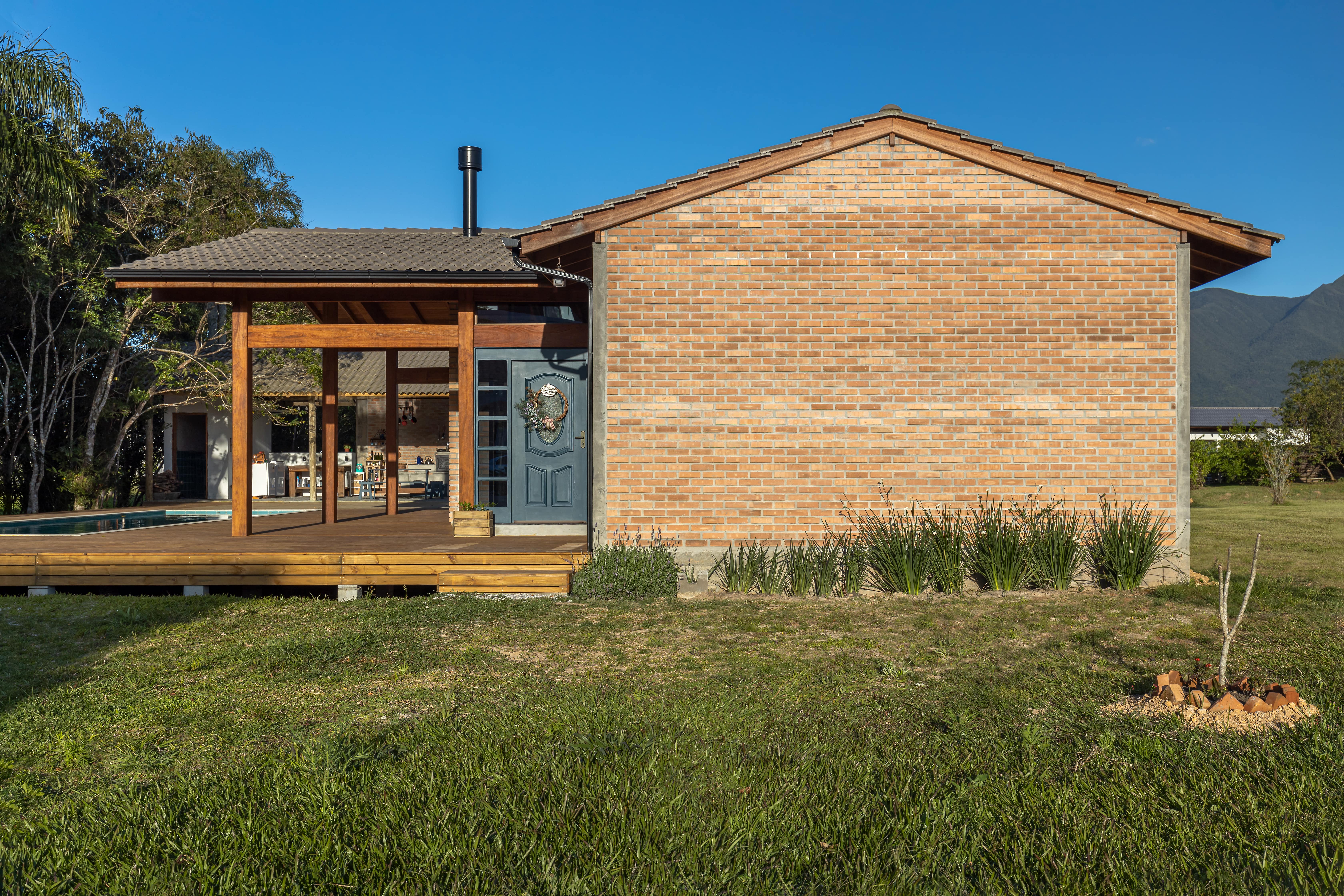 O conceito de casa de campo foi a diretriz principal para a escolha dos materiais e estilo arquitetônico, com a predominância da madeira e tijolo maciço, resultou em uma combinação minimalista e pura, convidando o entorno a compor o cenário, por um lado as árvores existentes a nordeste e a oeste o pôr do sol visto da piscina.