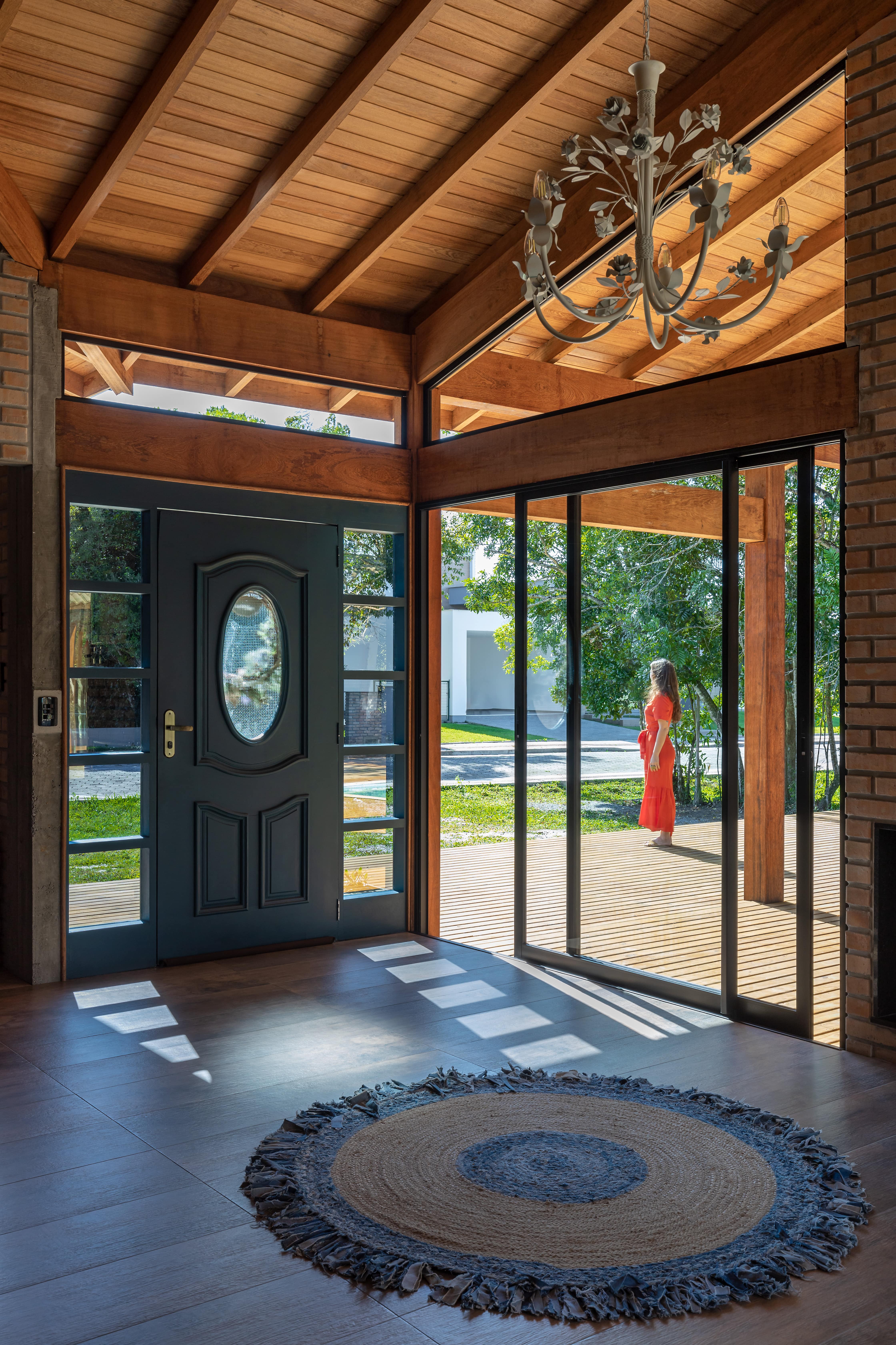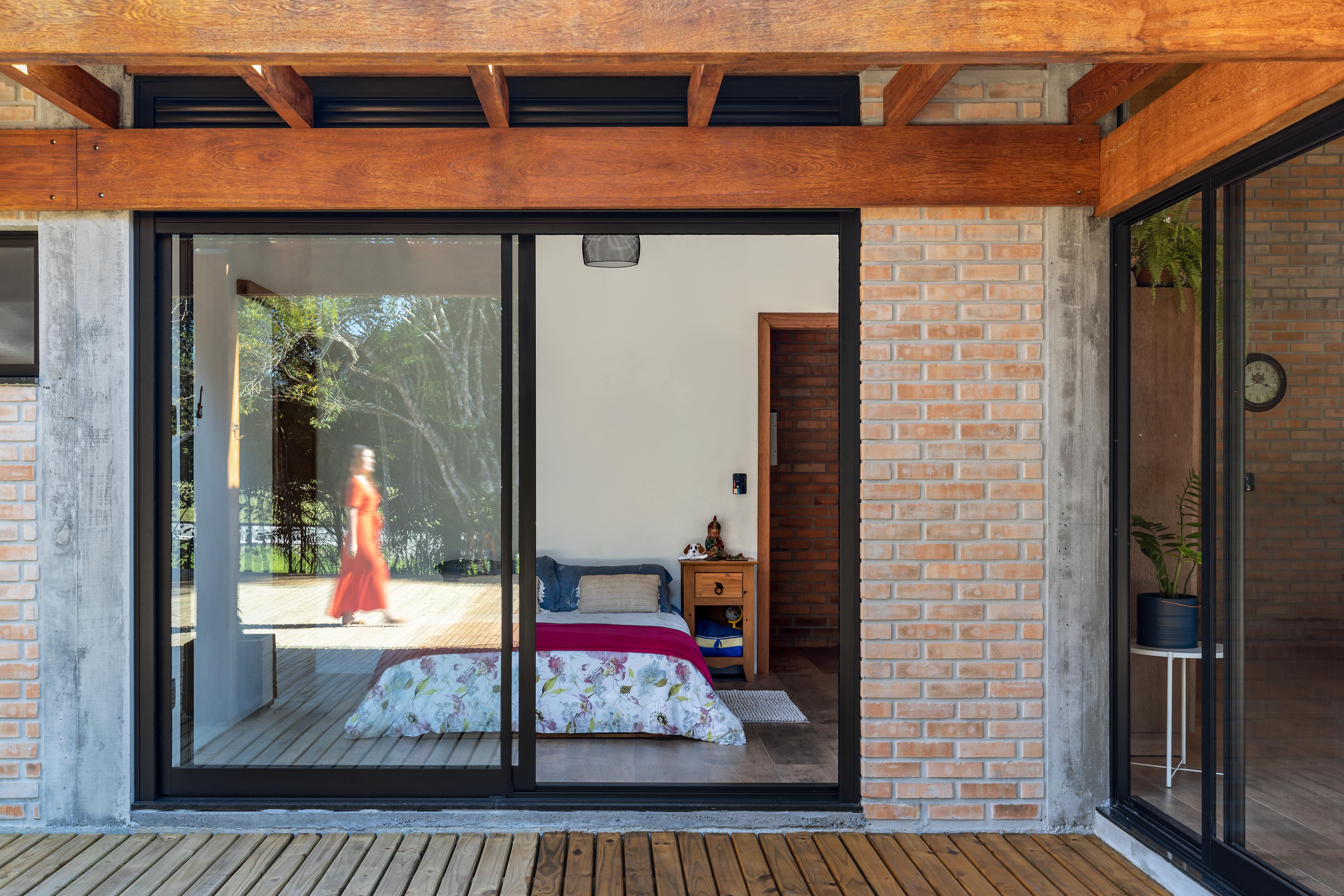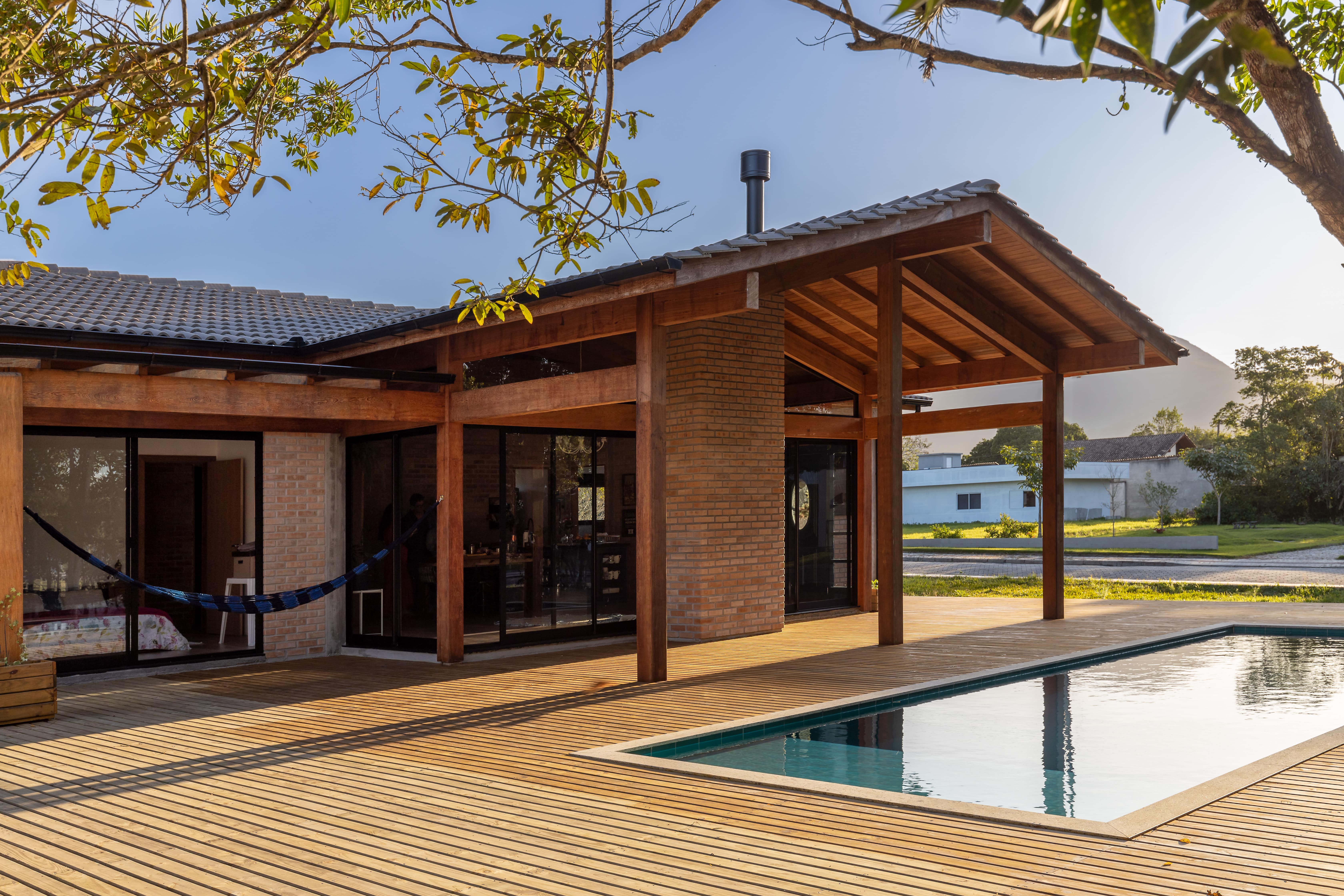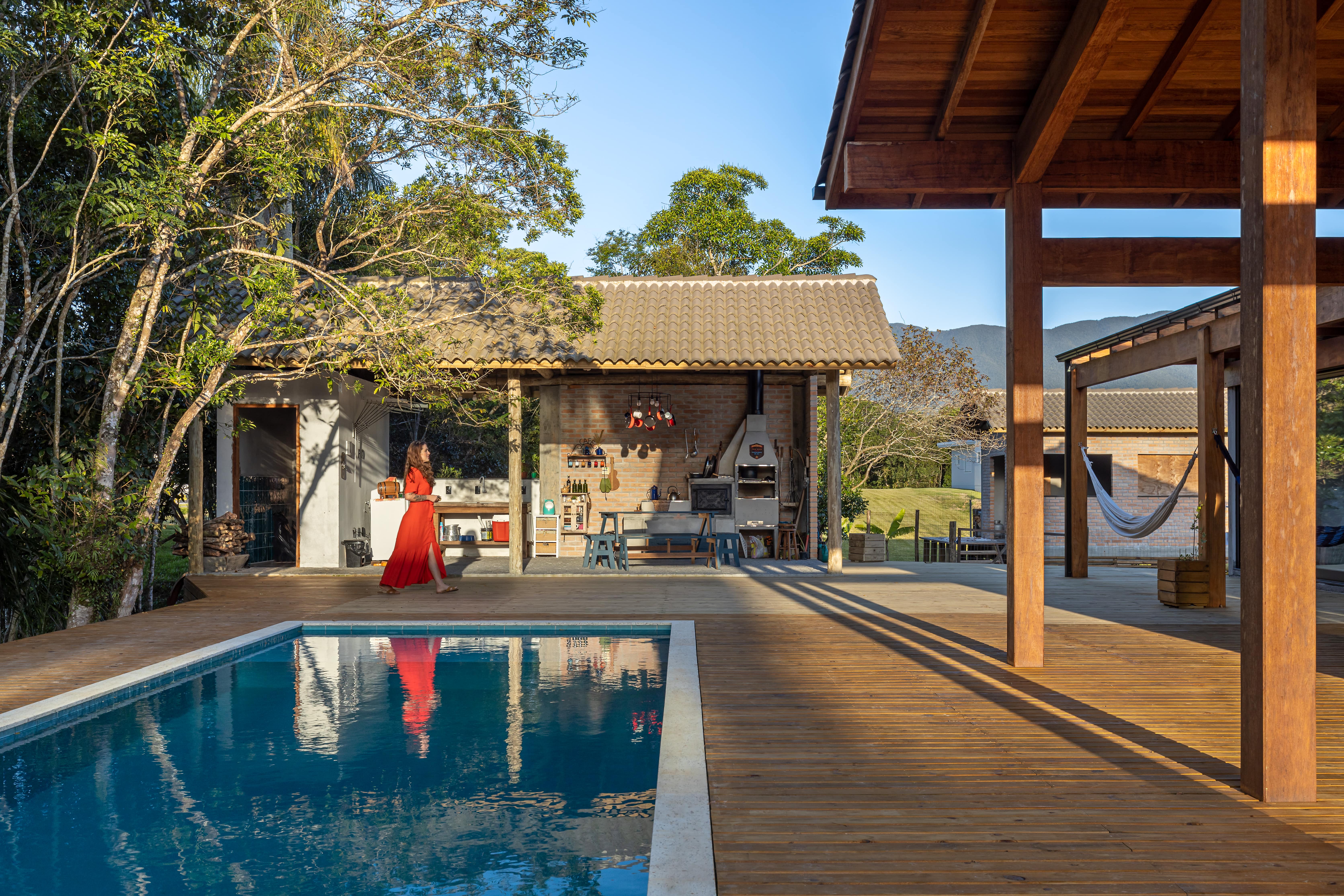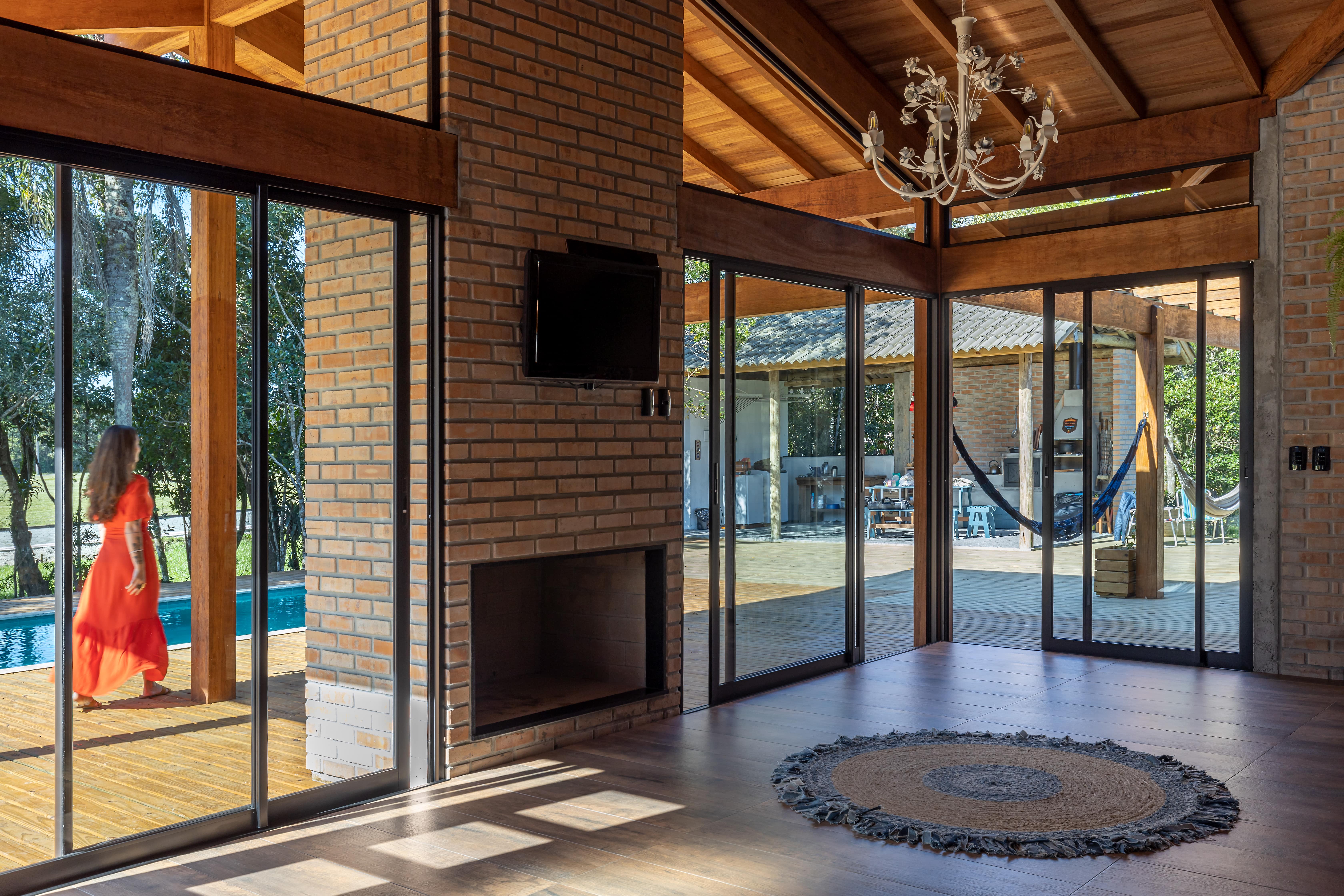O conceito de casa de campo foi a diretriz principal para a escolha dos materiais e estilo arquitetônico, com a predominância da madeira e tijolo maciço, resultou em uma combinação minimalista e pura, convidando o entorno a compor o cenário, por um lado as árvores existentes a nordeste e a oeste o pôr do sol visto da piscina.