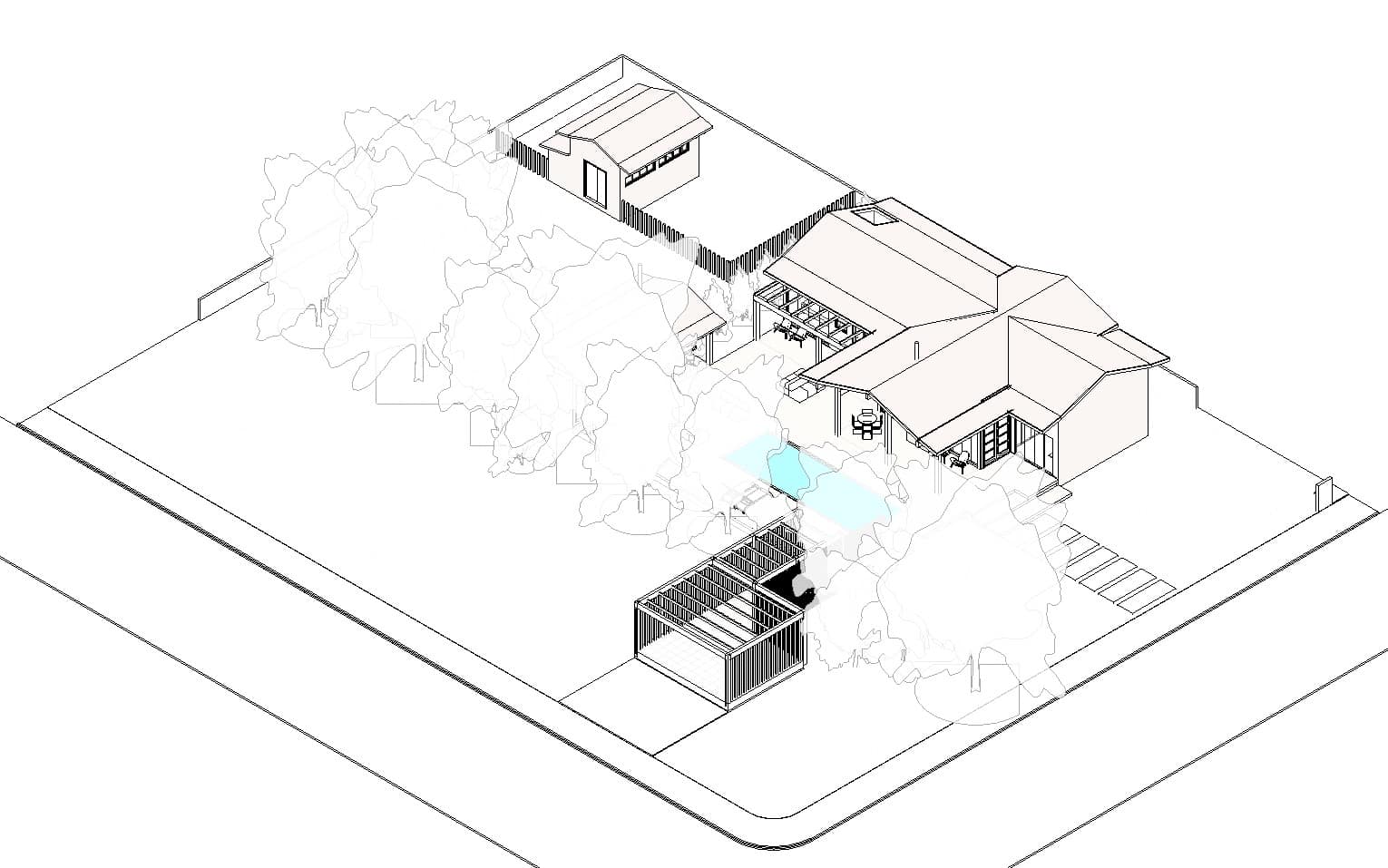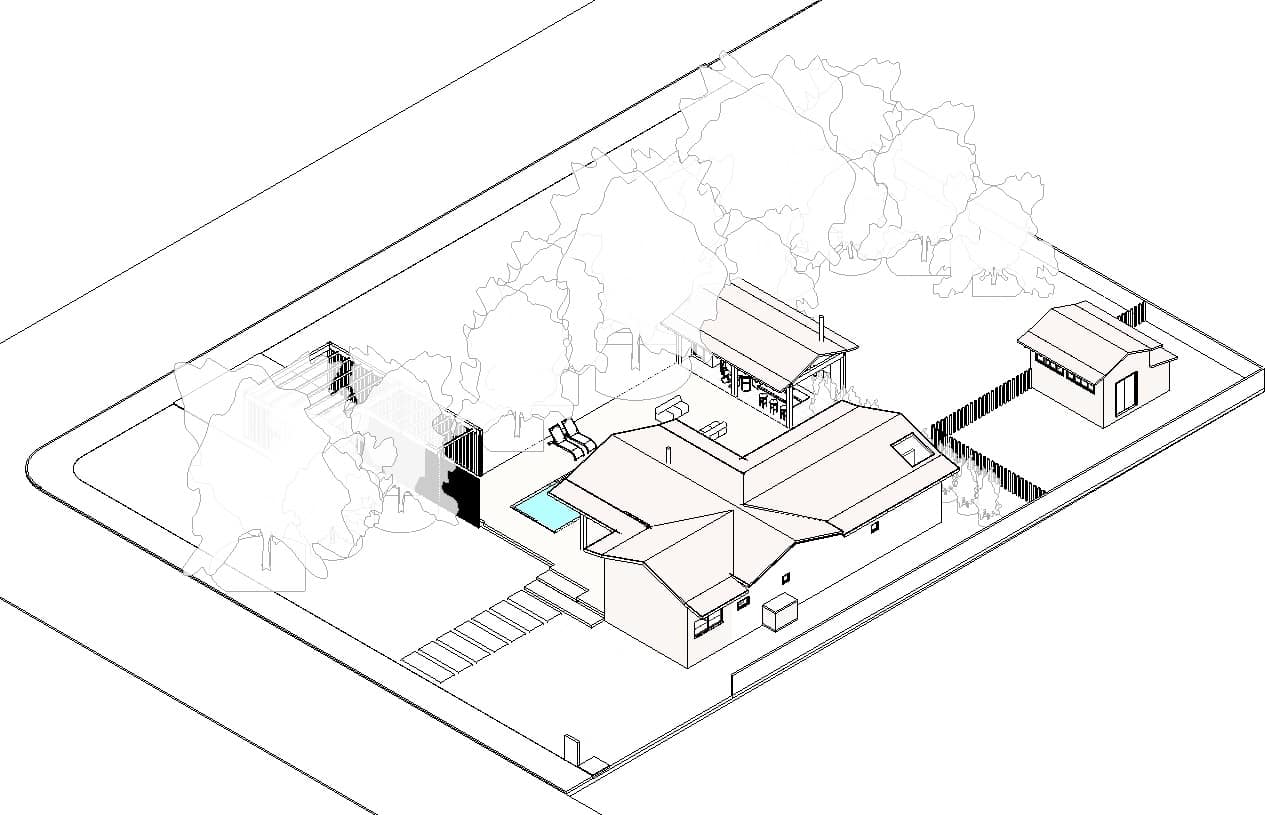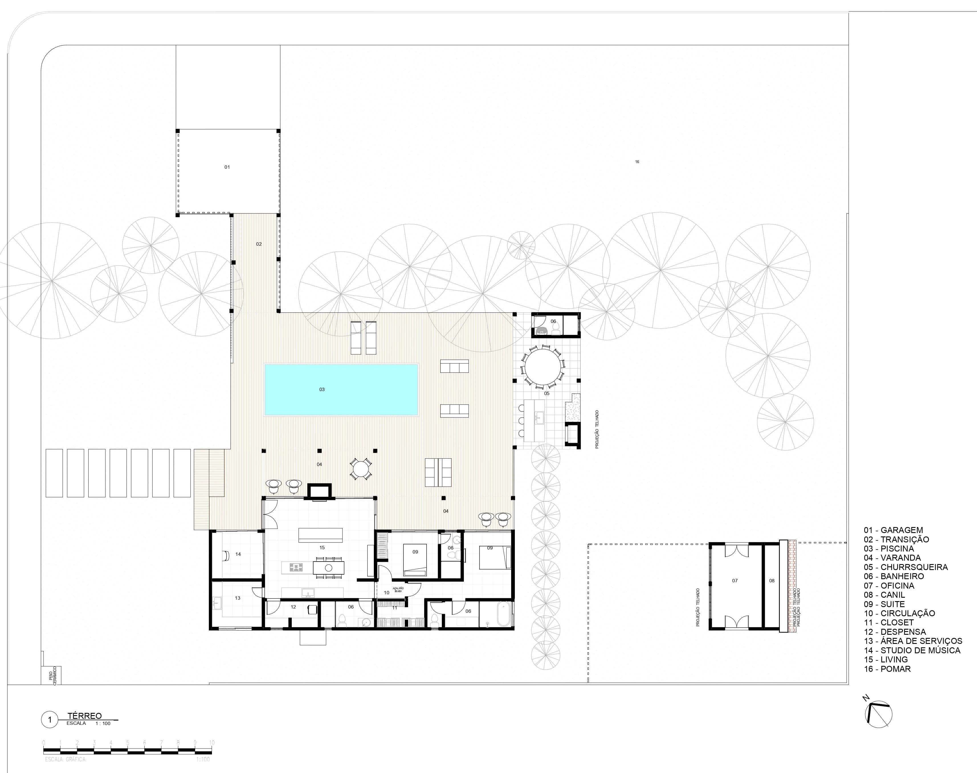 A planta foi concebida com as áreas sociais e íntimas voltadas para a vegetação local e a leste, com as árvores auxiliando na temperatura e incidência solar. Já os ambientes de serviços estão situados atrás dos ambientes sociais e íntimos, na divisa com a fachada sul que também é divisa com o lote vizinho, já prevendo que futuramente terá uma nova casa e que essa fachada terá que proporcionar privacidade a todos.