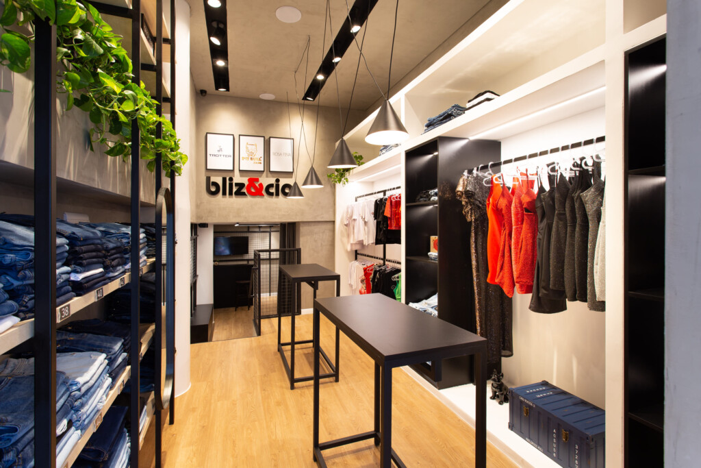 Os perfis metálicos e a iluminação compõem não só o caráter funcional de expor e iluminar os produtos, respectivamente, mas também como elementos direcionais que vão revelando, no decorrer da loja, os expositores e os pontos de interesse, rompendo com qualquer monotonia de um ambiente estreito e comprido. O cliente tem um percurso pelo qual, sutilmente, é guiado e surpreendido com diferentes experiências.