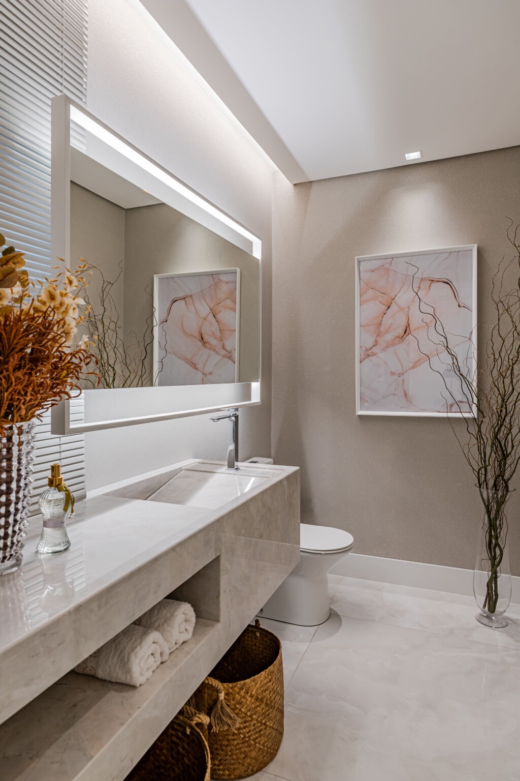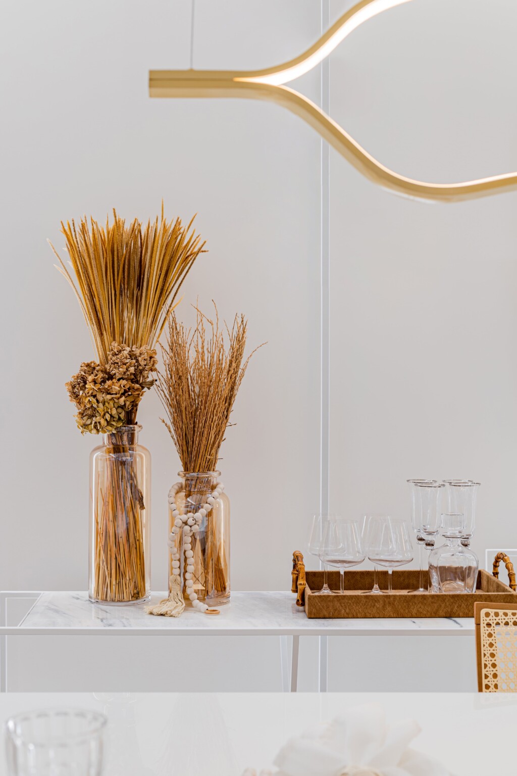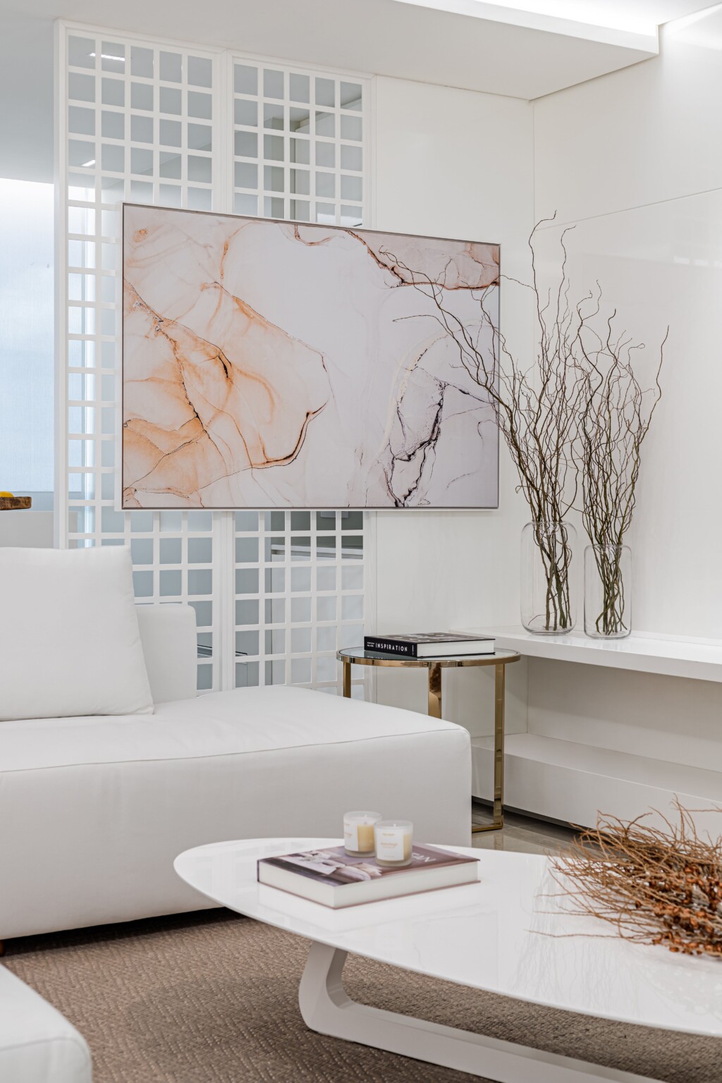 O uso de galhos secos e vasos como objetos decorativos traz uma conexão com a natureza, criando um contraste sutil com a modernidade do espaço. Esses elementos orgânicos ajudam a suavizar o ambiente, introduzindo texturas naturais e adicionando um toque de rusticidade ao design altamente refinado.