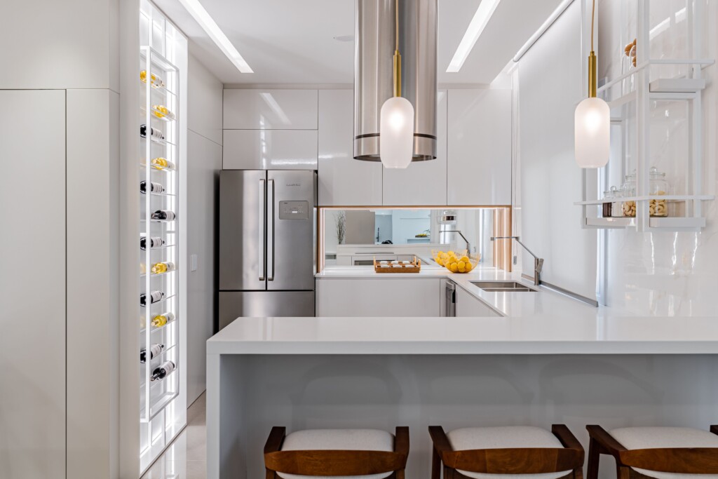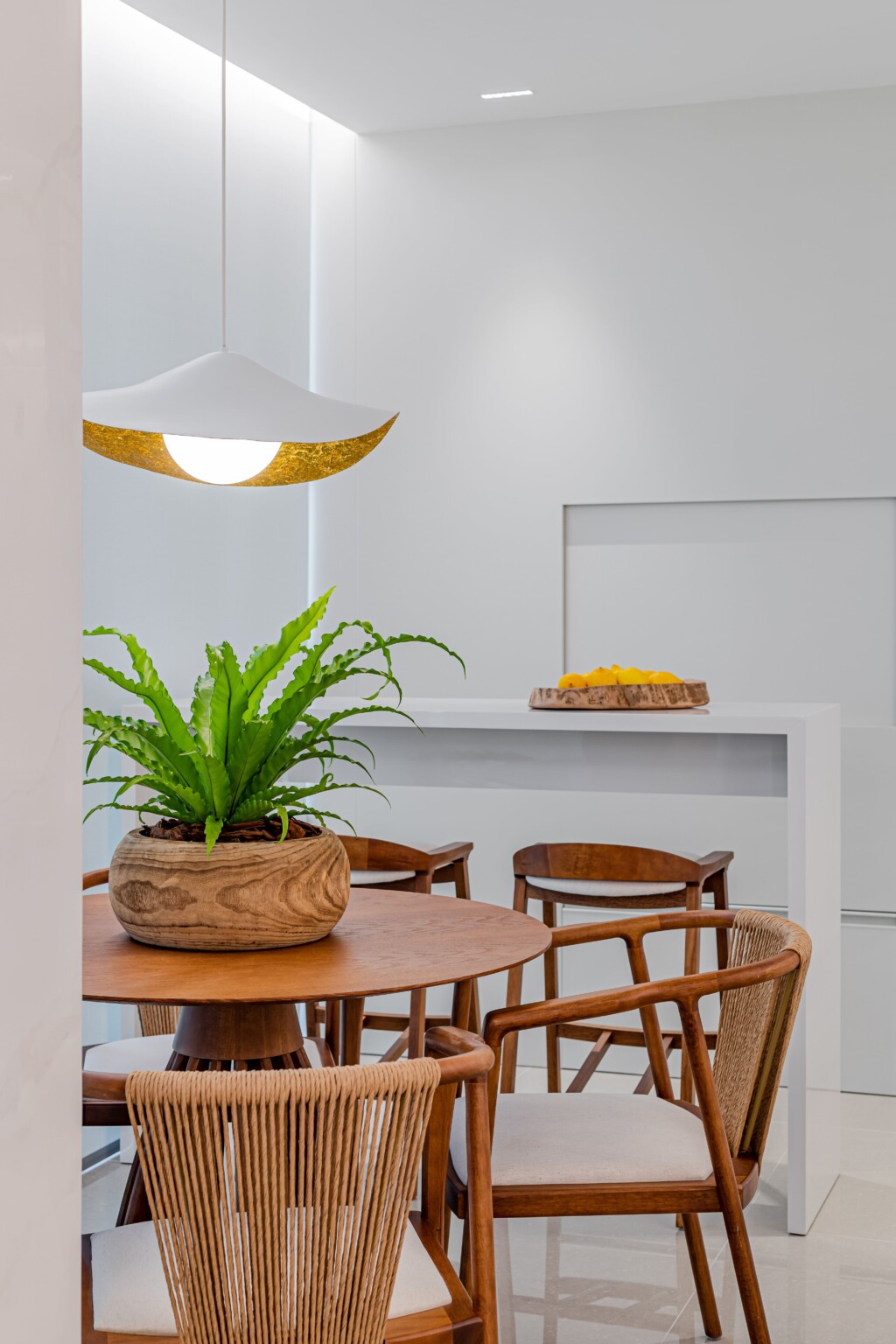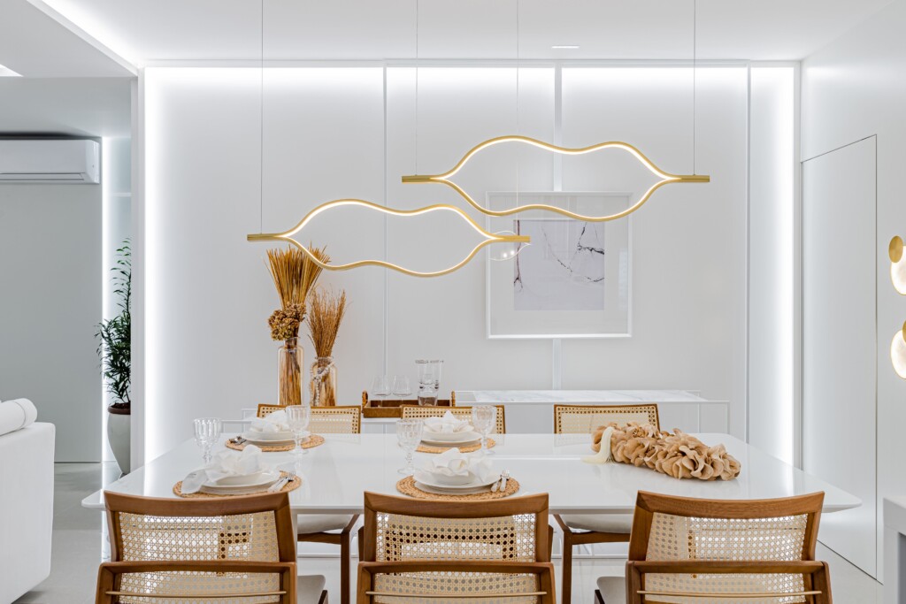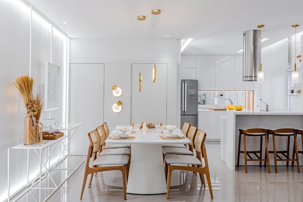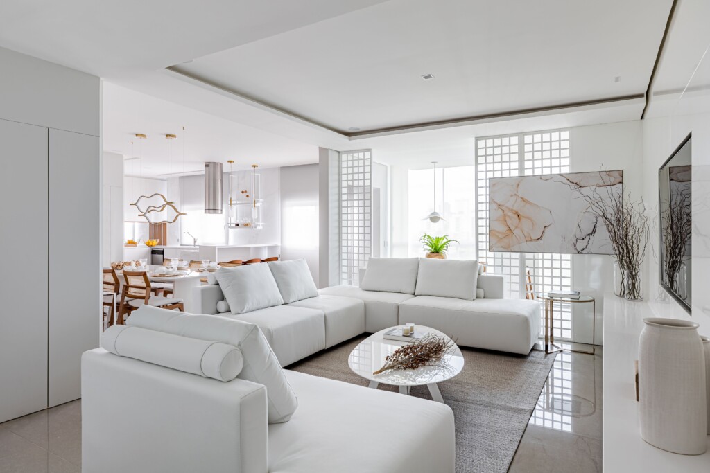 O uso do branco em quase todos os elementos, desde os móveis até as paredes, cria uma atmosfera neutra e atemporal. Essa escolha de cor amplifica a luz natural, tornando o espaço mais claro e arejado, além de proporcionar uma sensação de amplitude.
