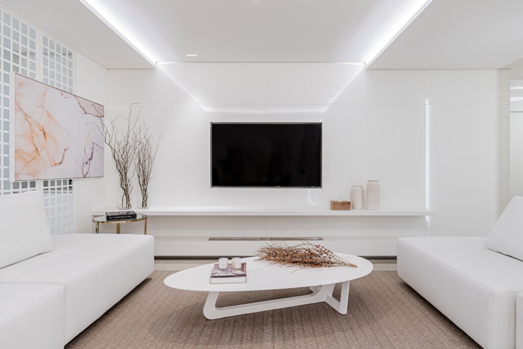 A iluminação indireta no teto contribui para uma sensação de aconchego, mesmo em um ambiente tão claro e minimalista. A luz suave cria profundidade e realça os detalhes arquitetônicos, enquanto reforça a estética limpa do espaço.