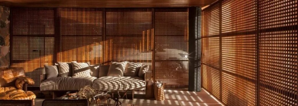 Para a área lazer externa podem apostar no uso do muxarabi em forma de pergolado. Na etapa de como fazer muxarabi, seu design e suas tramas podem seguir inclusive a arquitetura do imóvel em questão, facilitando a conexão entre os elementos construtivos.