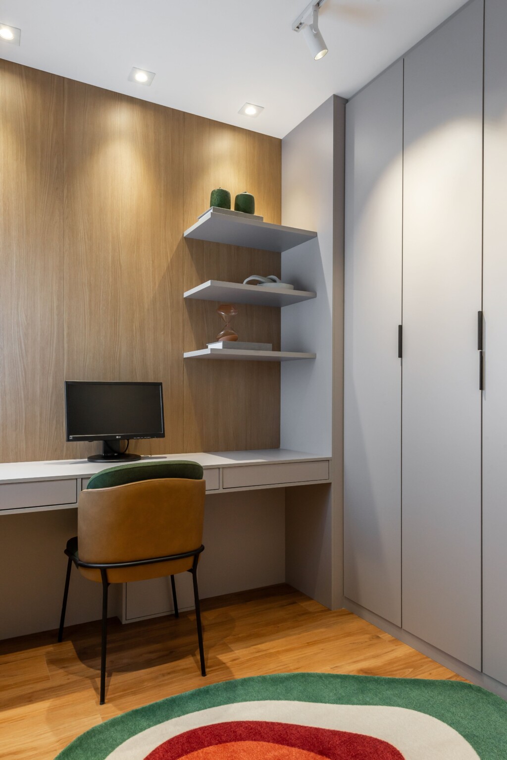 A proposta foi cores neutras balanceadas com tons mais fortes marcantes, que ajudará a dar continuidade nos ambientes, e então colocar pontos de cor através de objetos decorativos ou mesmo através do mobiliário.