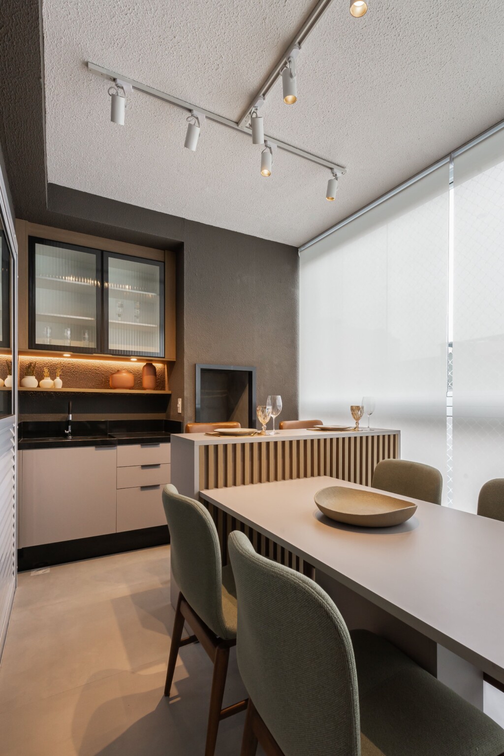 O terraço gourmet a proposta foi de um ambiente acolhedor e funcional, com uma mesa de refeições, bancada e um espaço para café e cervejeira.