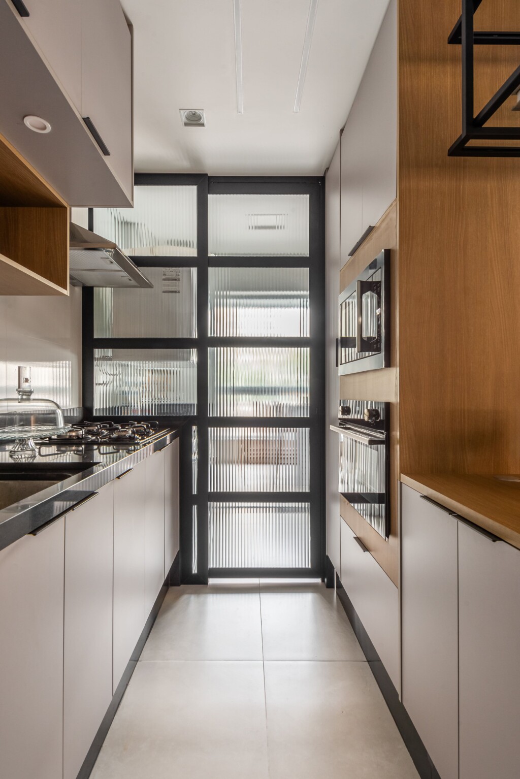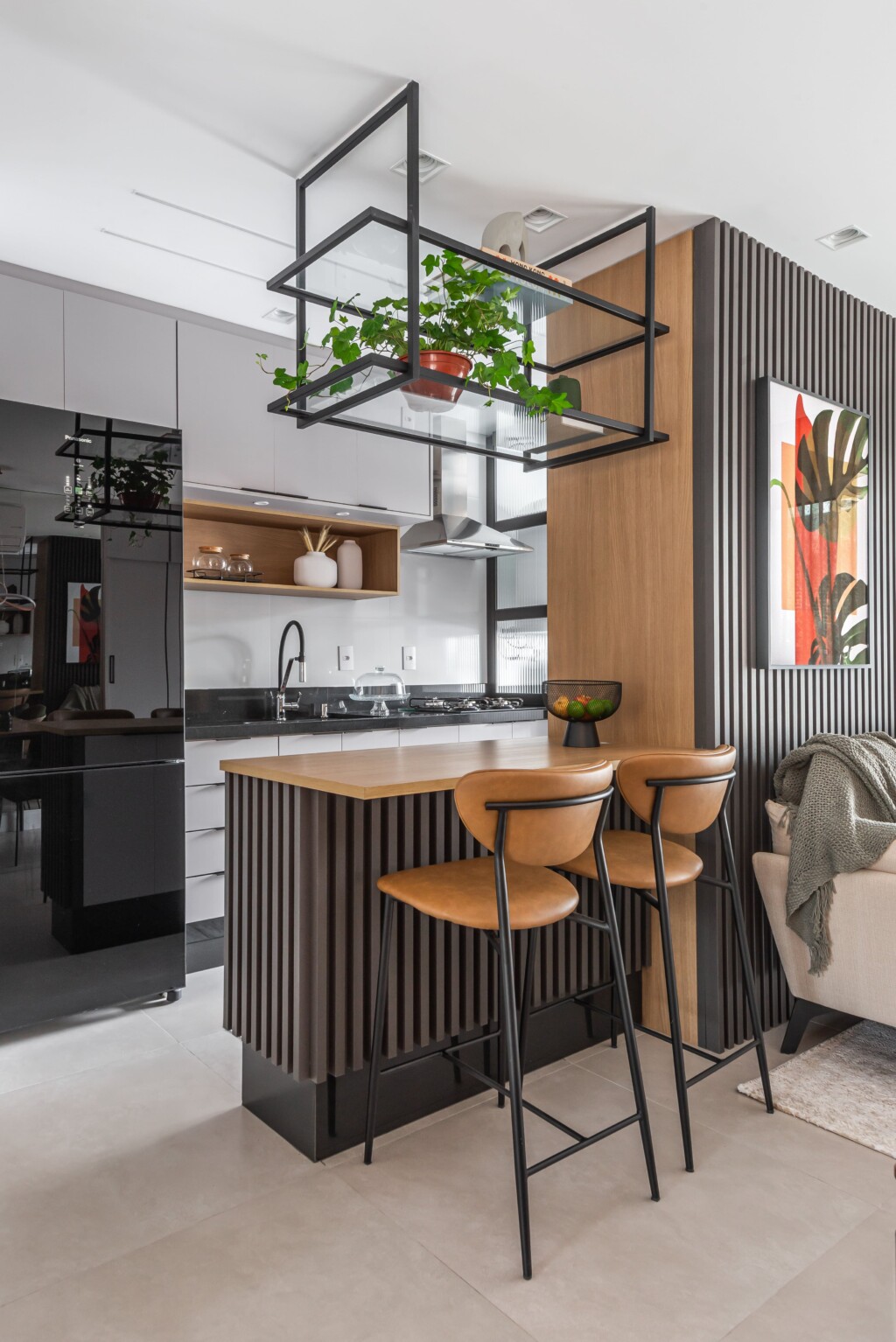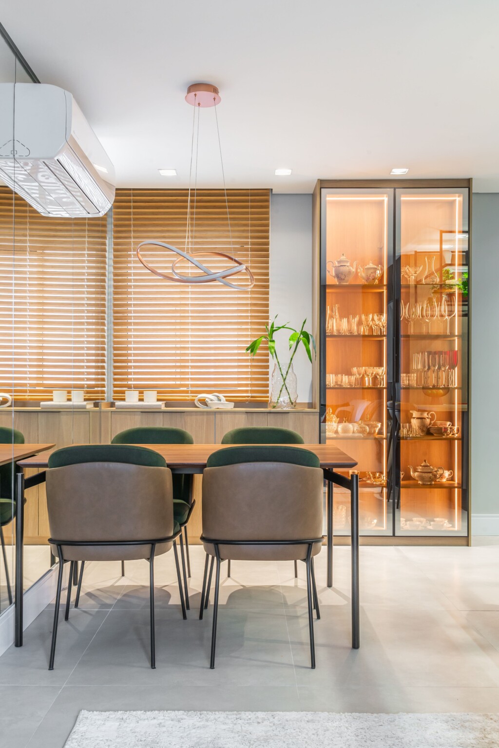 A iluminação do projeto buscamos valorizar mais os pontos fortes, com uma luz difusa e acolhedora para a sala de jantar e estar e também pontos de iluminação mais direta na cozinha, deixando o ambiente mais bonita e confortável.
