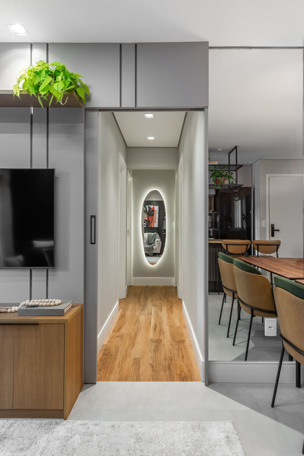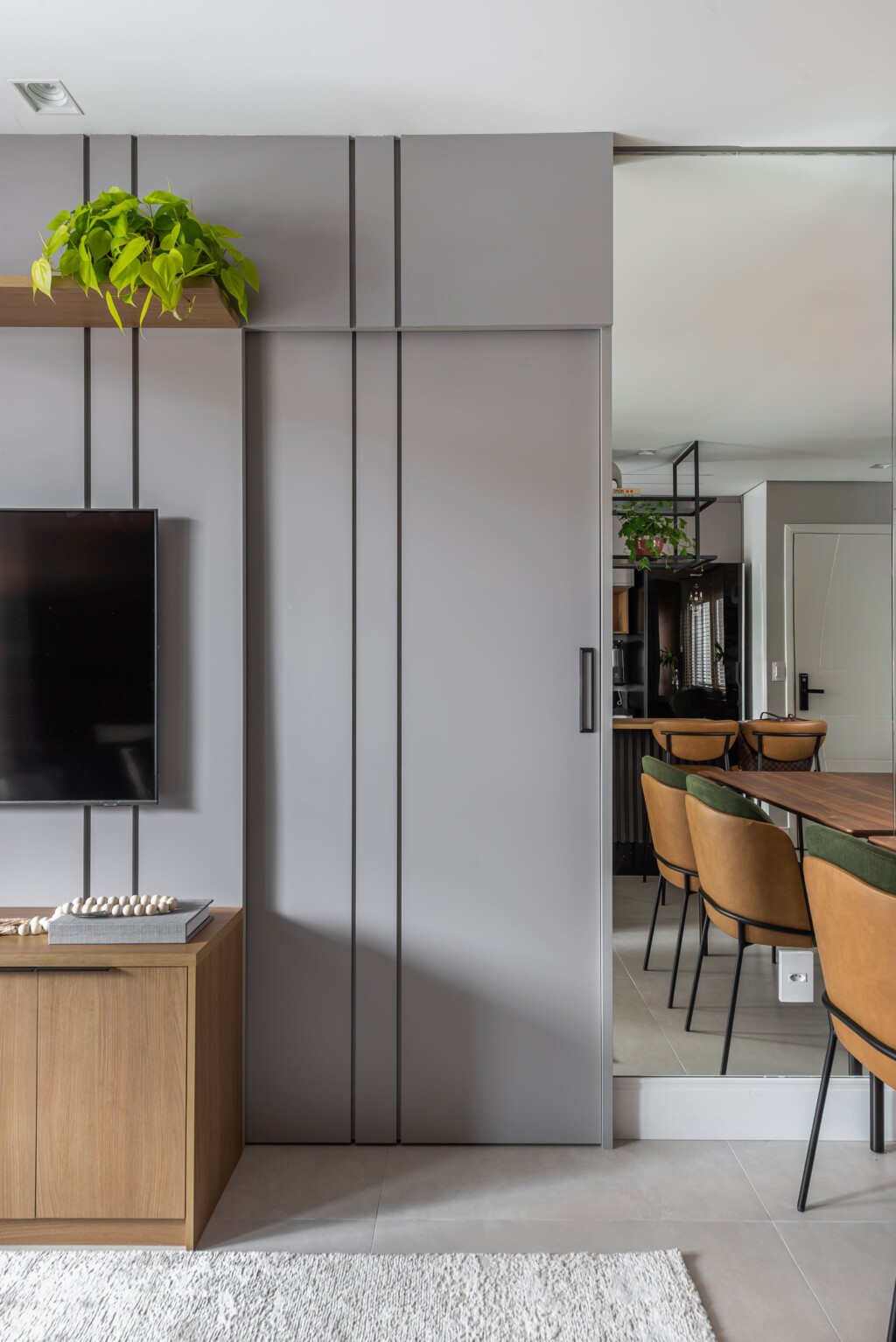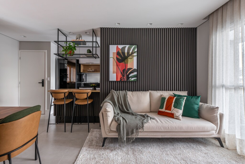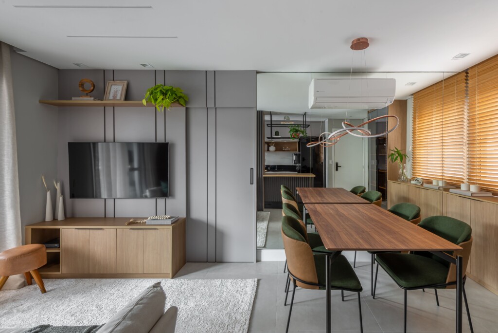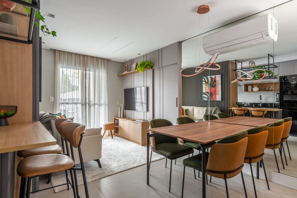 Nesse apartamento de 70m², a Integração dos ambientes com a cozinha americana, sala de jantar e TV, nesse projeto buscamos praticidade e dinamismo e conforto, afinal de contas, aqui você vai integrar os três ambientes valorizando mais a circulação pelos espaços e, também, seu conforto social.