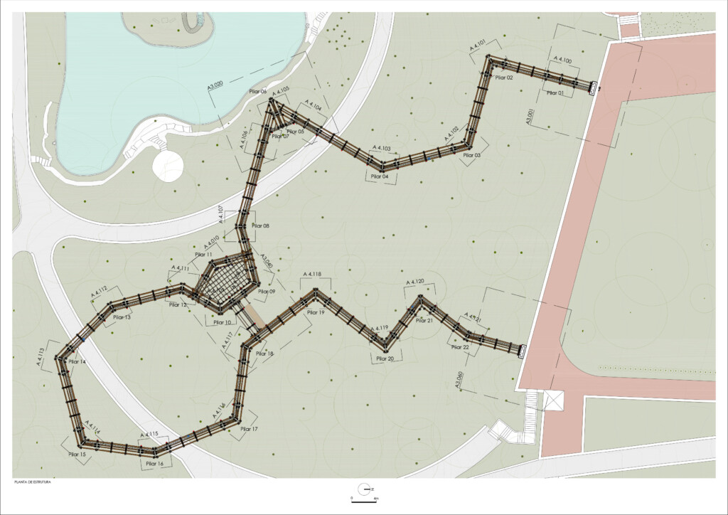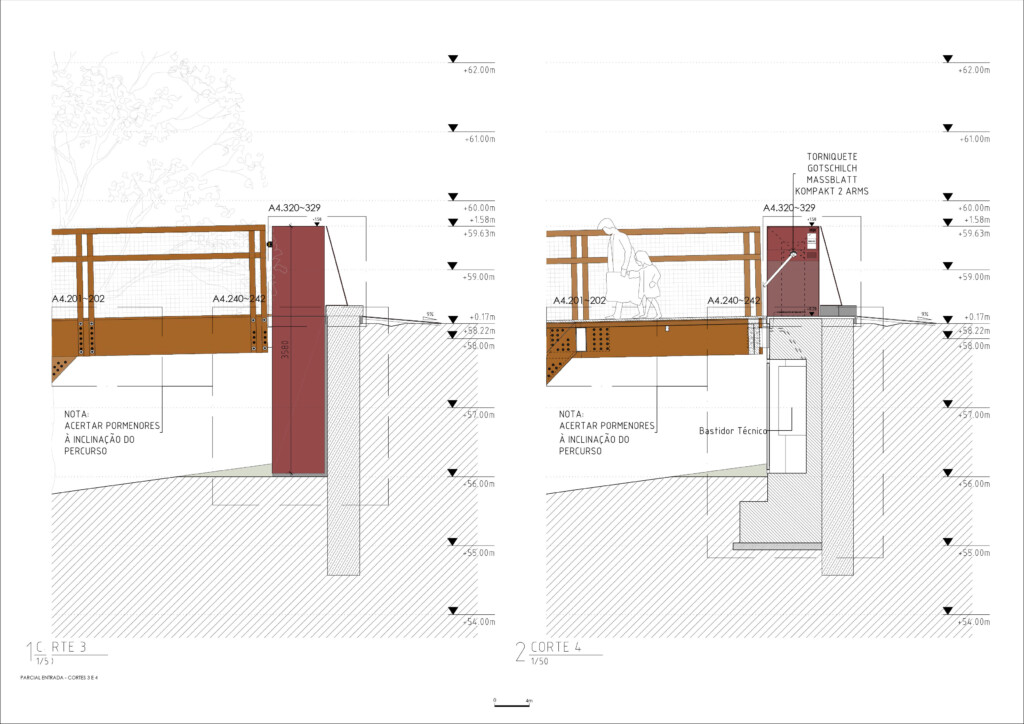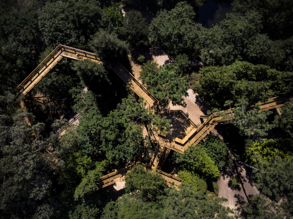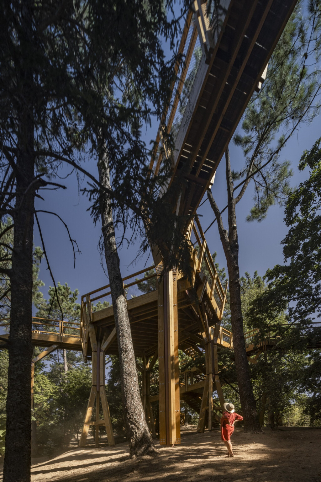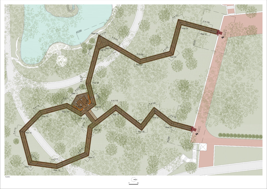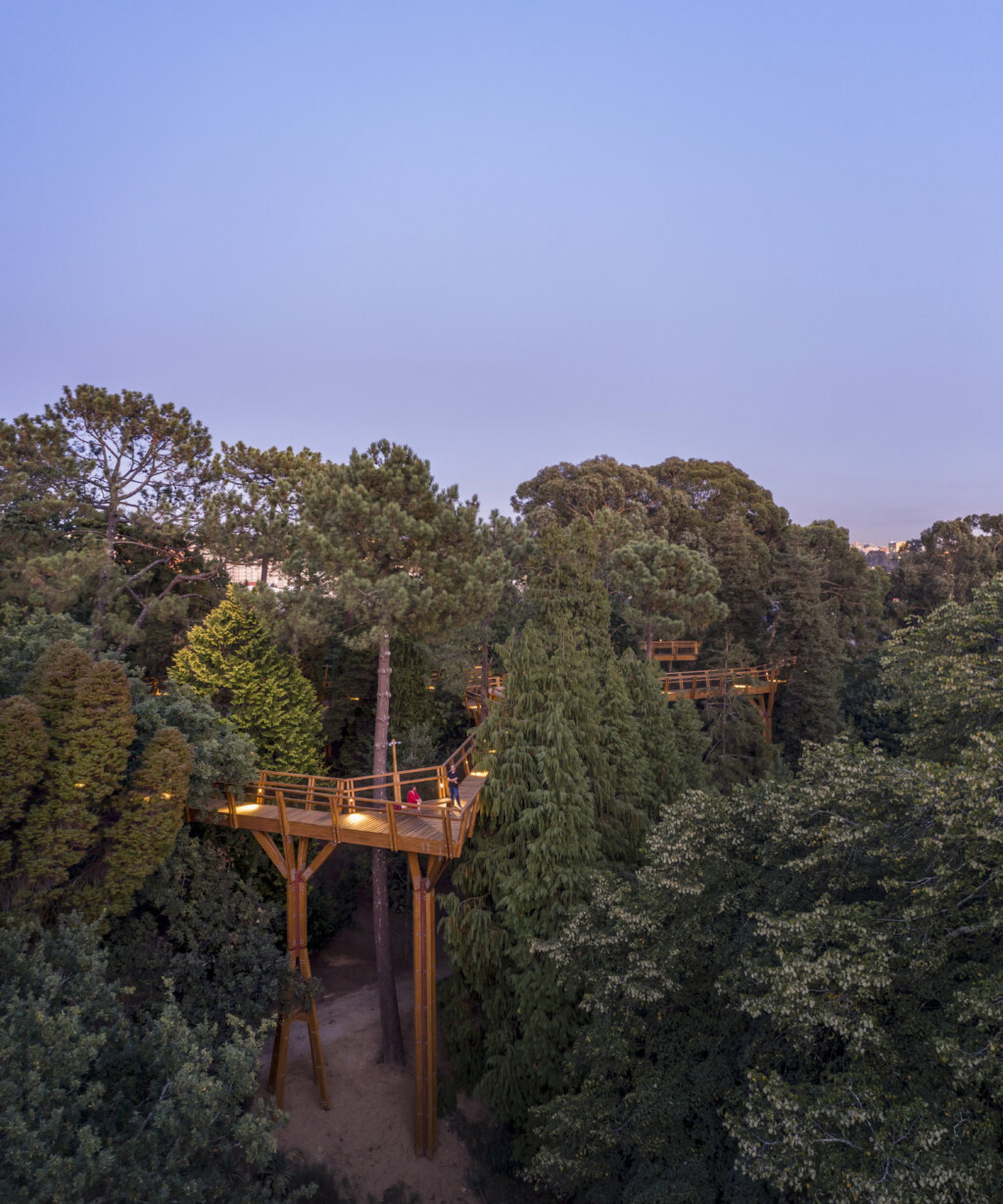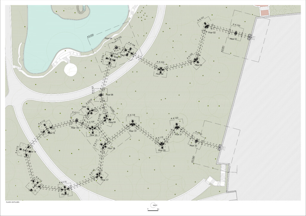 "Percurso elevado de Serralves. Visitar Serralves é sempre percorrer um percurso no espaço, no tempo ou no tempo do espaço. Criar um percurso, complementar aos existentes, só poderia ser por entre as copas das belas e imponentes árvores do Parque."