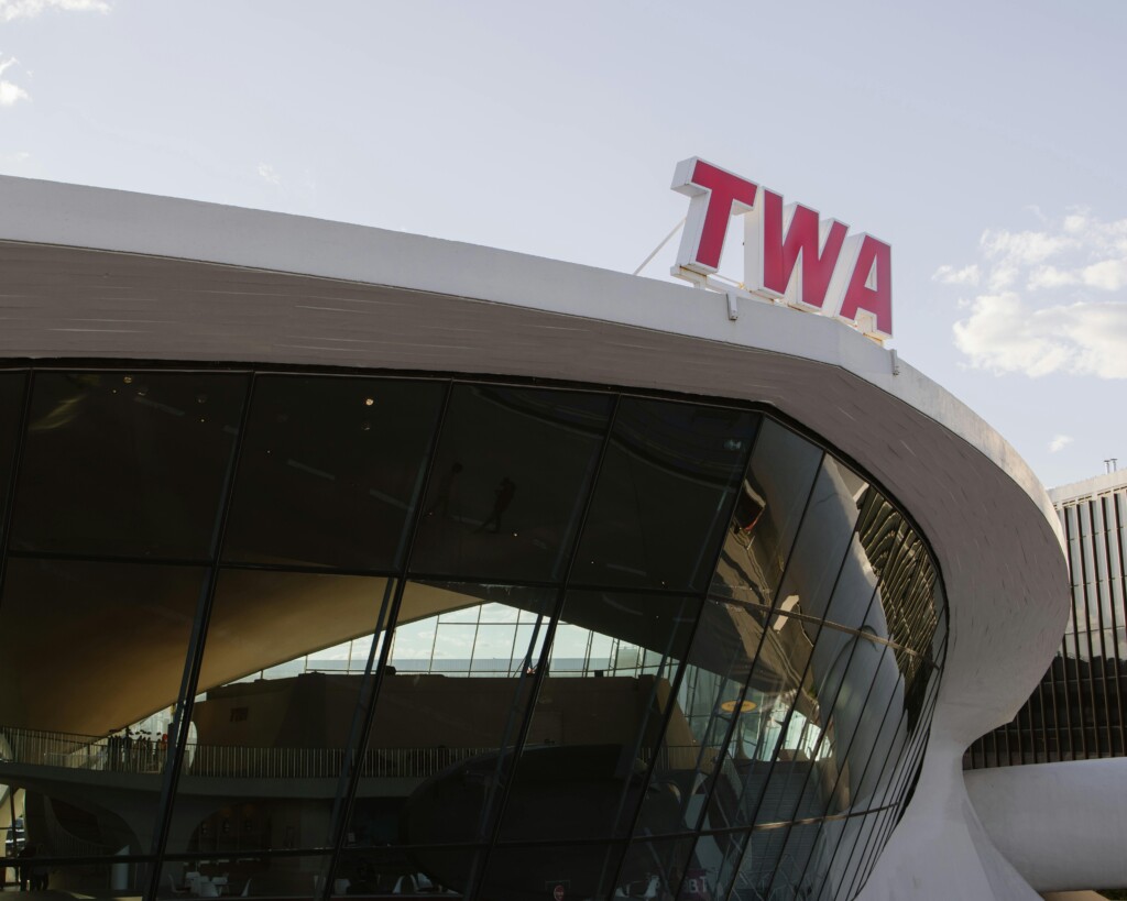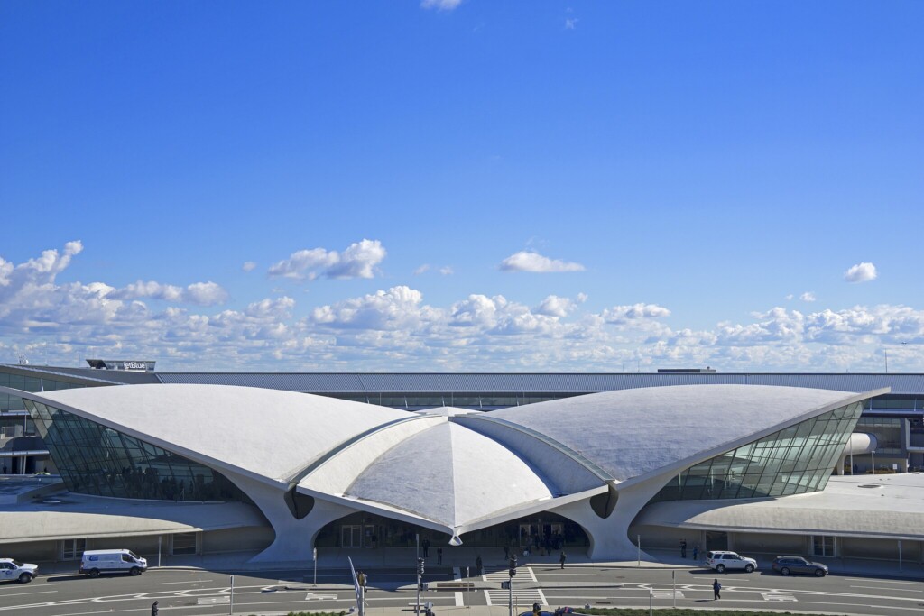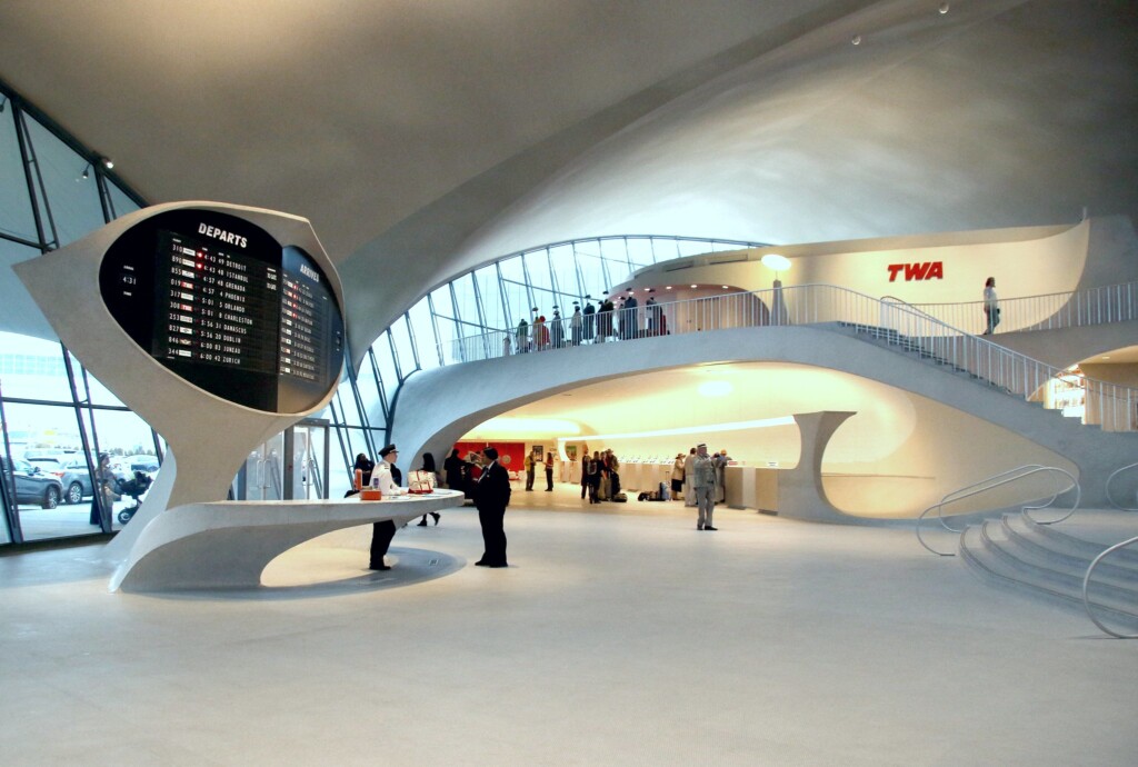 Projetado por Eero Saarinen e inaugurado em 1962 no Aeroporto Internacional JFK, em Nova York, o TWA Flight Center foi concebido para representar a nova era do transporte aéreo. Suas linhas curvas e estrutura em concreto foram calculadas para criar um espaço amplo, sem colunas internas, que permitia circulação desobstruída e orientação visual clara. O objetivo era transformar o embarque e desembarque em uma experiência eficiente e marcante.