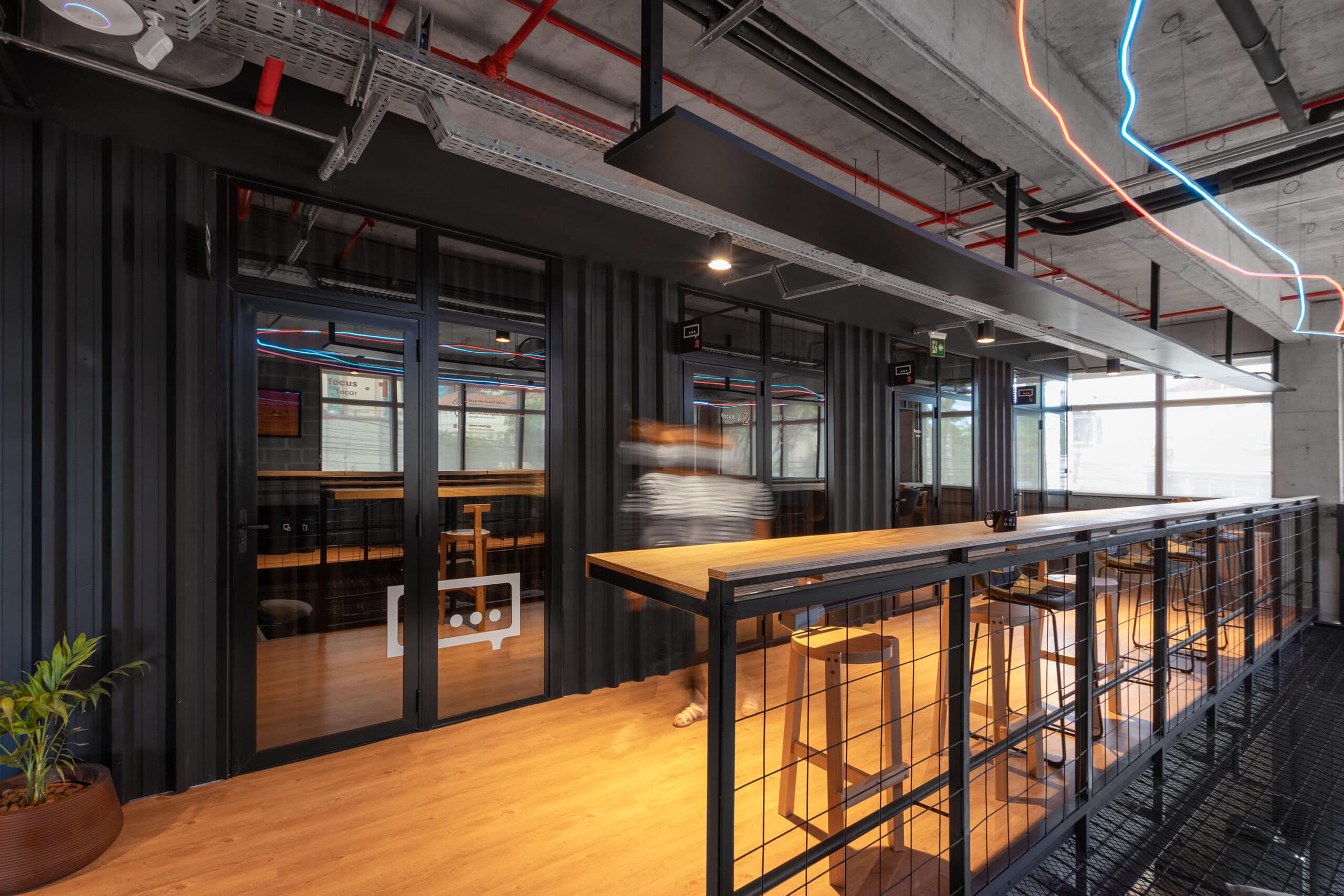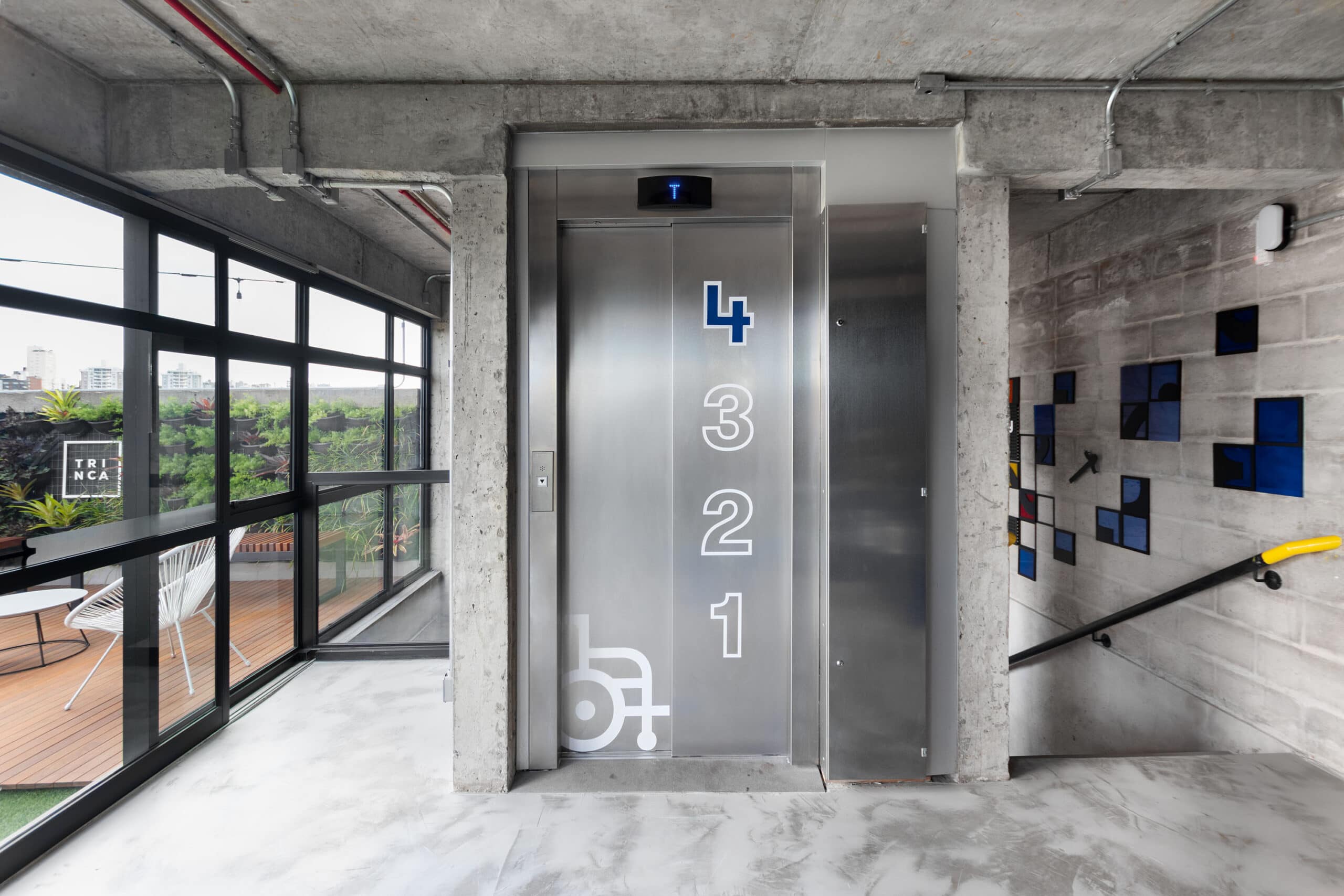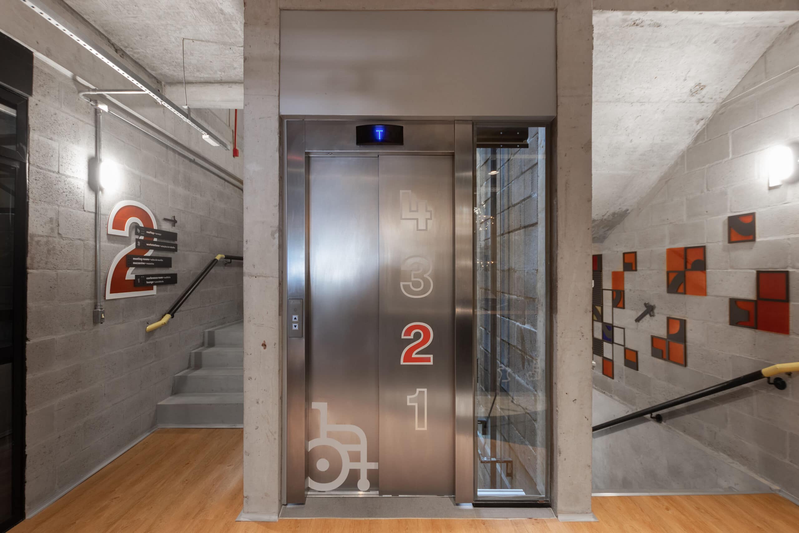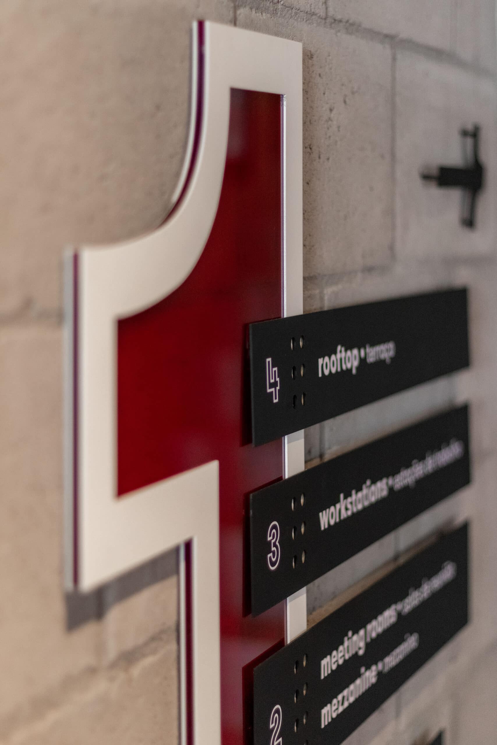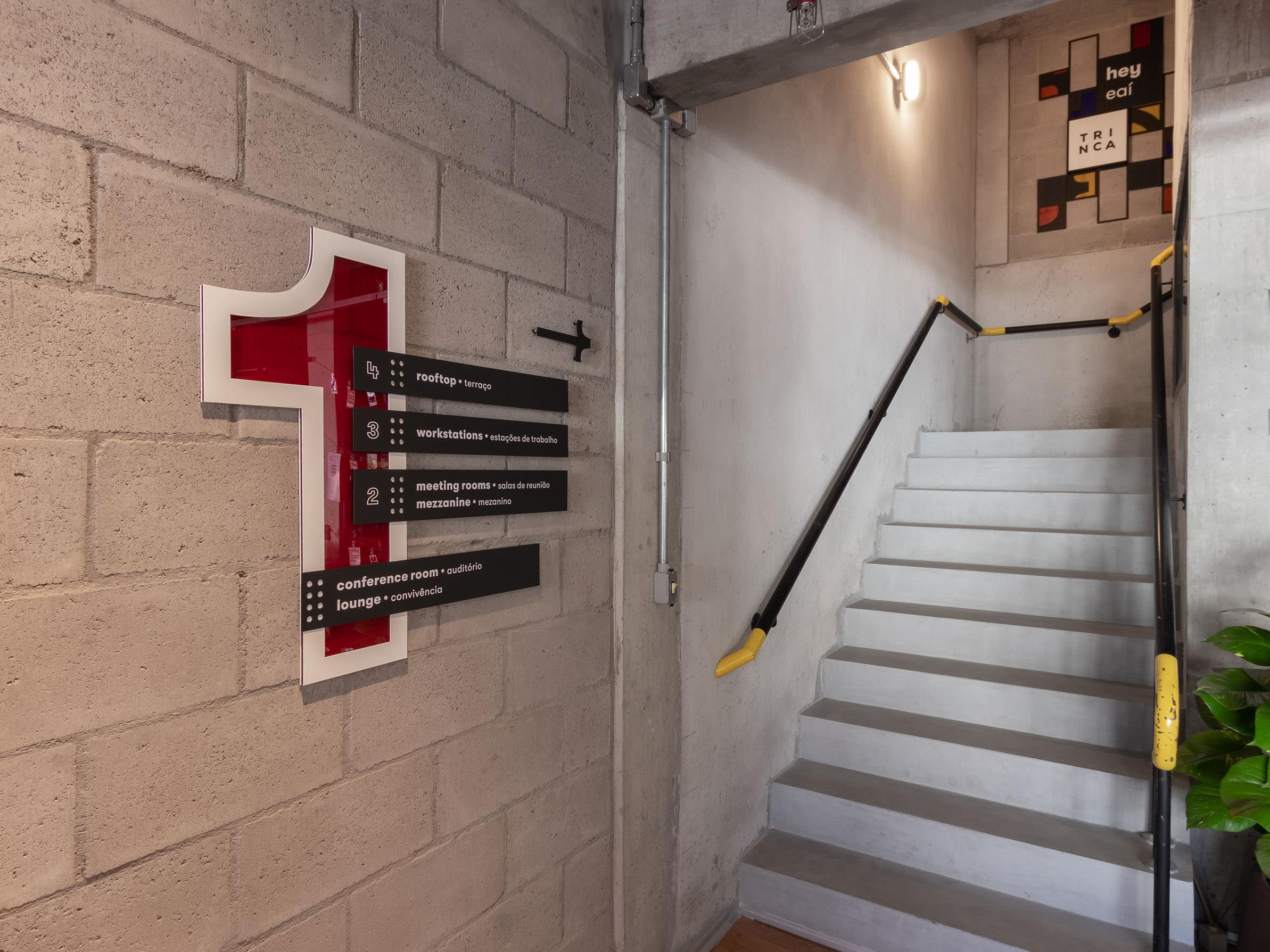 A construção dos elementos do sistema de sinalização foi orientada pela modulação dos blocos de concreto, elementos construtivos do prédio. A escolha de materiais e acabamentos transparentes alinhou-se ao conceito proposto pela arquitetura: preservar a verdade dos materiais e dos espaços. Para estimular o uso de escadas, elementos direcionais e ambientações interativas preenchem a circulação vertical ao longo dos andares. Por fim, a paleta cromática foi definida com base em tons vibrantes, utilizando-se de cores primárias e uma cor de apoio para codificação dos 4 pavimentos. A composição da paleta faz alusão ao pôr do sol, tendo em vista o apreço da equipe pelo momento visível em seu rooftop.