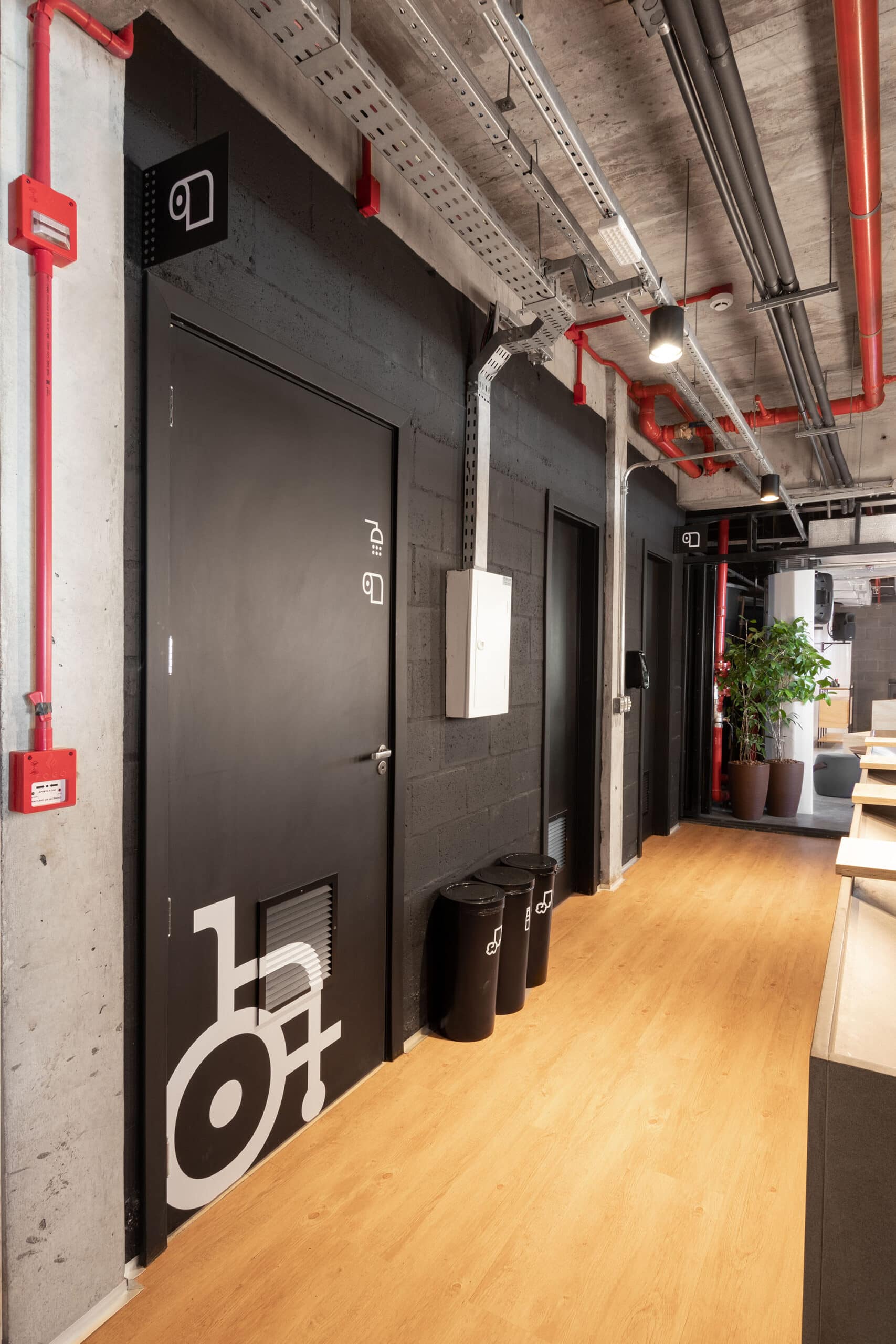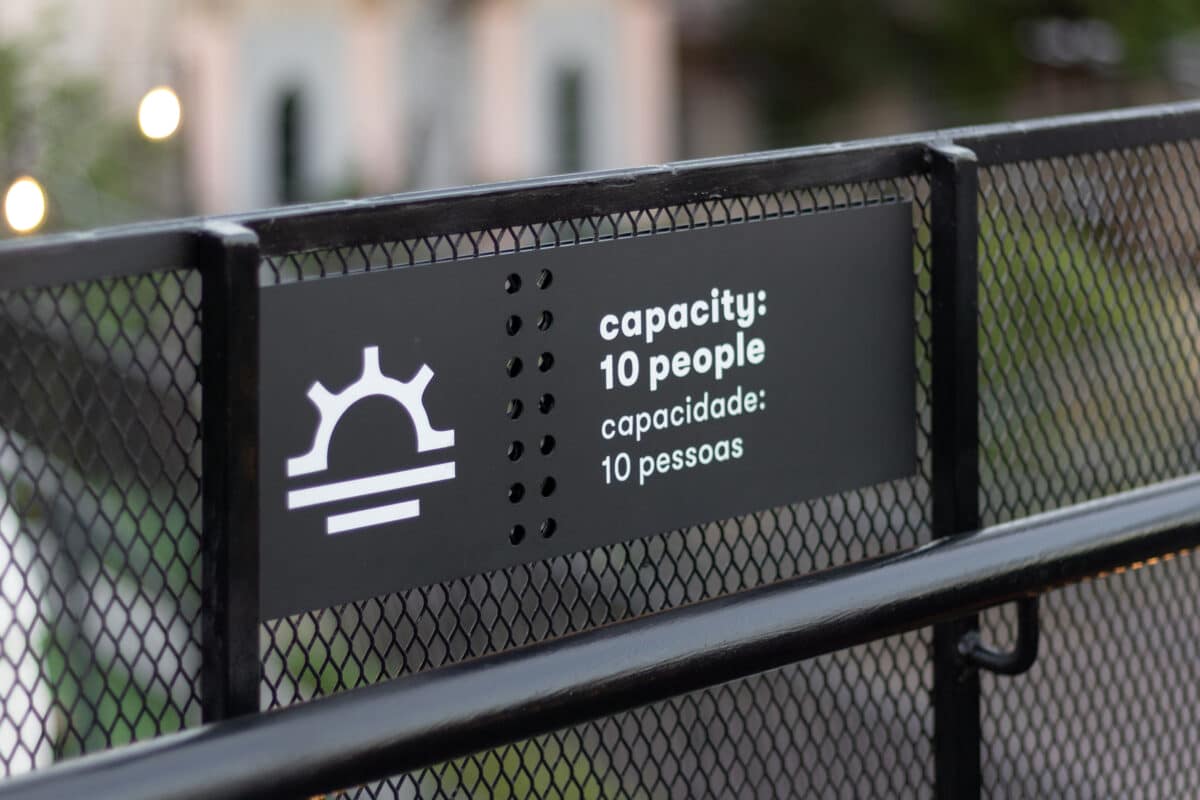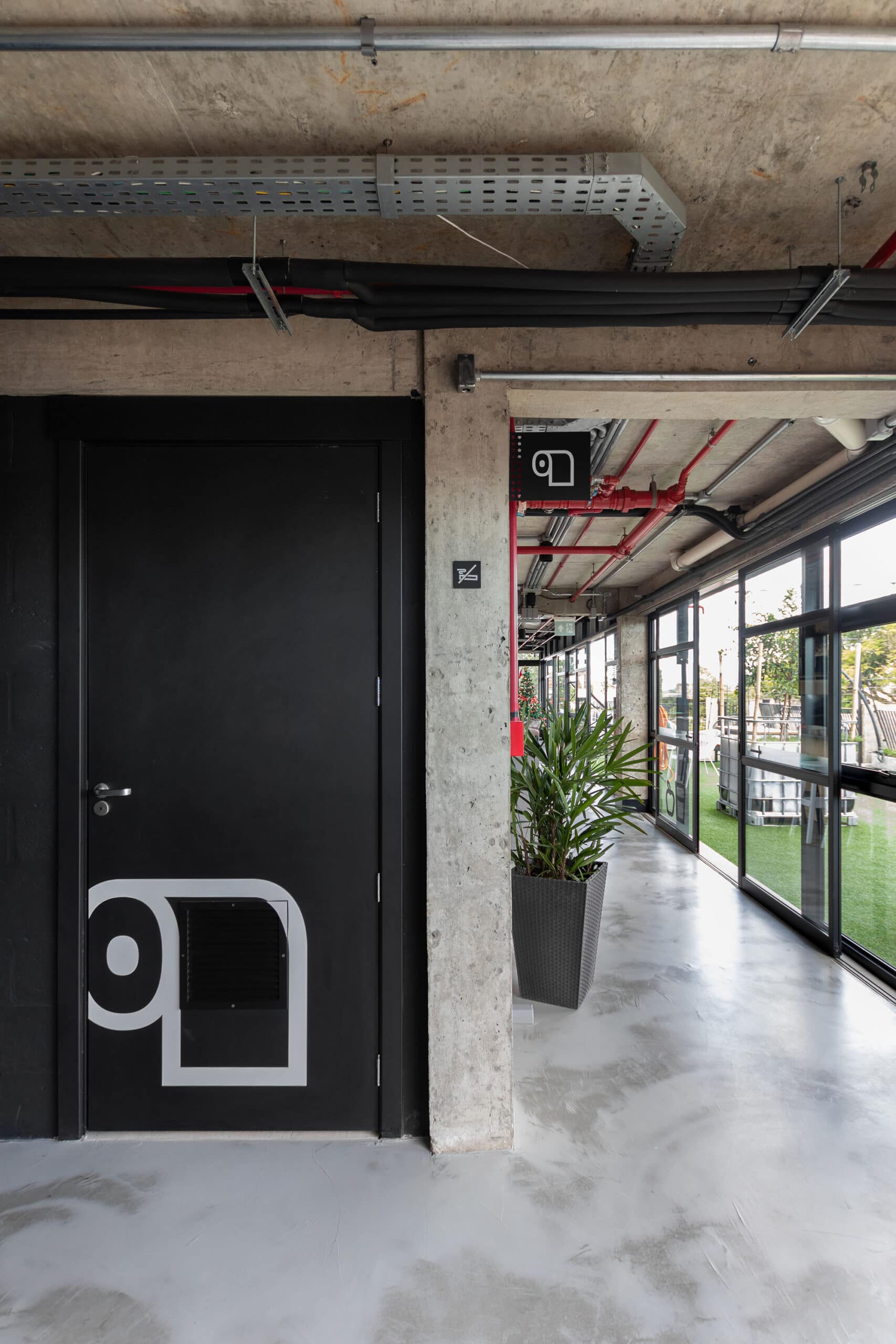 O desenho dos pictogramas tem base na tipografia, único material gráfico disponibilizado, exceto seu logotipo. O intuito foi não representar a figura humana, tornando o sistema inclusivo, utilizando somente objetos que representam cada espaço. Eles são a base da comunicação, informando a partir de símbolos, preservando a essência das mensagens. A sinalização se vale de elementos marcantes, poucos materiais e cores contrastantes. As ambientações e a codificação para os lockers foram criadas a partir de fragmentos dos pictogramas e somados a cores, trazendo uma solução interativa, permitindo o diálogo entre os espaços e seus ocupantes.